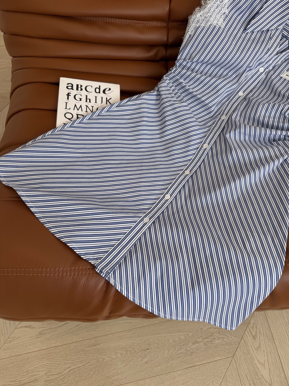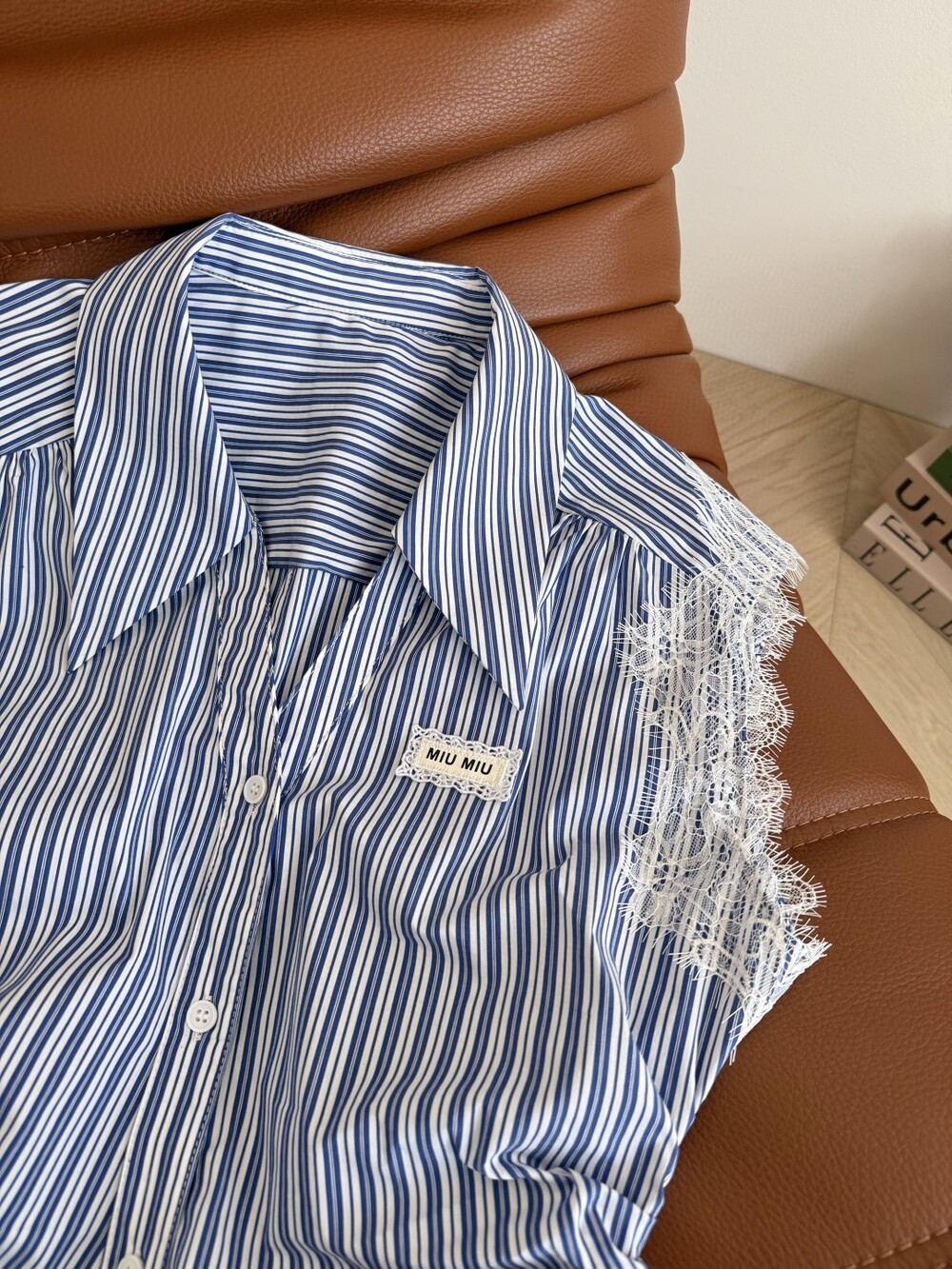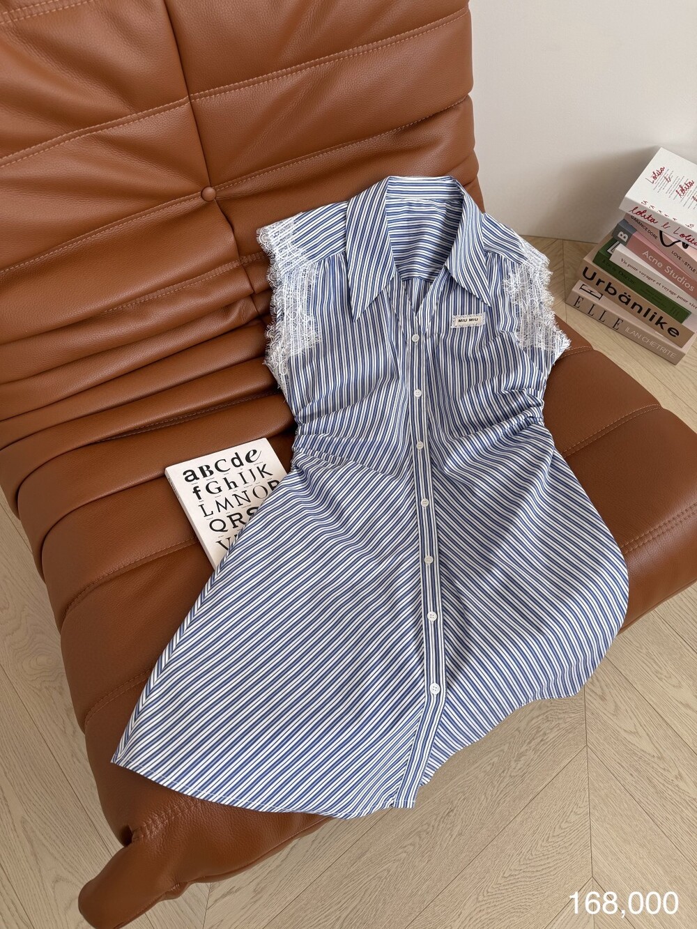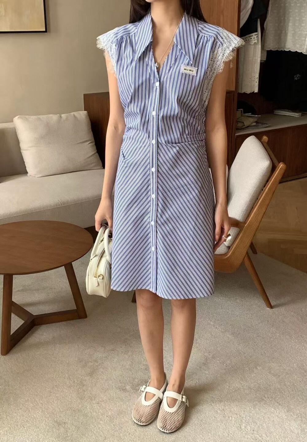 A. 뮤뮤 레이스 트리밍 스트라이프 셔츠 원피스