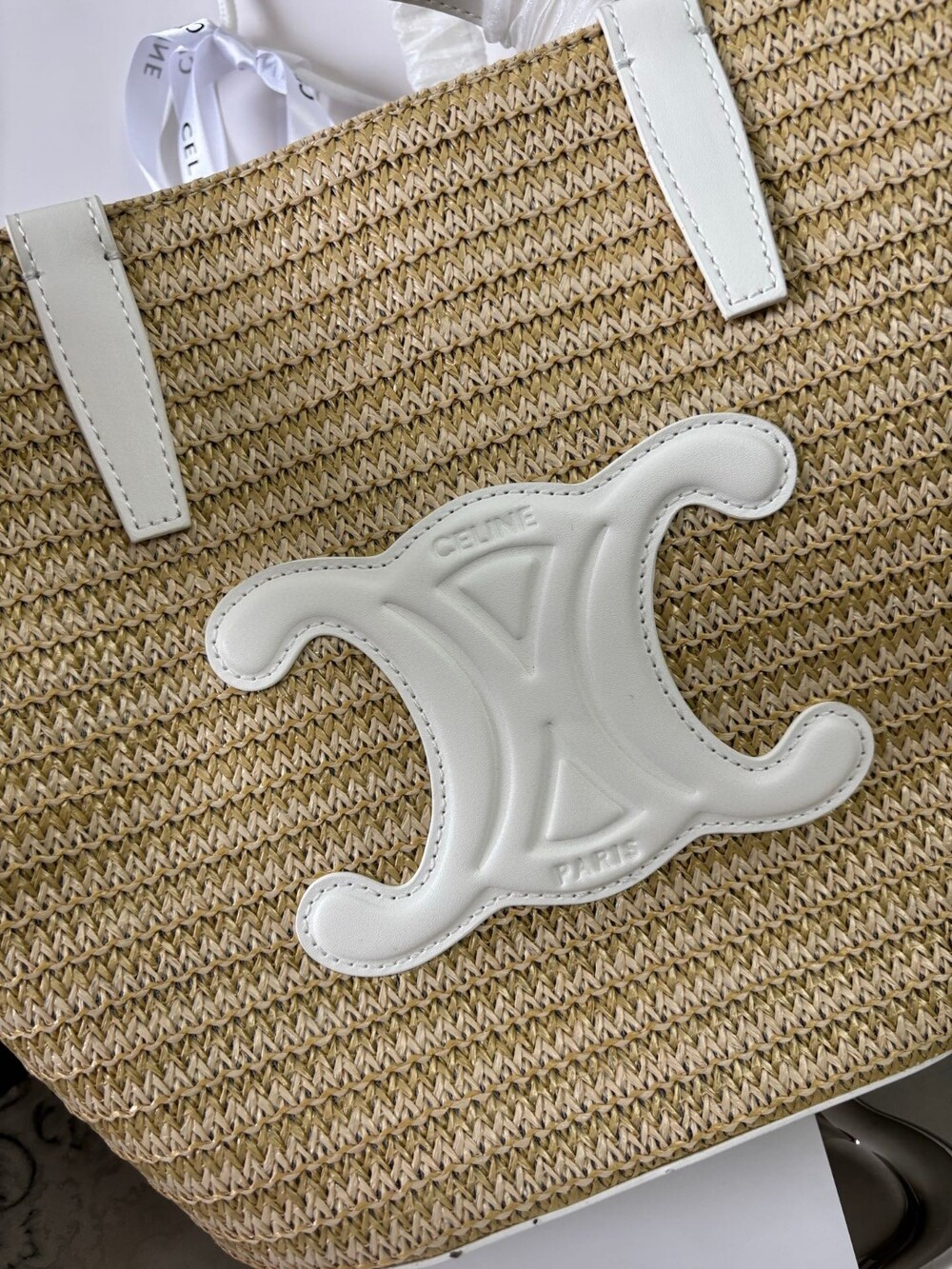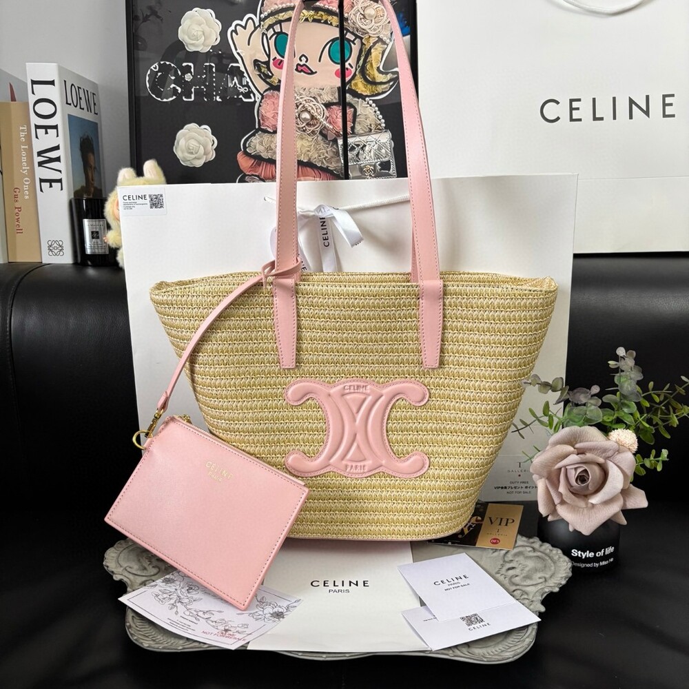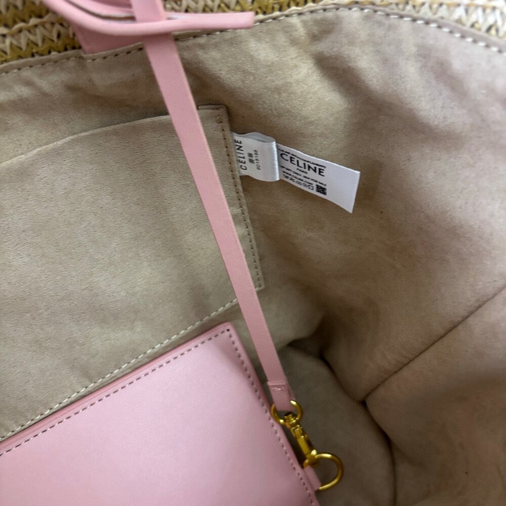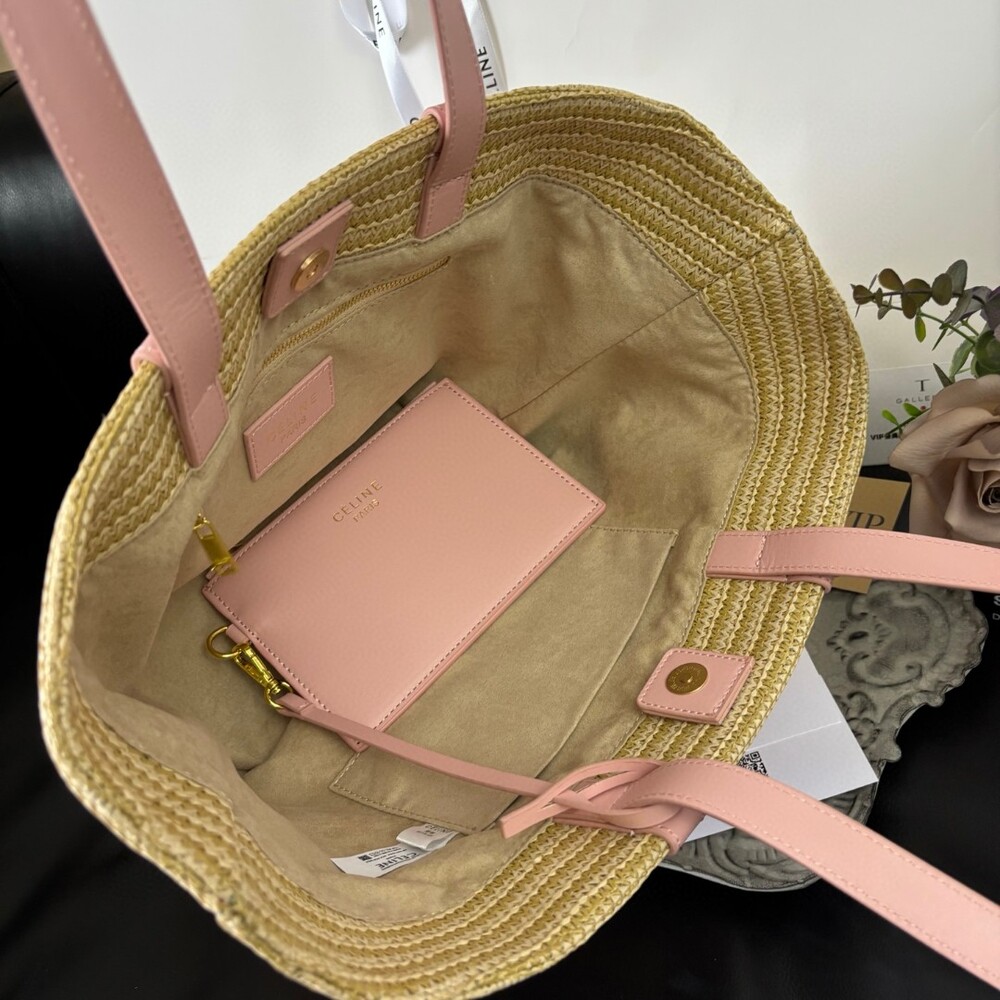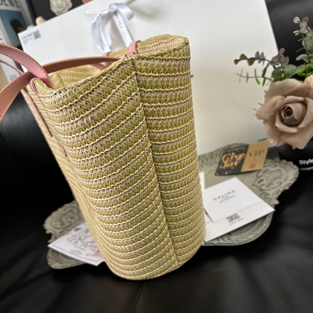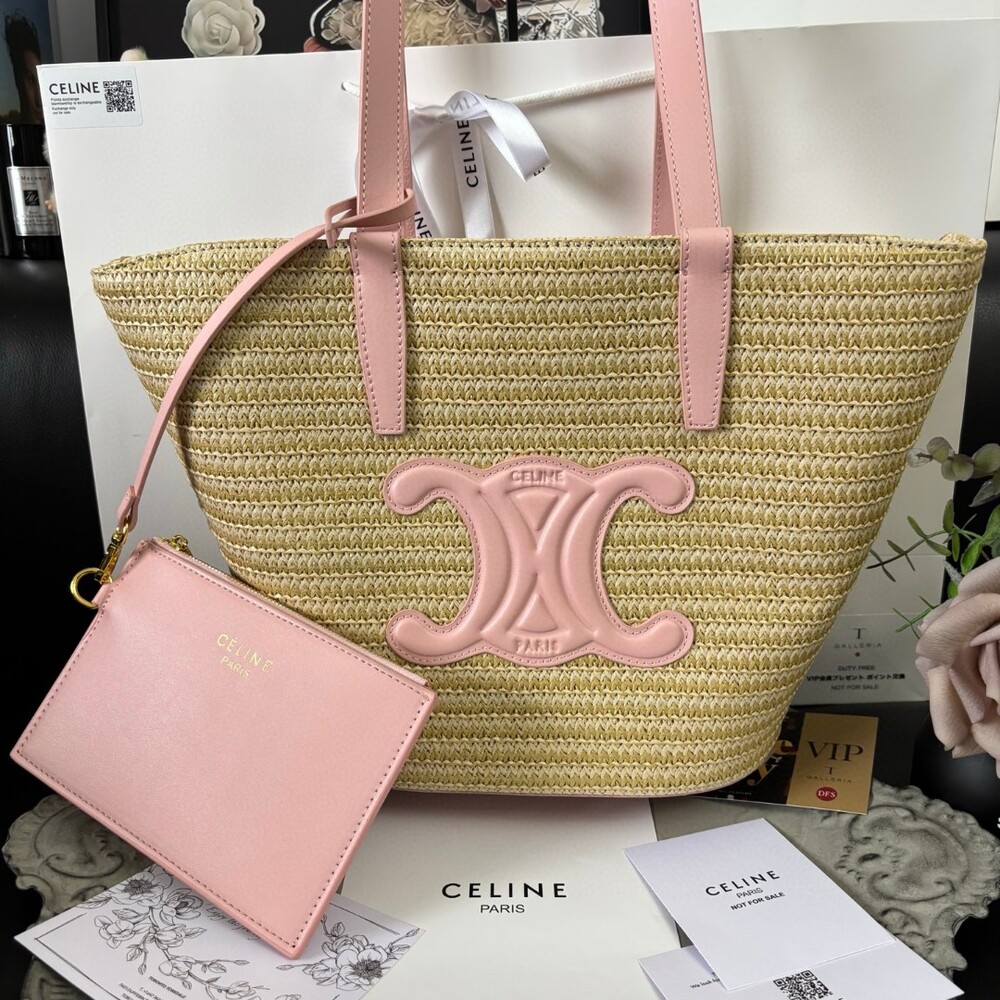 A dreamy summer piece from Celine — the Triomphe tote bag made of raffia and soft pink leather.