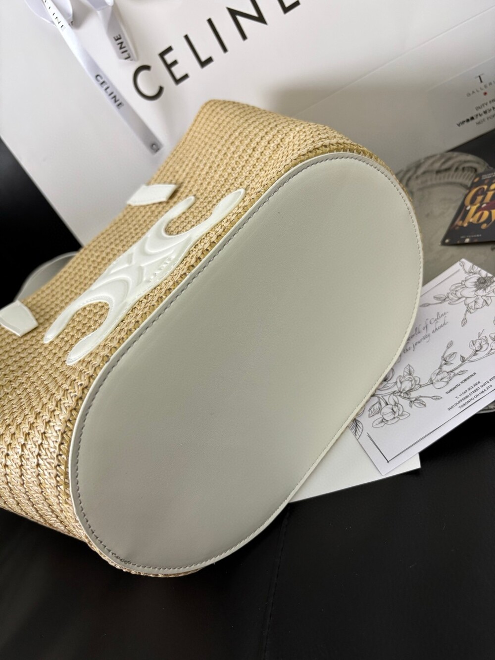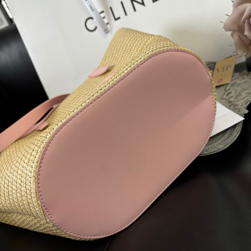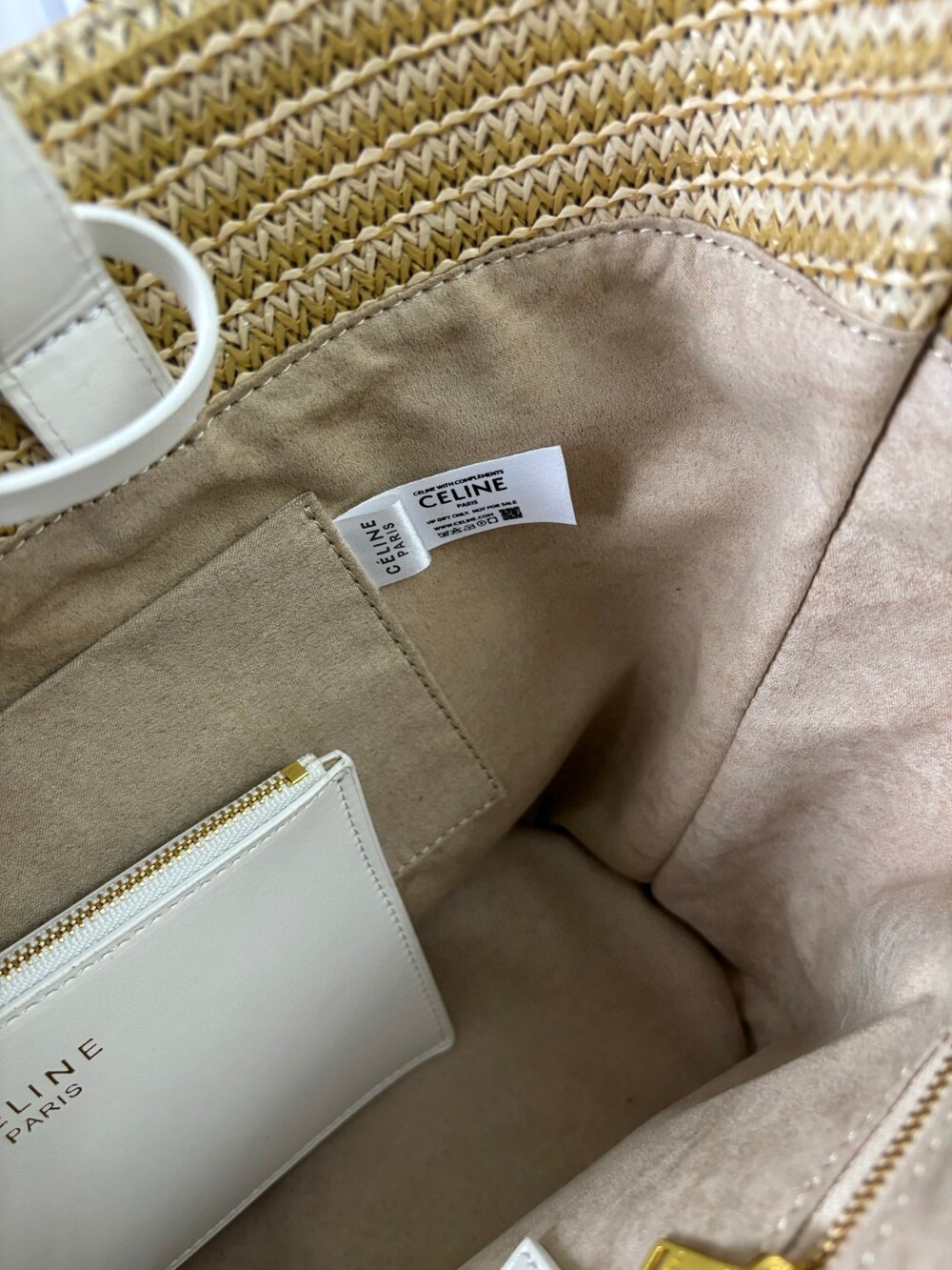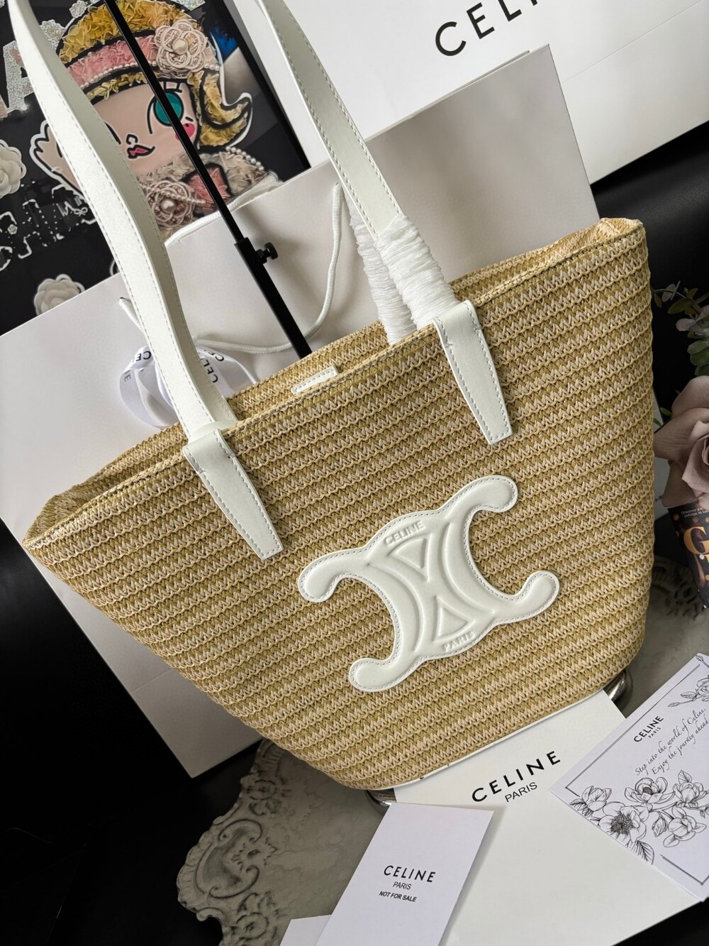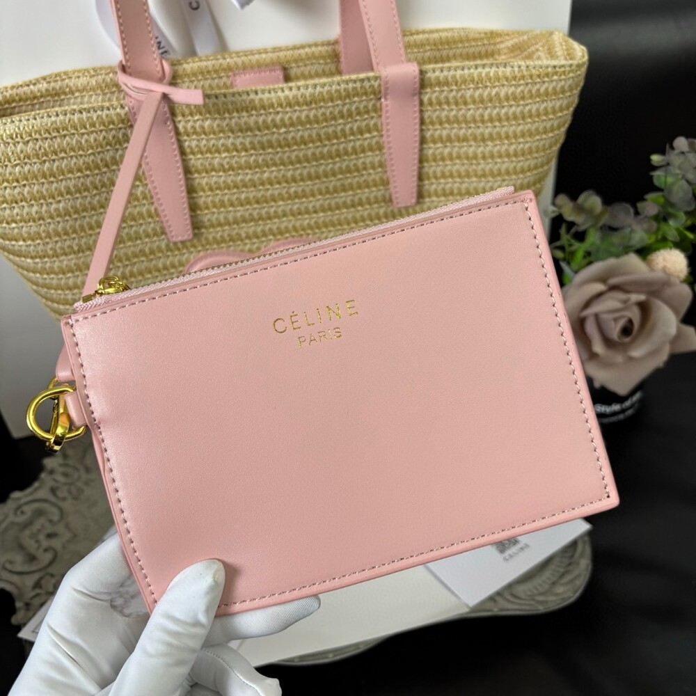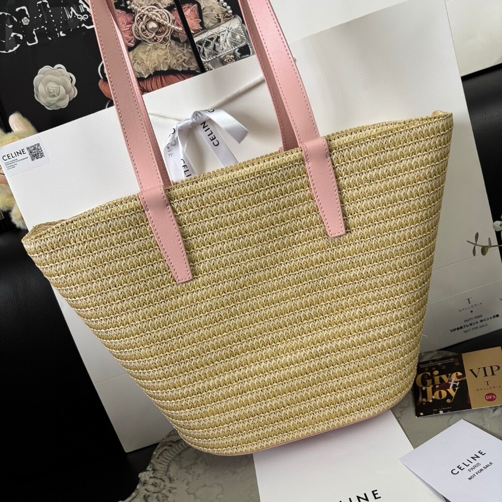 A dreamy summer piece from Celine — the Triomphe tote bag made of raffia and soft pink leather.