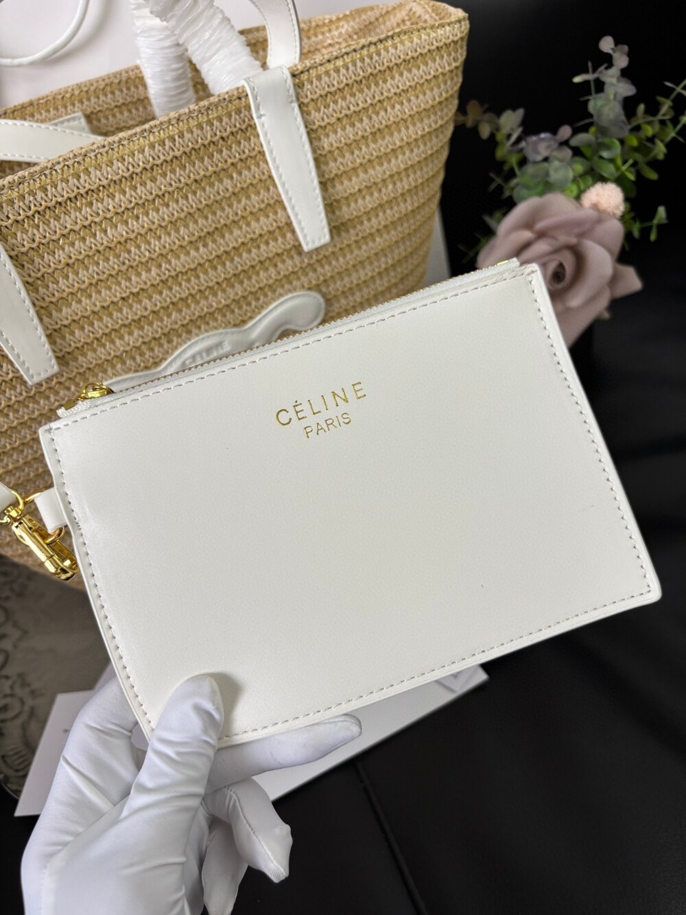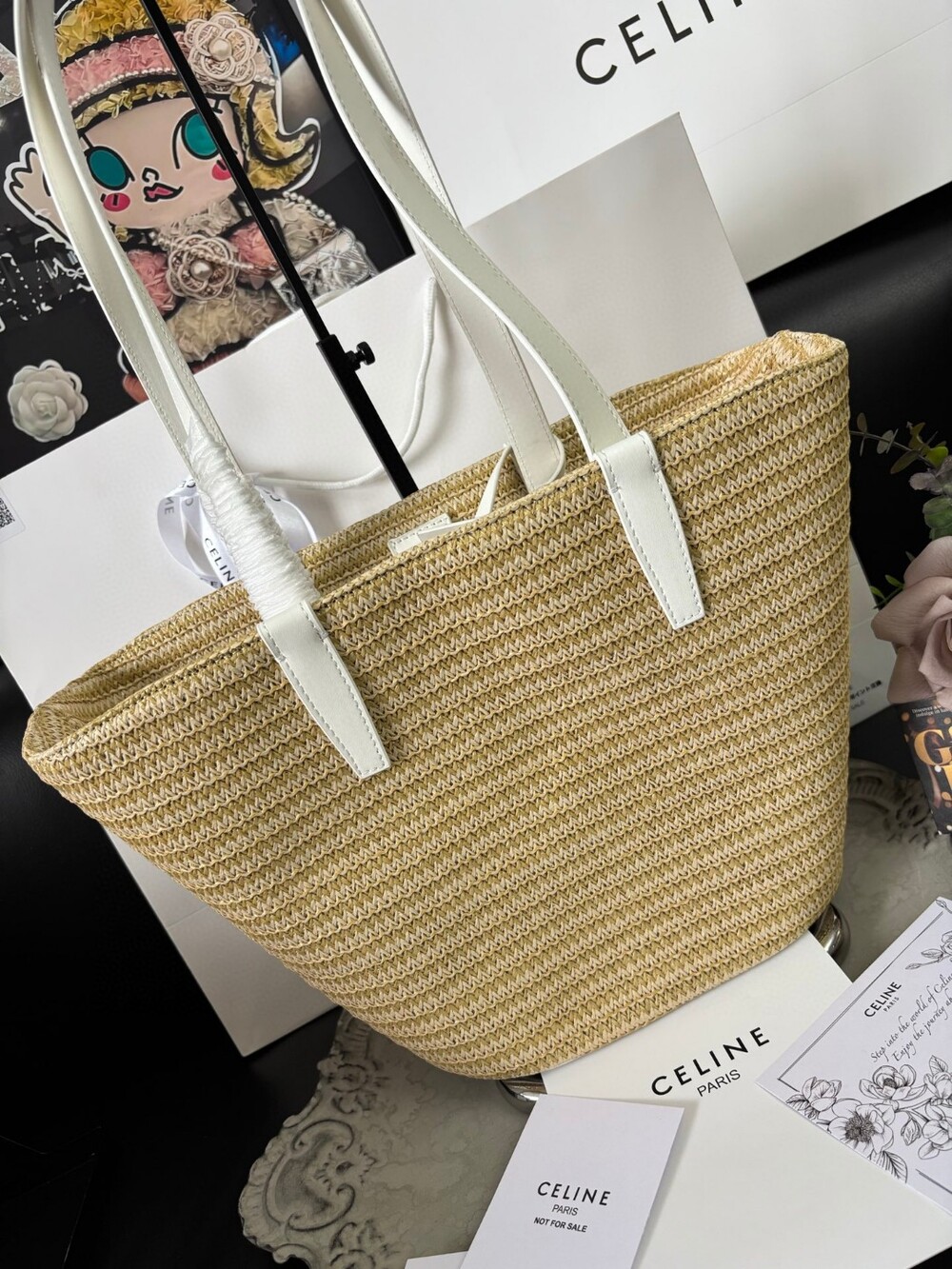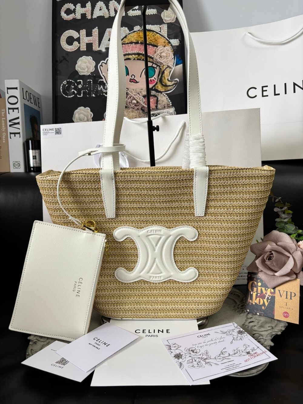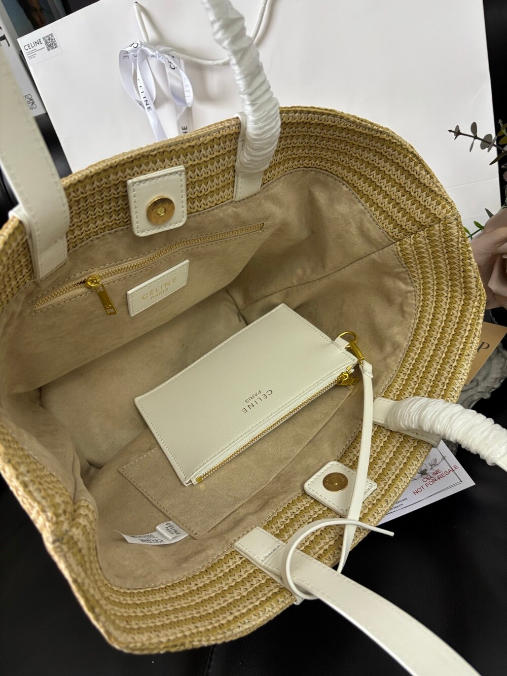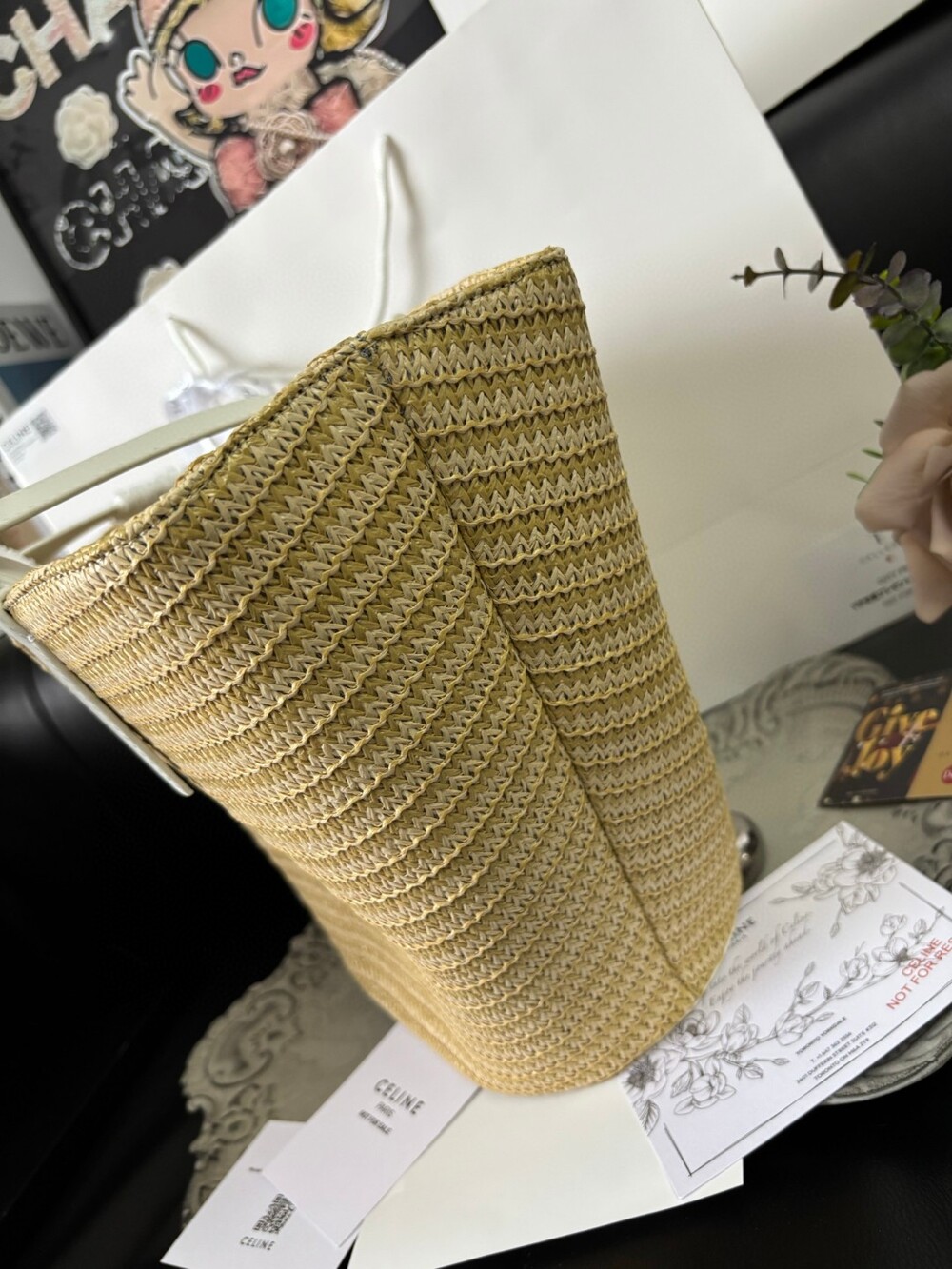 A dreamy summer piece from Celine — the Triomphe tote bag made of raffia and soft pink leather.