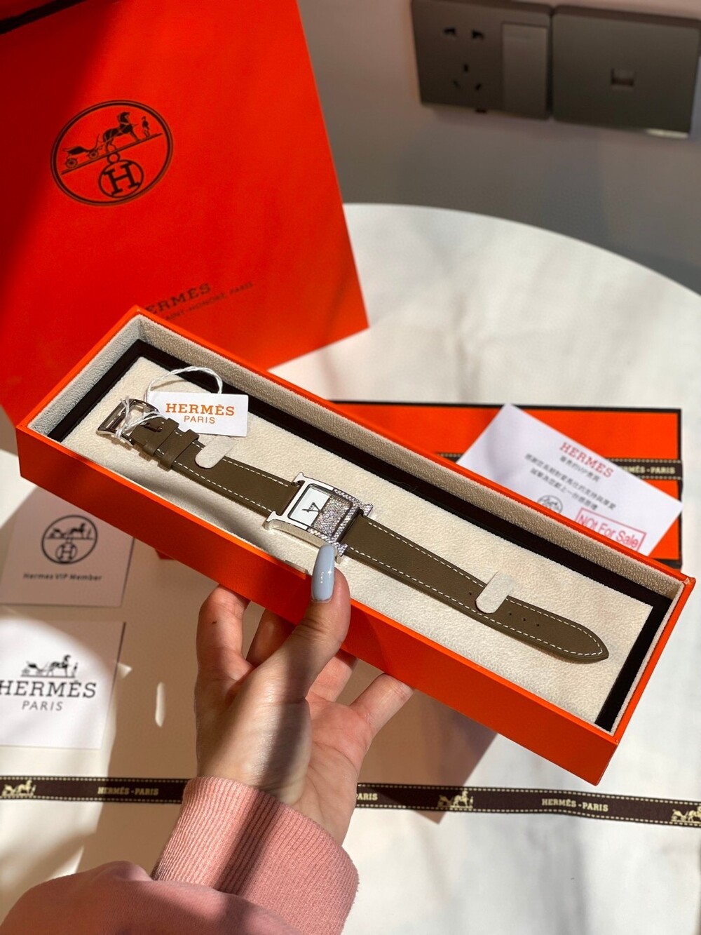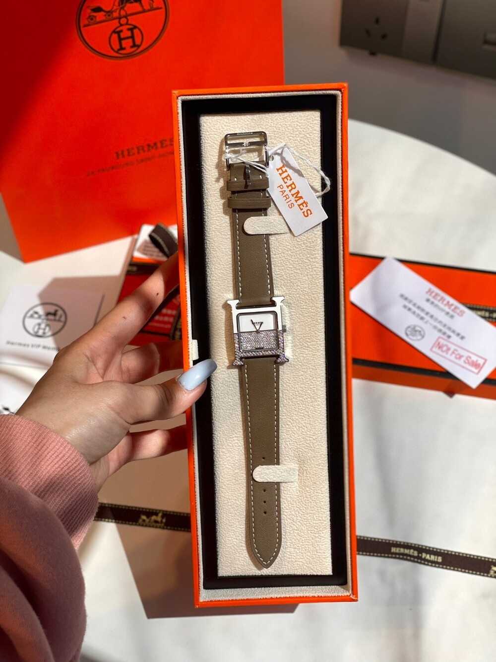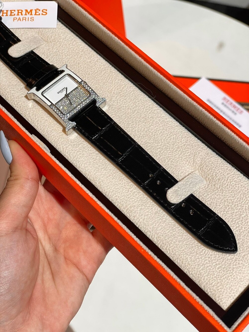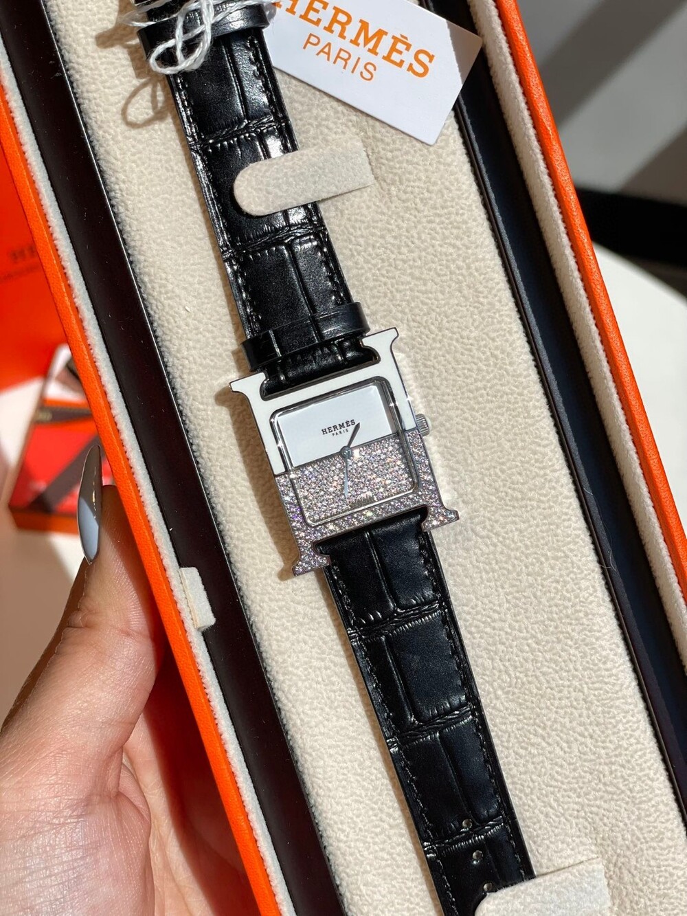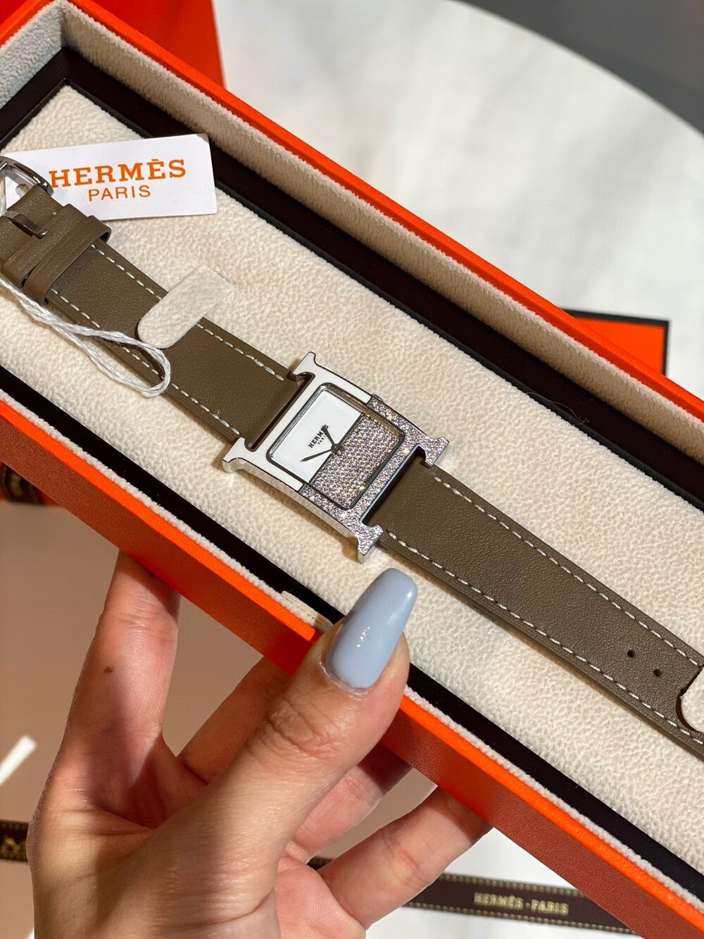 [Hermes VIP Fashion Week]HERMES Half Drill H WatchSize: 26mm (elephant ash)Sapphire Mirror ➕ Swarovski Diamond ➕ Swiss Imported MovementWhite natural shellfish dial, pure hand-polished inlaid diamond, sewing strap, bottom shell is also hand-carved badge relief