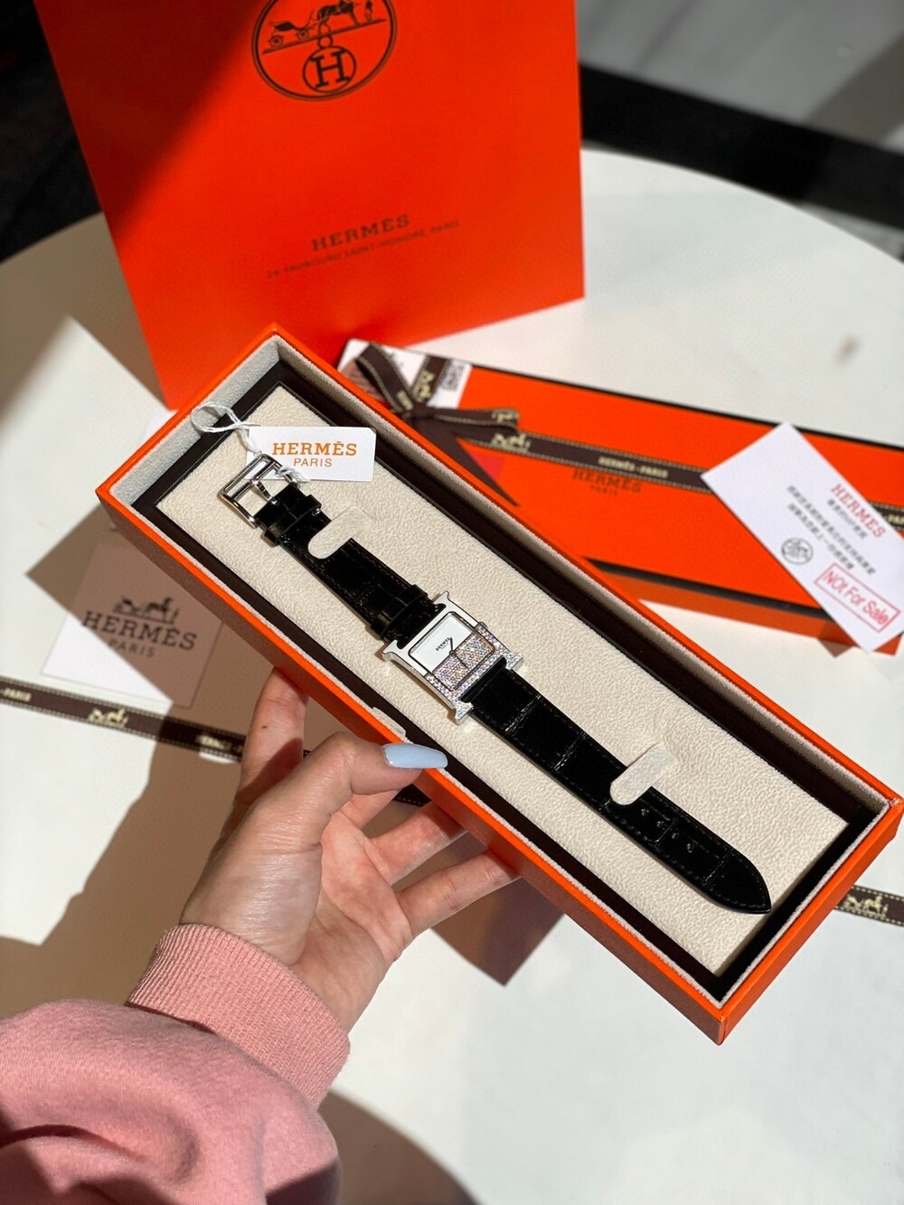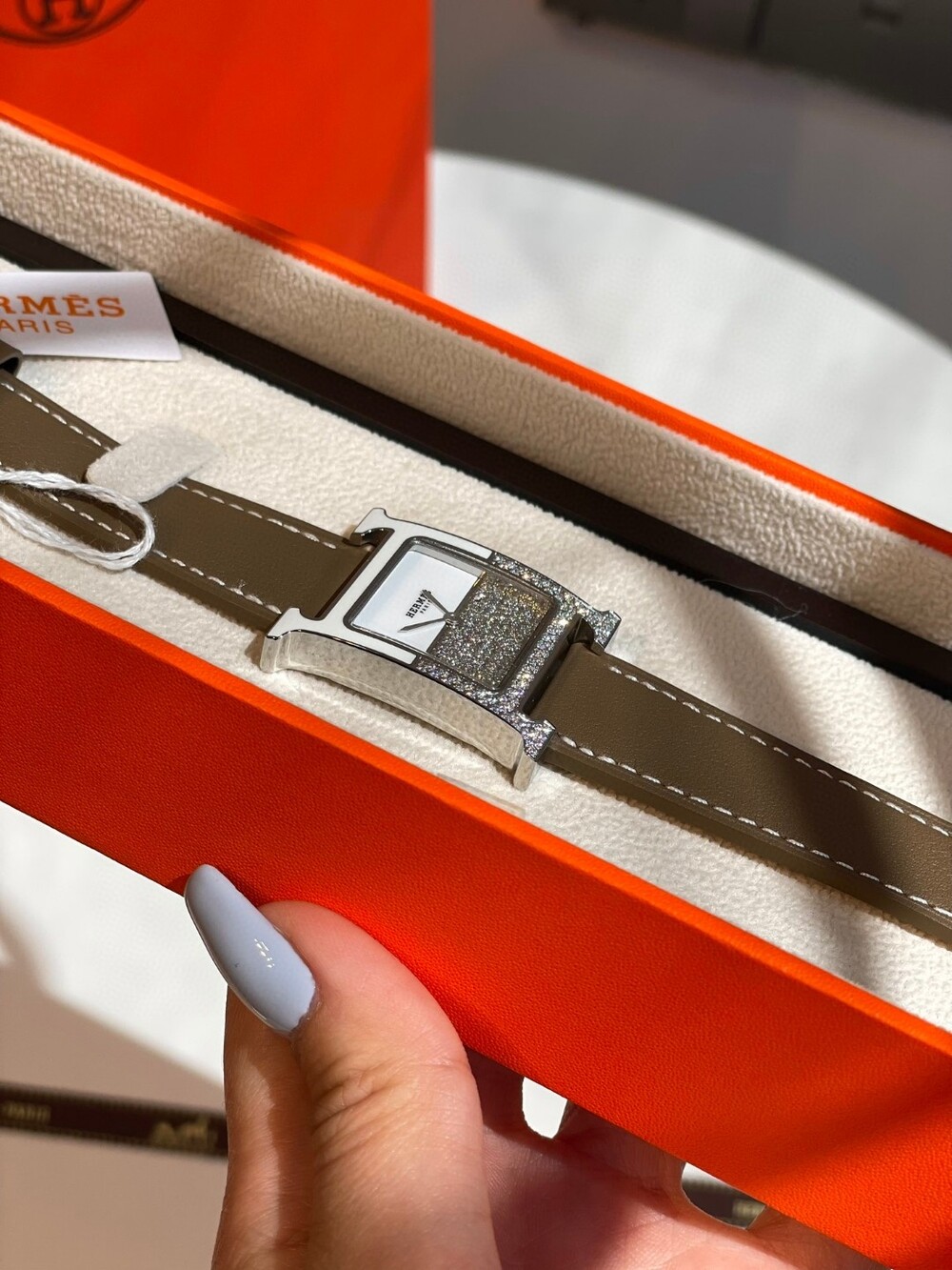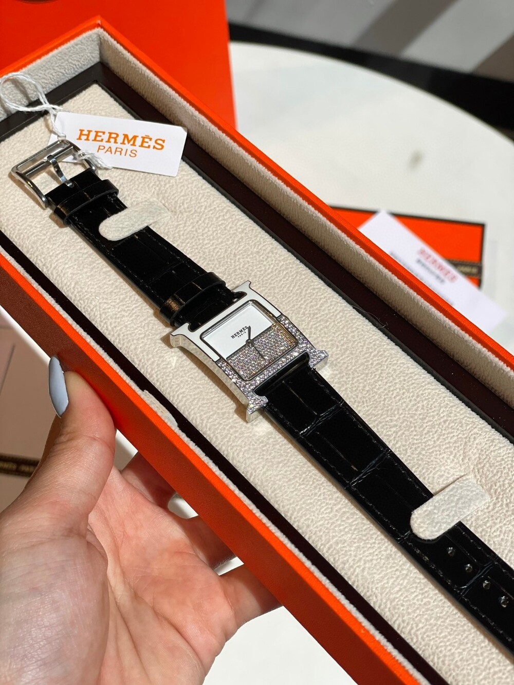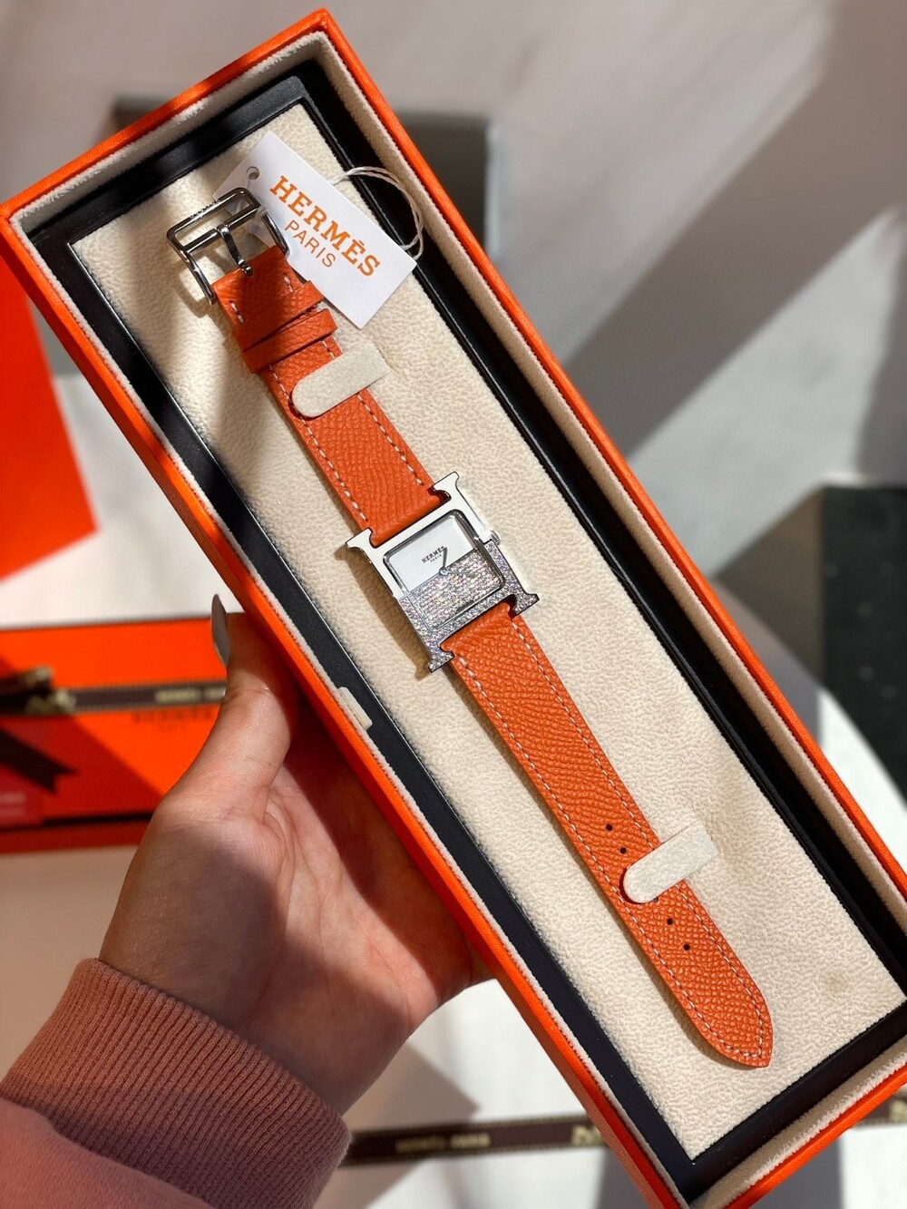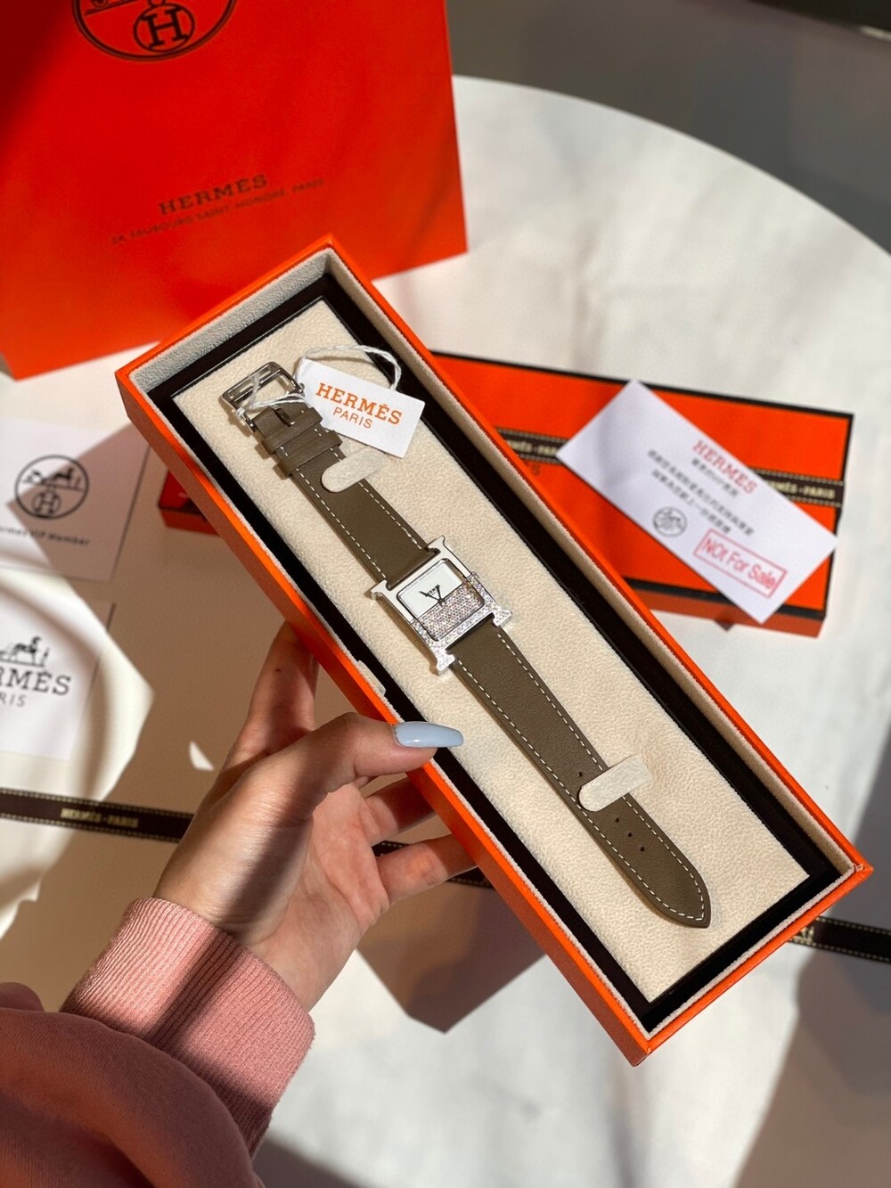 [Hermes VIP Fashion Week]HERMES Half Drill H WatchSize: 26mm (elephant ash)Sapphire Mirror ➕ Swarovski Diamond ➕ Swiss Imported MovementWhite natural shellfish dial, pure hand-polished inlaid diamond, sewing strap, bottom shell is also hand-carved badge relief