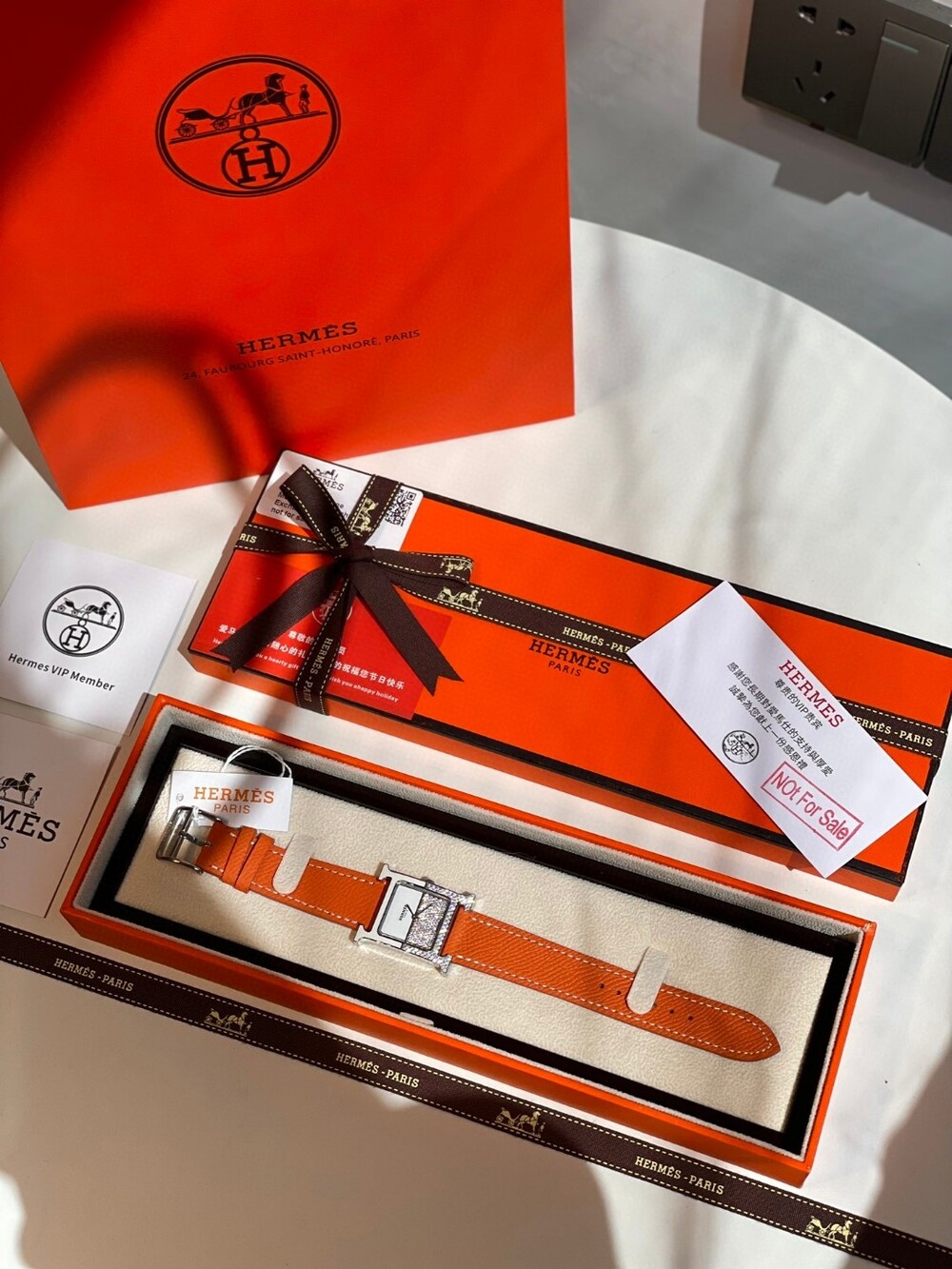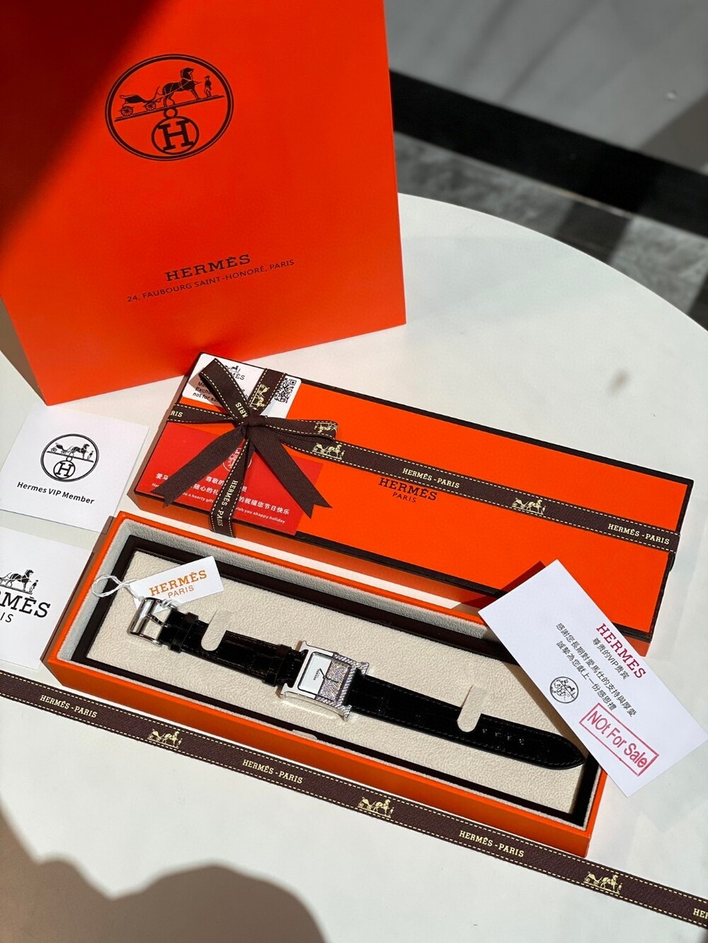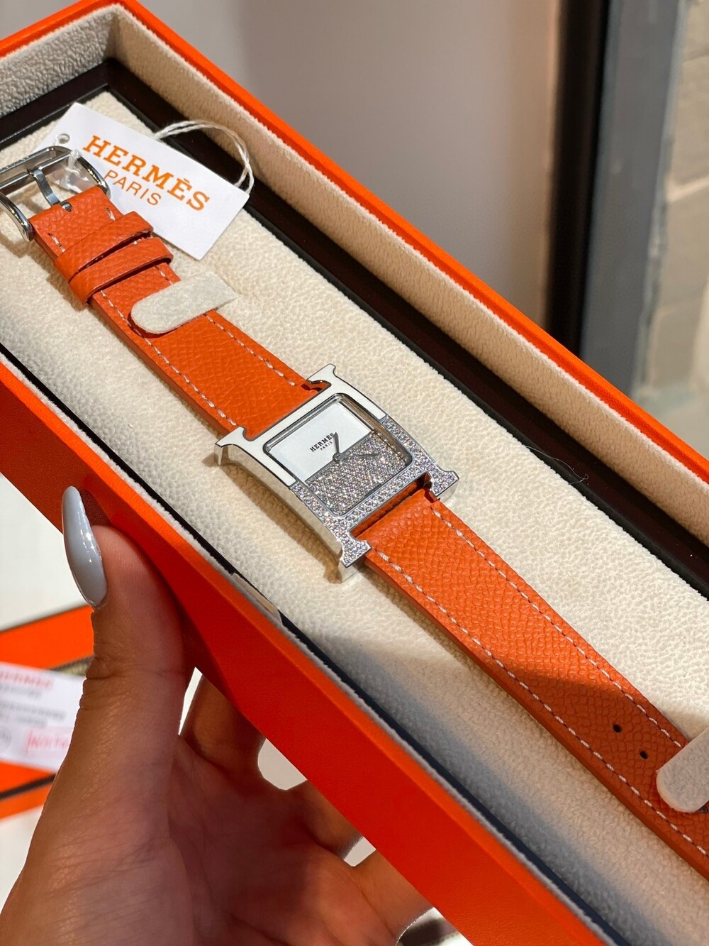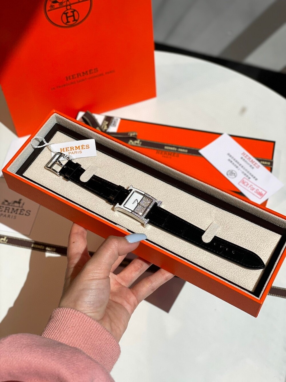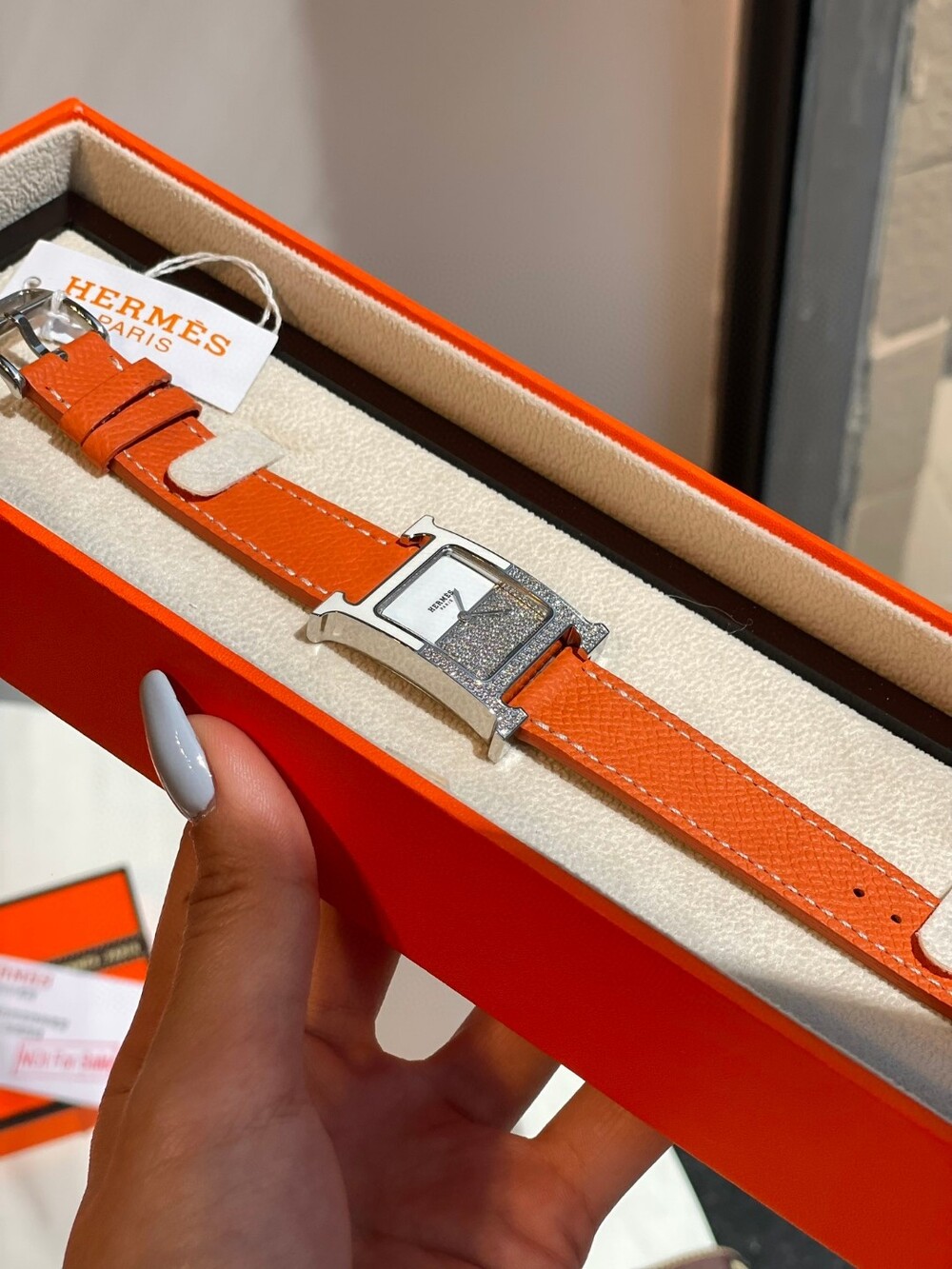 [Hermes VIP Fashion Week]HERMES Half Drill H WatchSize: 26mm (elephant ash)Sapphire Mirror ➕ Swarovski Diamond ➕ Swiss Imported MovementWhite natural shellfish dial, pure hand-polished inlaid diamond, sewing strap, bottom shell is also hand-carved badge relief