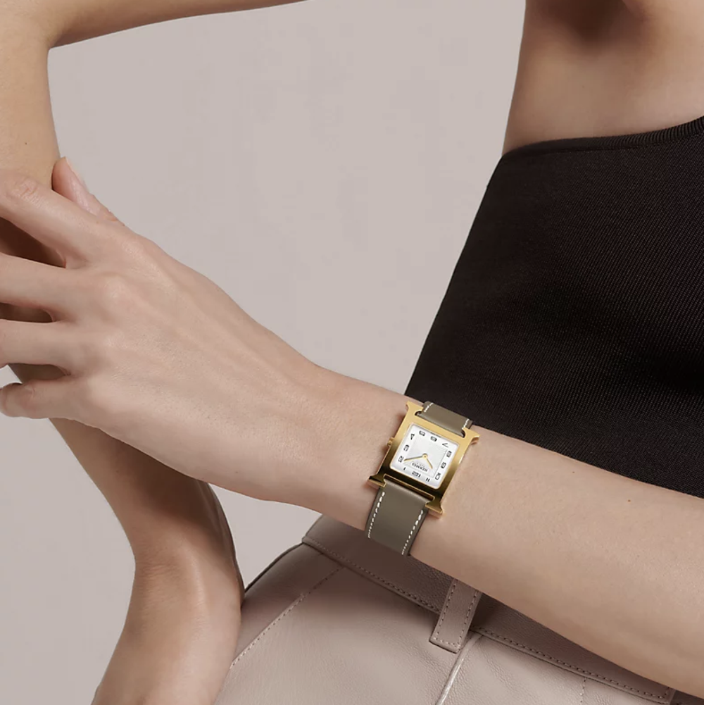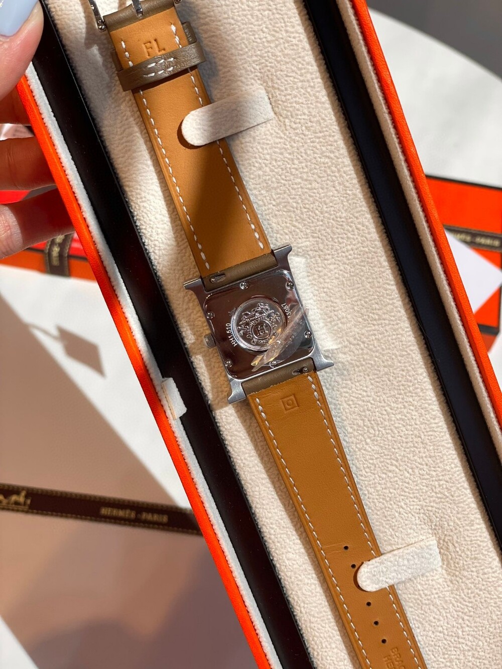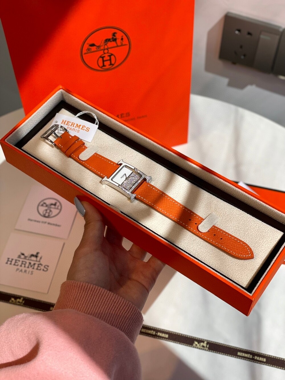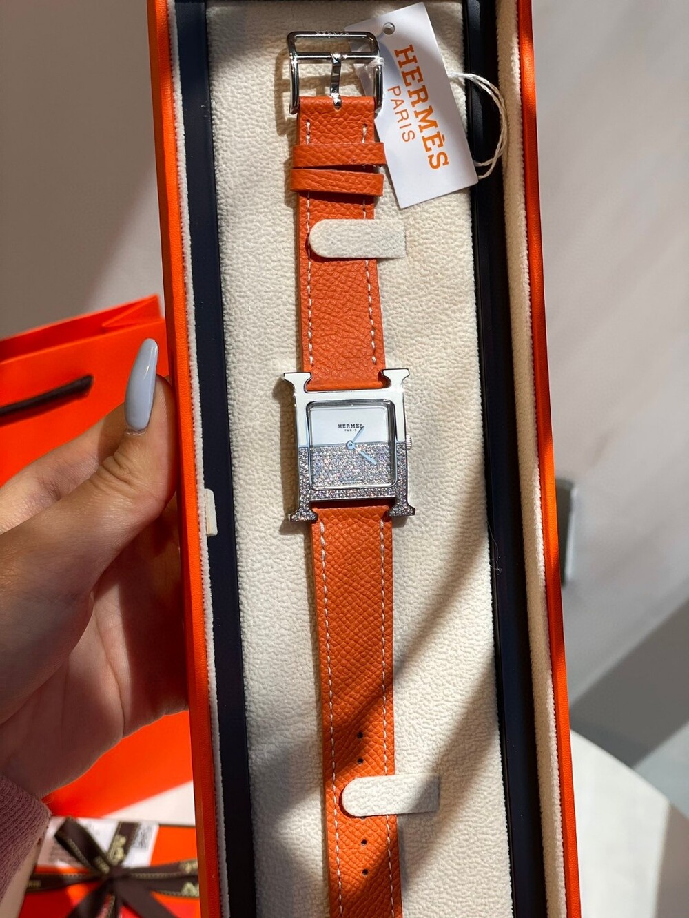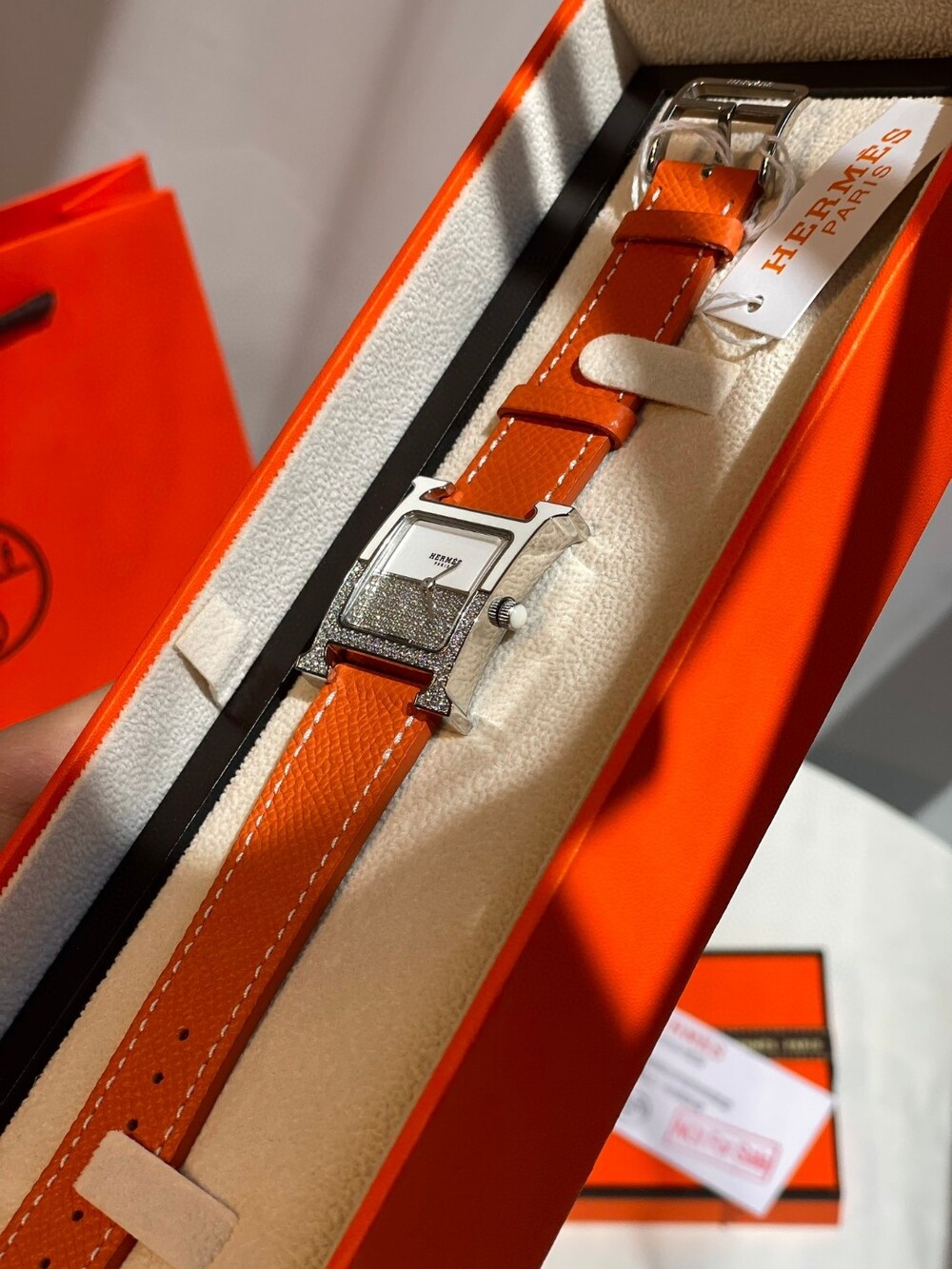 [Hermes VIP Fashion Week]HERMES Half Drill H WatchSize: 26mm (elephant ash)Sapphire Mirror ➕ Swarovski Diamond ➕ Swiss Imported MovementWhite natural shellfish dial, pure hand-polished inlaid diamond, sewing strap, bottom shell is also hand-carved badge relief