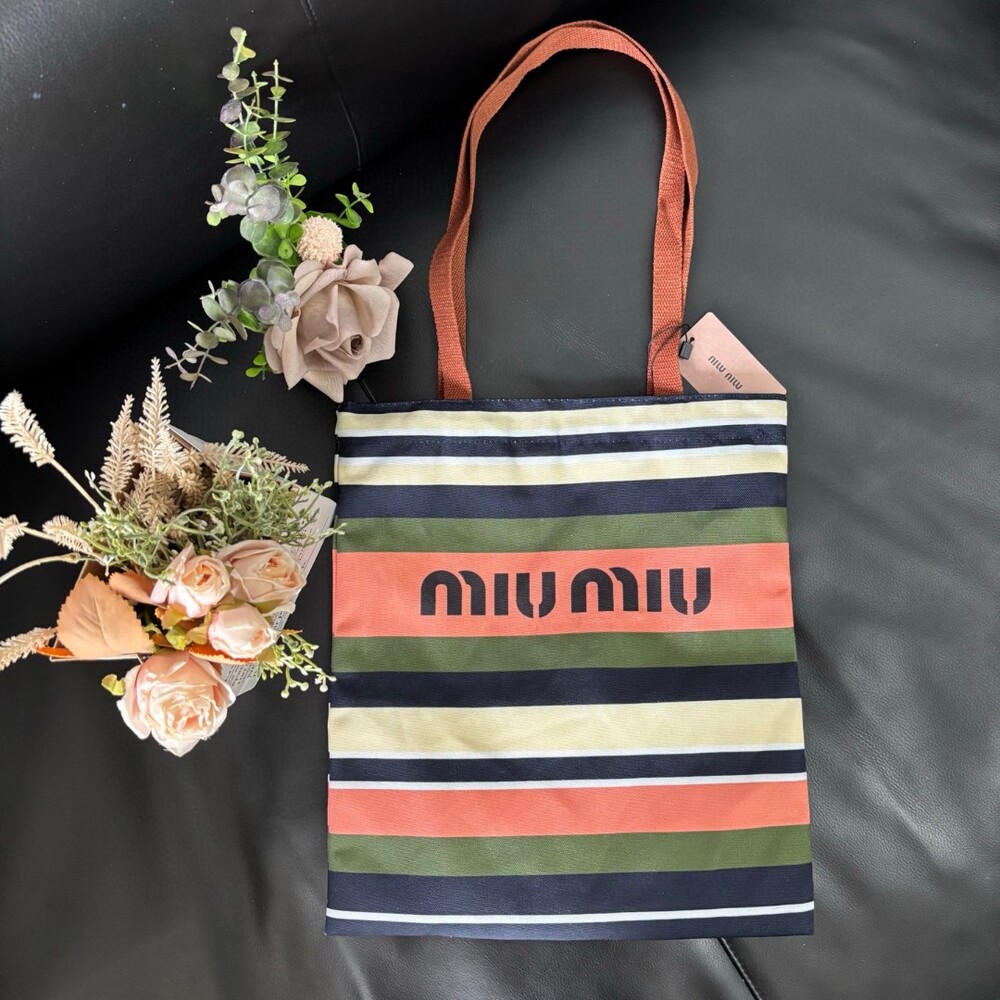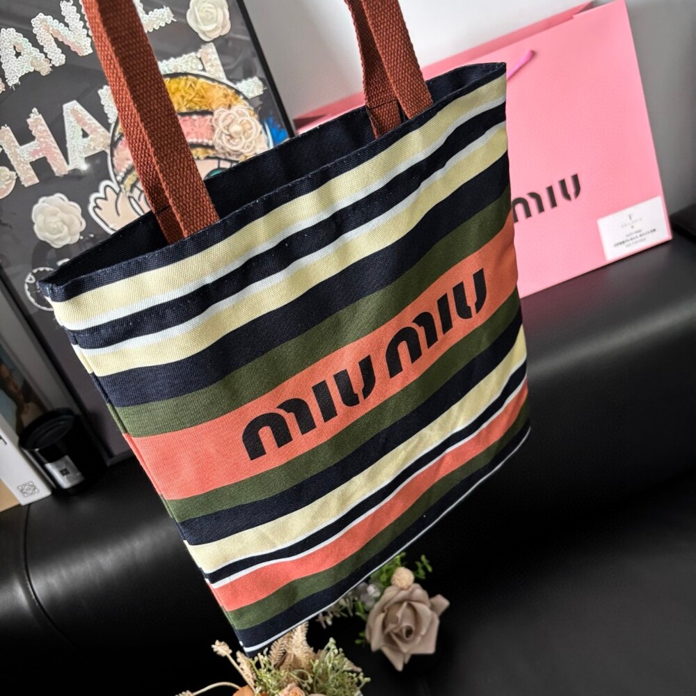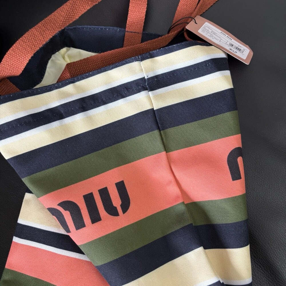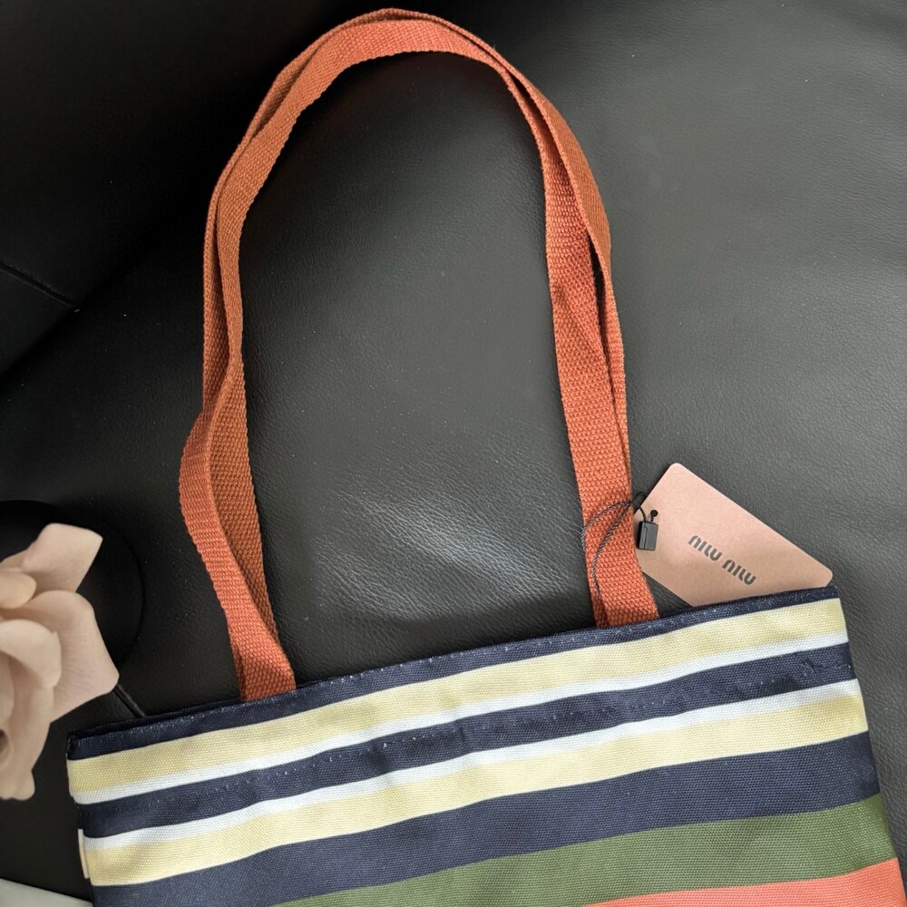 A Miu Miu striped canvas tote that effortlessly blends retro charm with everyday practicality.