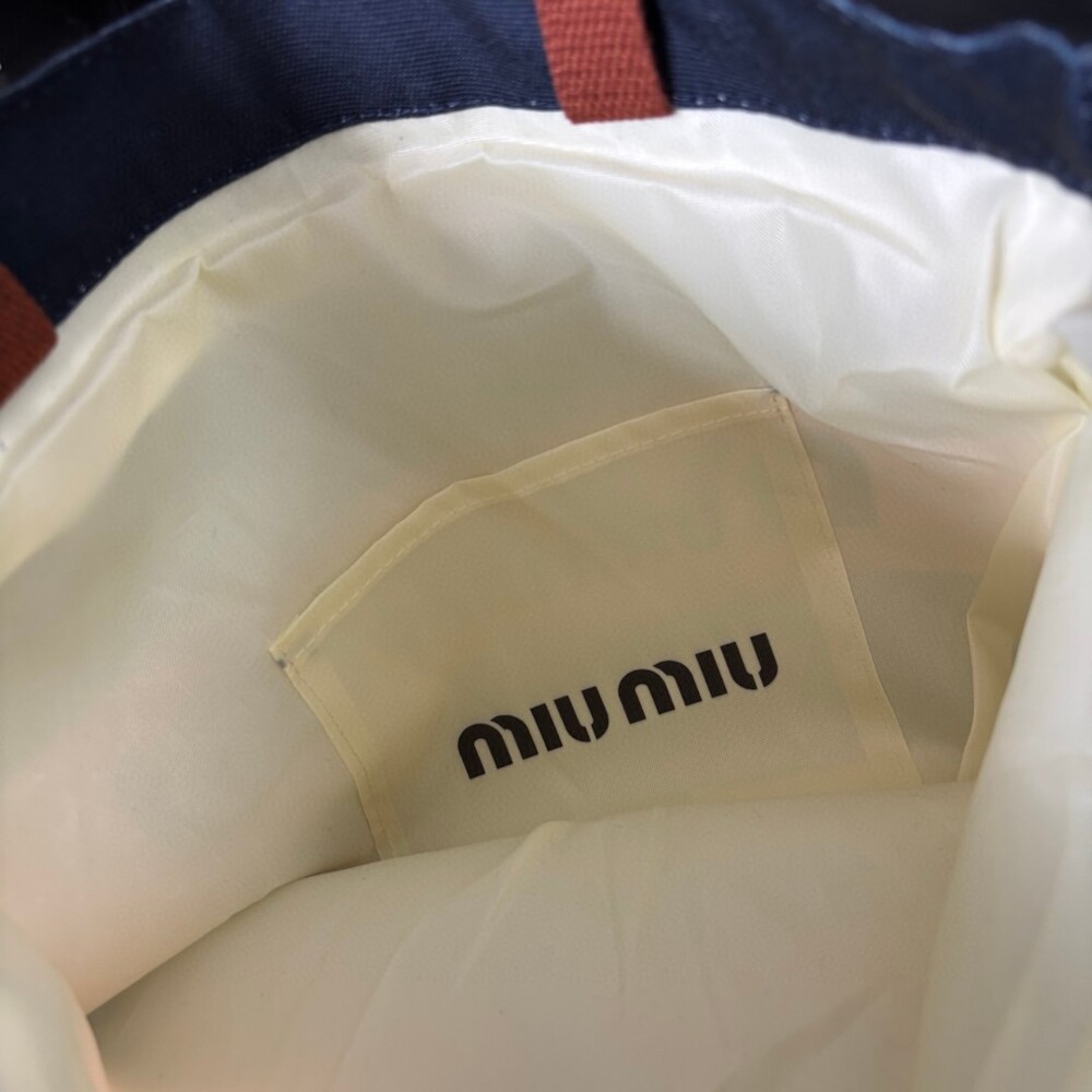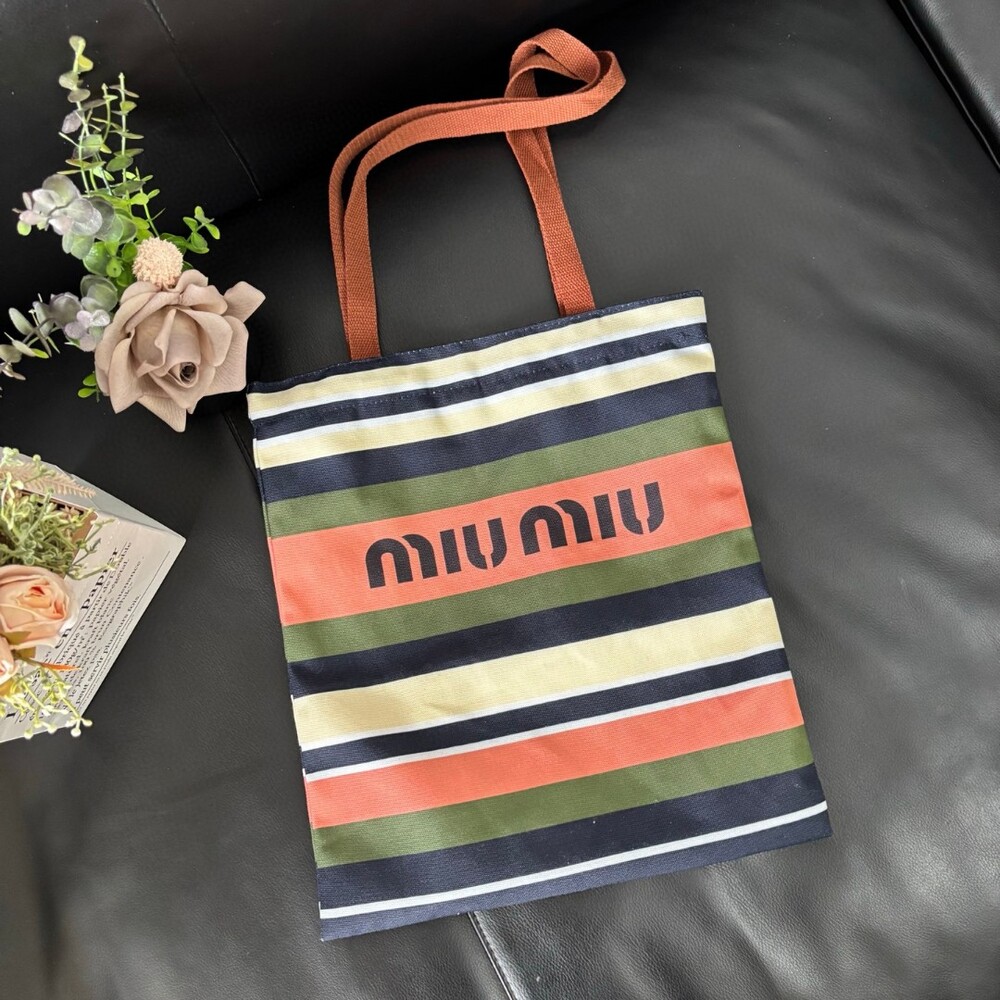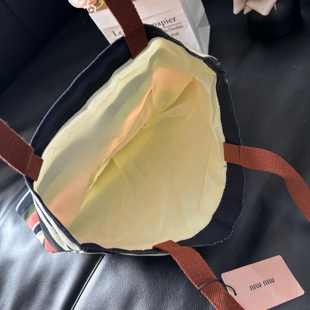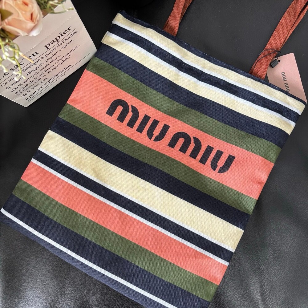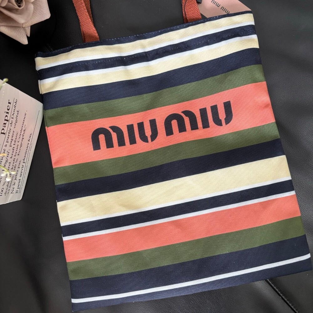 A Miu Miu striped canvas tote that effortlessly blends retro charm with everyday practicality.