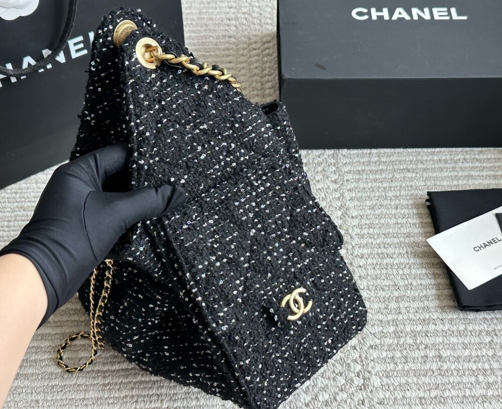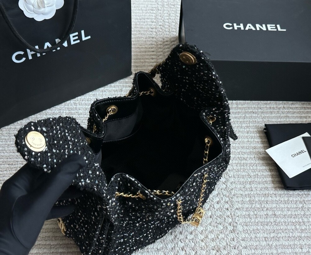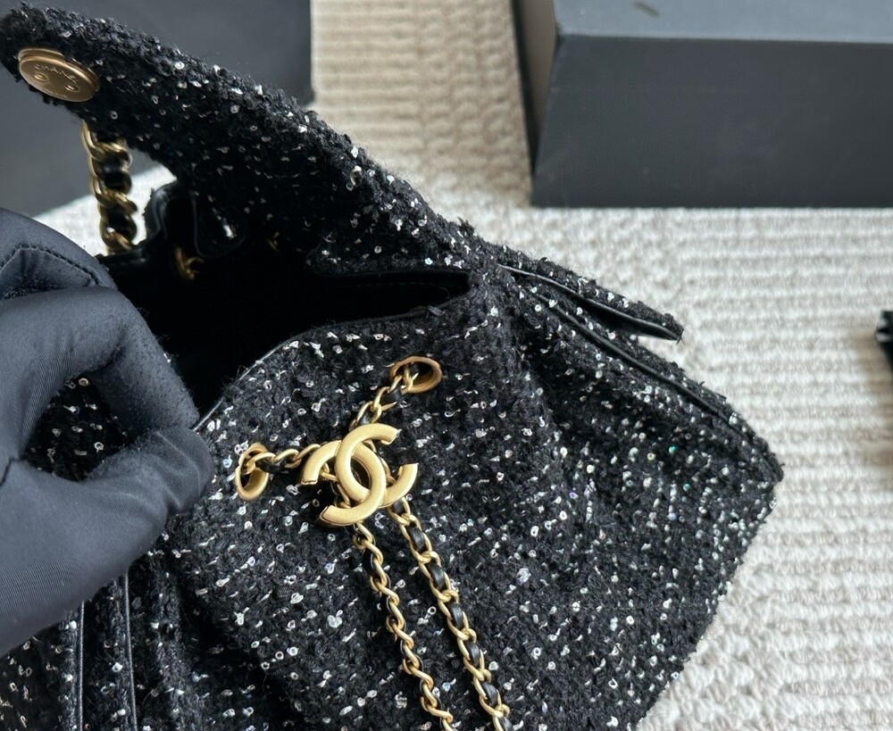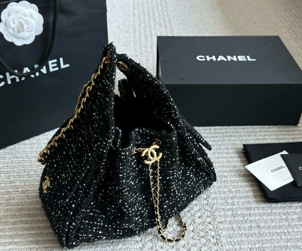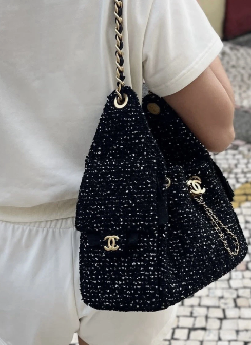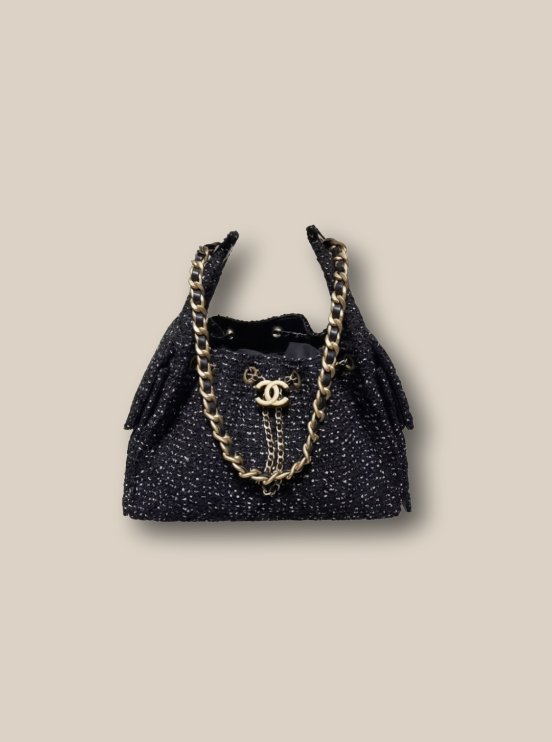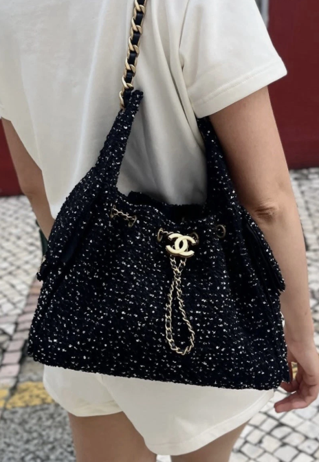 while the iconic interlaced gold chain and CC charm add that unmistakable CHANEL touch.