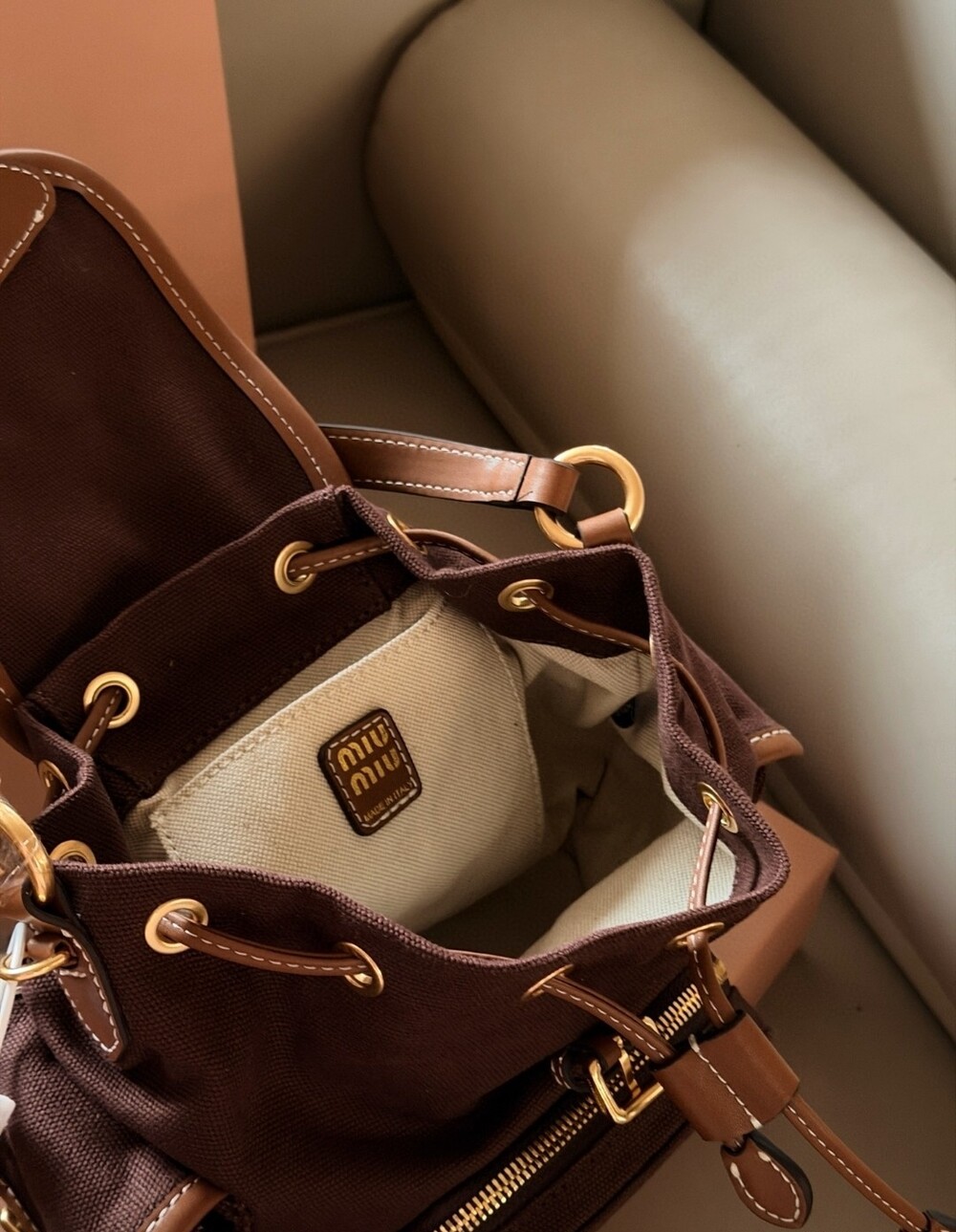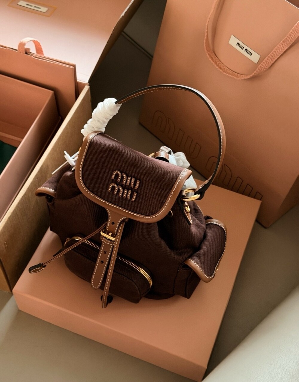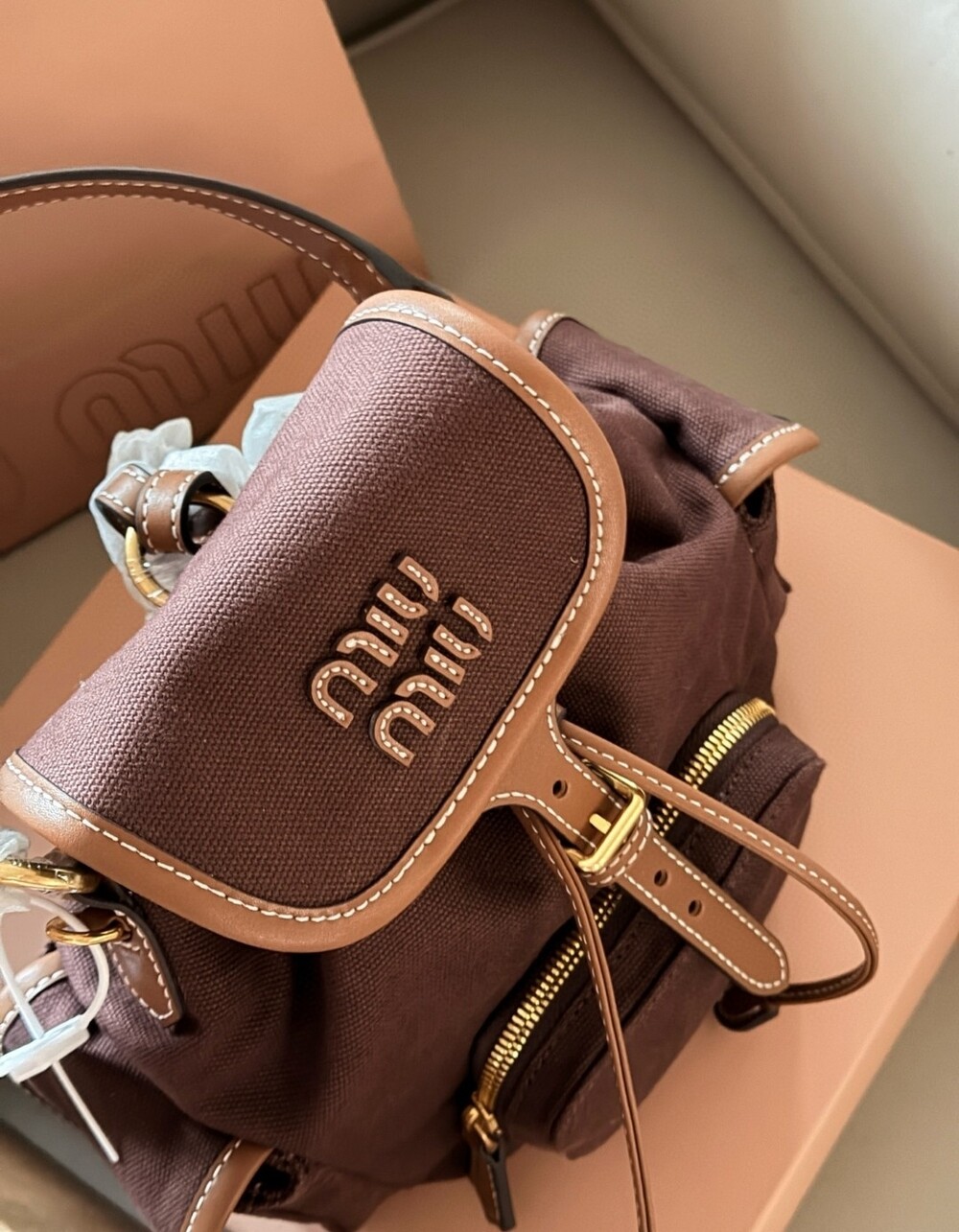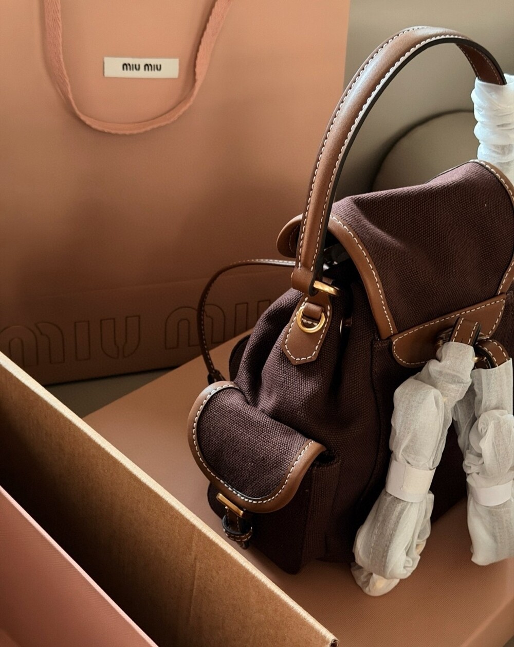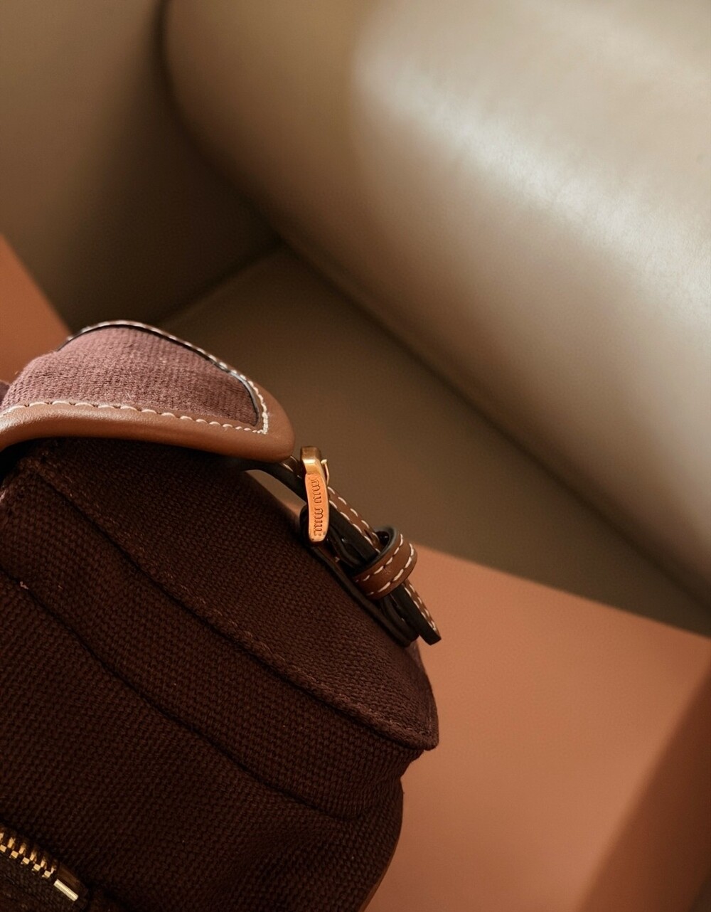 MIU MIU 로고 디테일과 스티치, 골드 하드웨어가 더해져