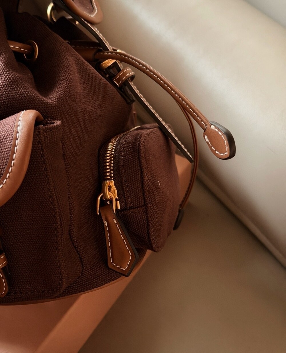 텍스처가 느껴지는 원단에 레더 트리밍,플랩에 들어간