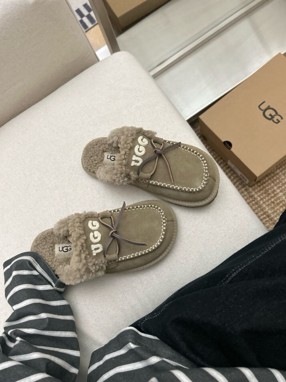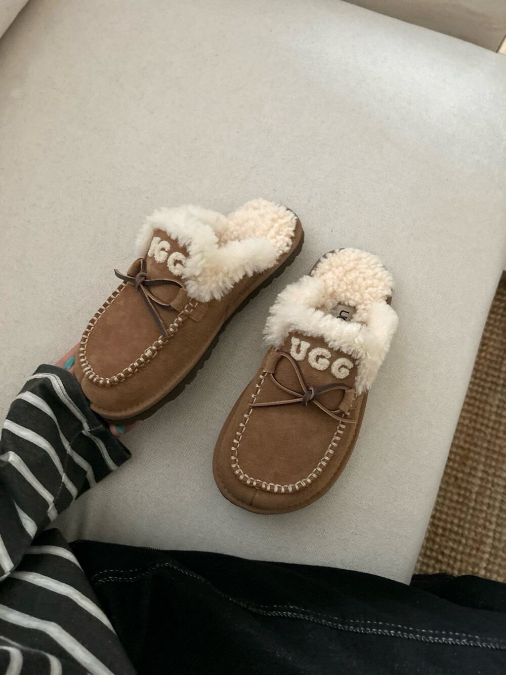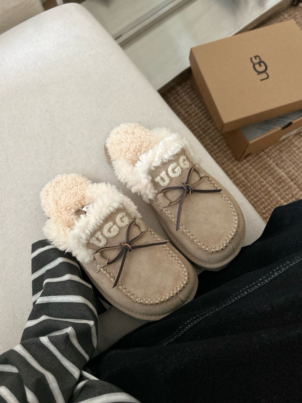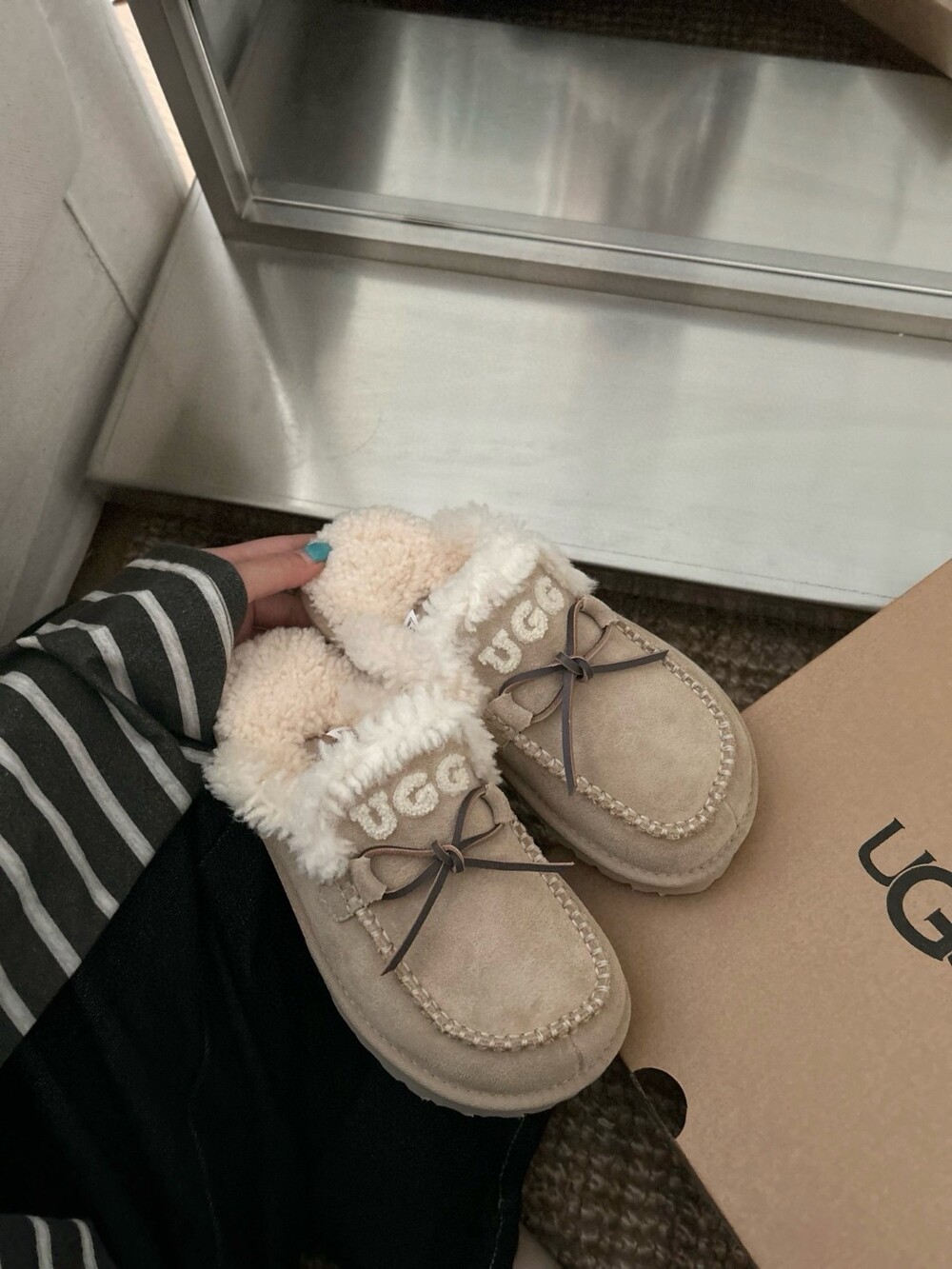 귀여운 리본🎀 디테일과 UGG 로고 자수가 포인트인 포근한 양모 슬리퍼예요.