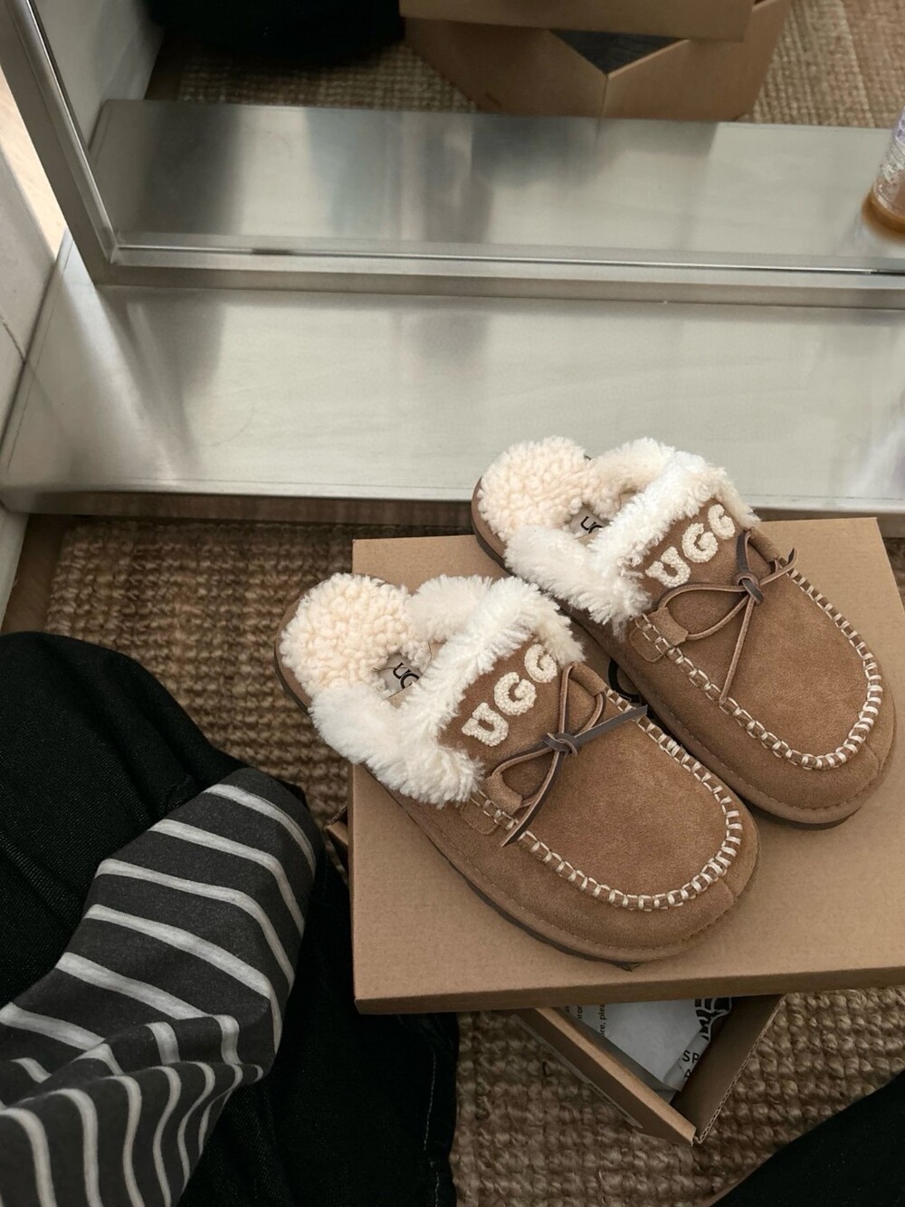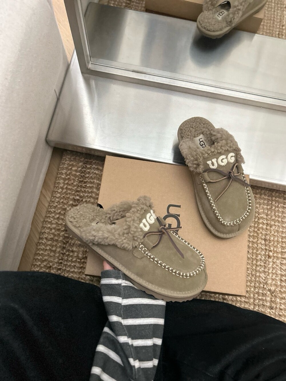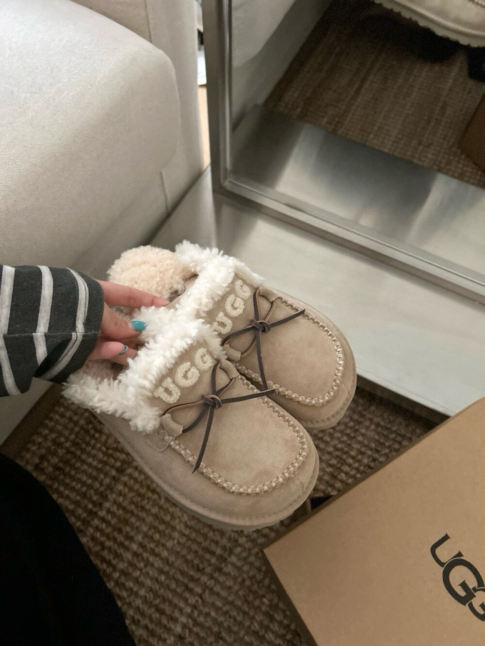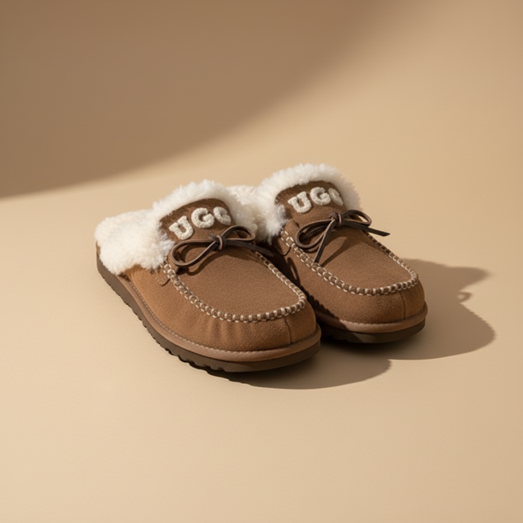귀여운 리본🎀 디테일과 UGG 로고 자수가 포인트인 포근한 양모 슬리퍼예요.