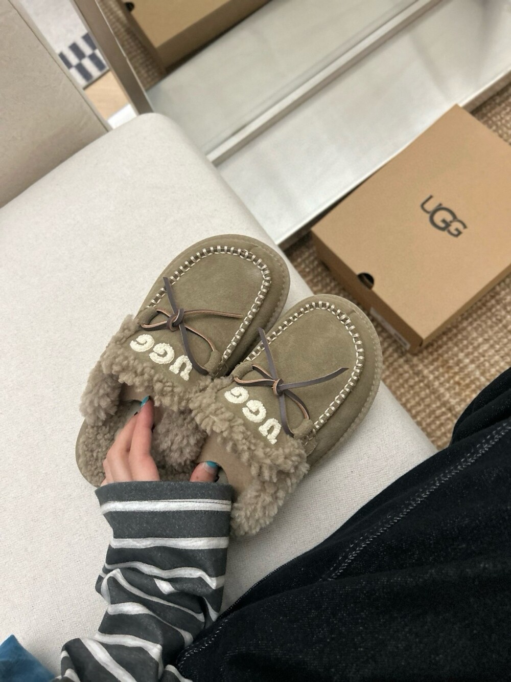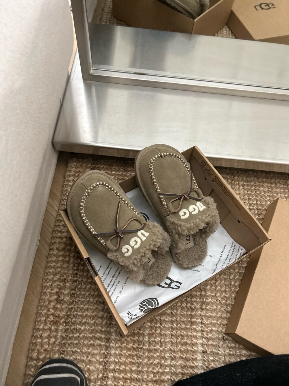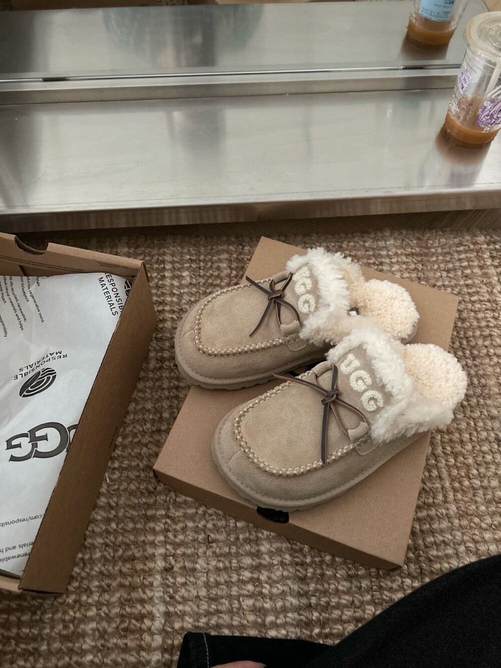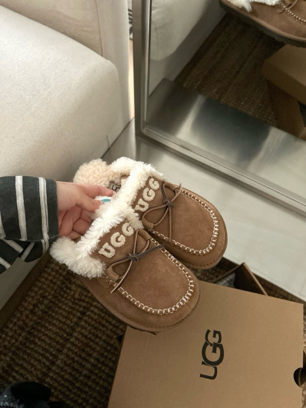 귀여운 리본🎀 디테일과 UGG 로고 자수가 포인트인 포근한 양모 슬리퍼예요.