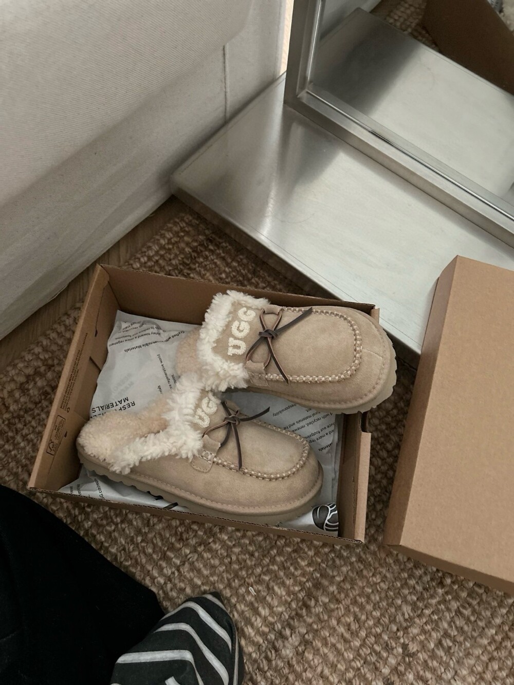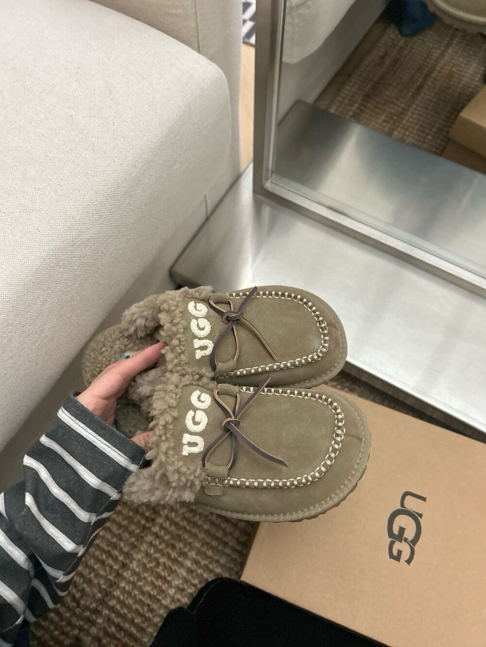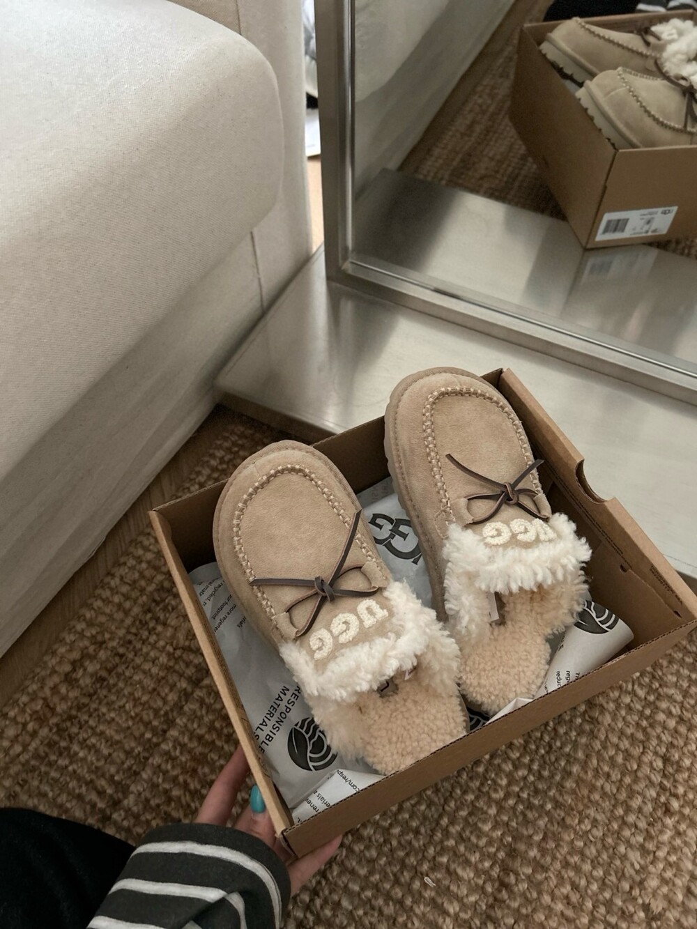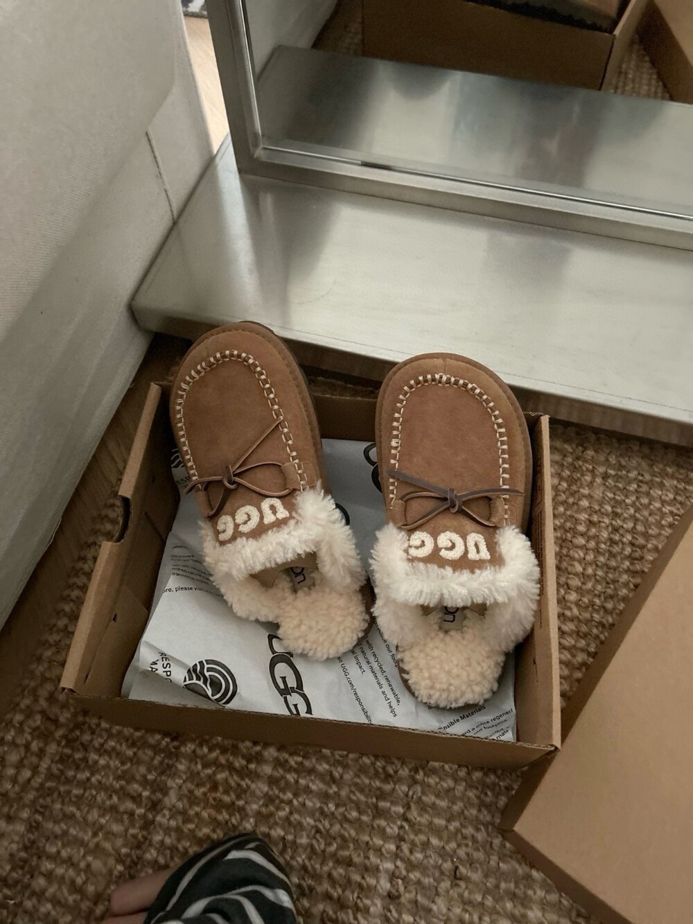 귀여운 리본🎀 디테일과 UGG 로고 자수가 포인트인 포근한 양모 슬리퍼예요.