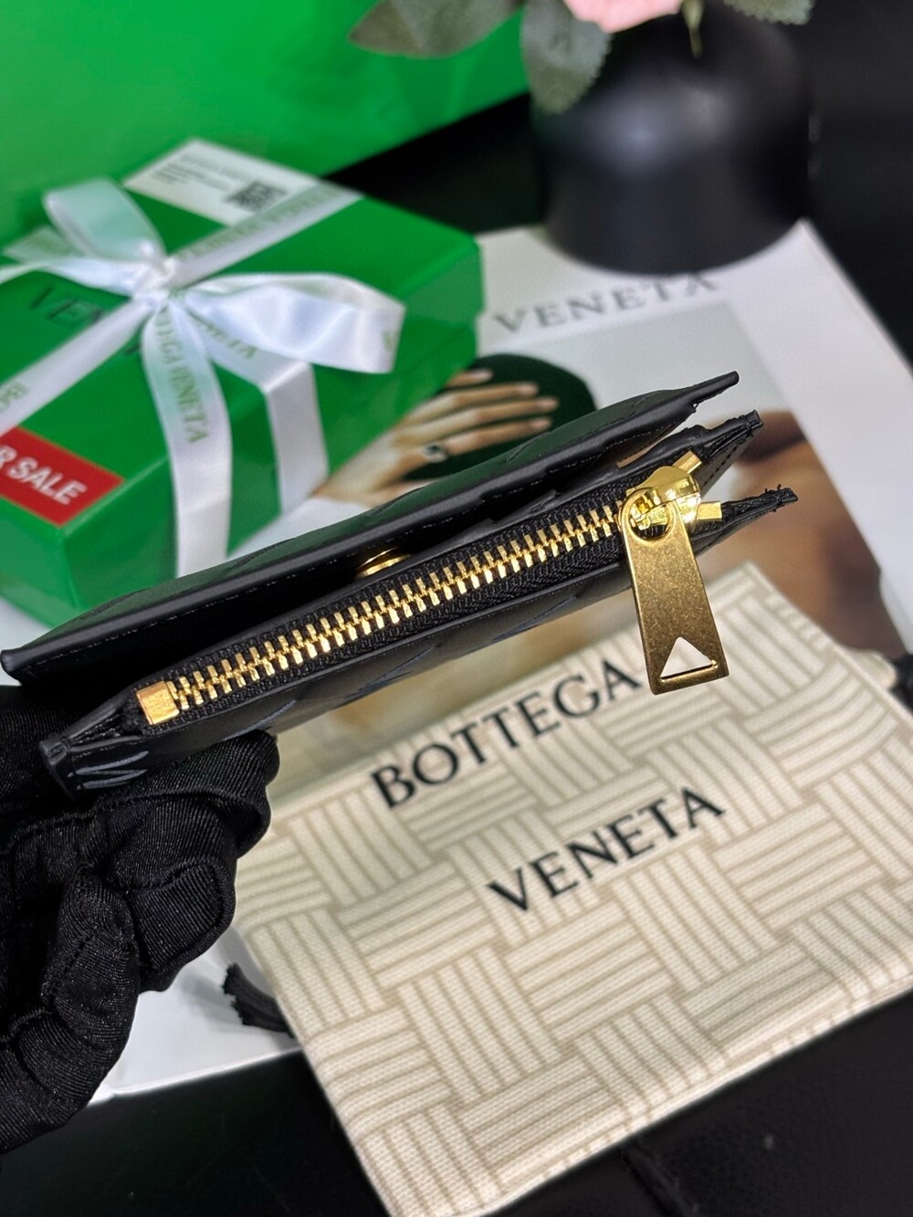 Finished with smooth gold-tone hardware, it slips effortlessly into small bags