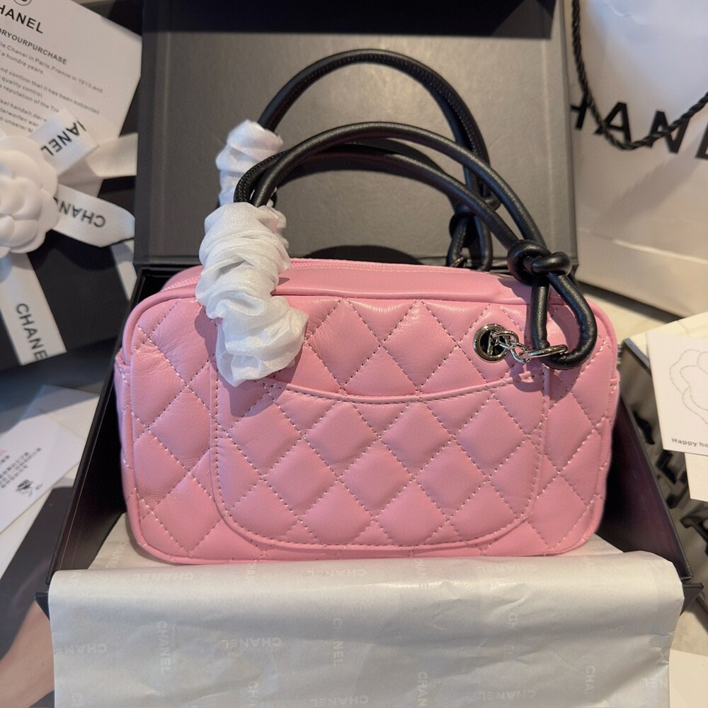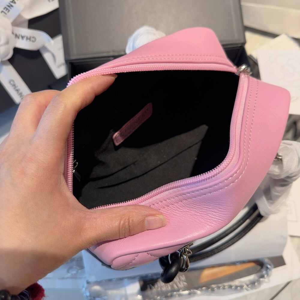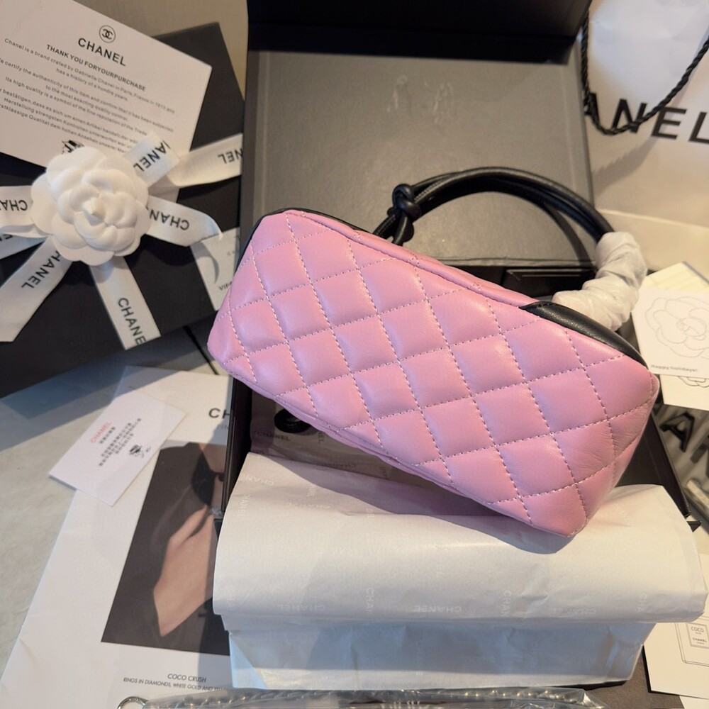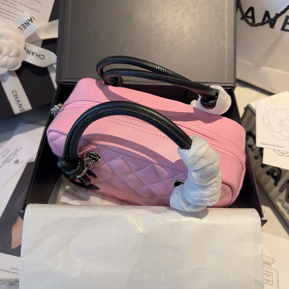 This limited edition Chanel 23K Camellia Handle Box Bag features a structured silhouette in soft pink lambskin leather with bold black accents.