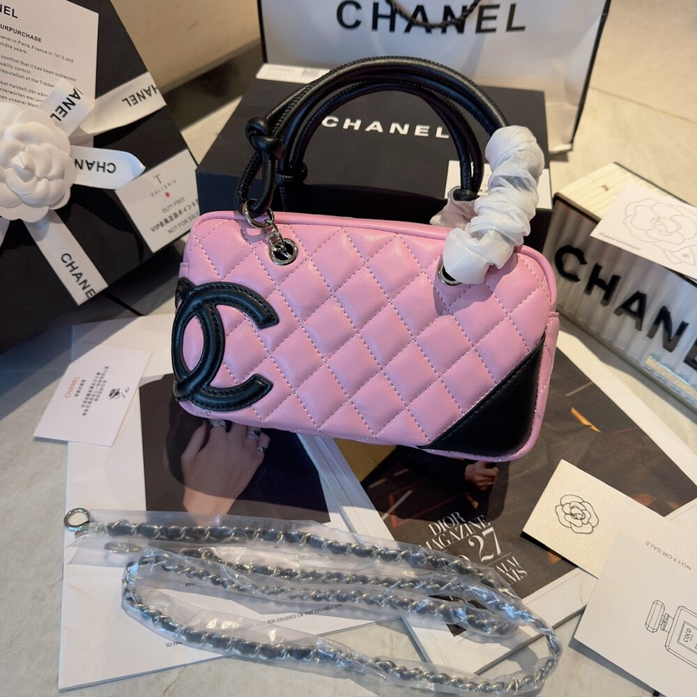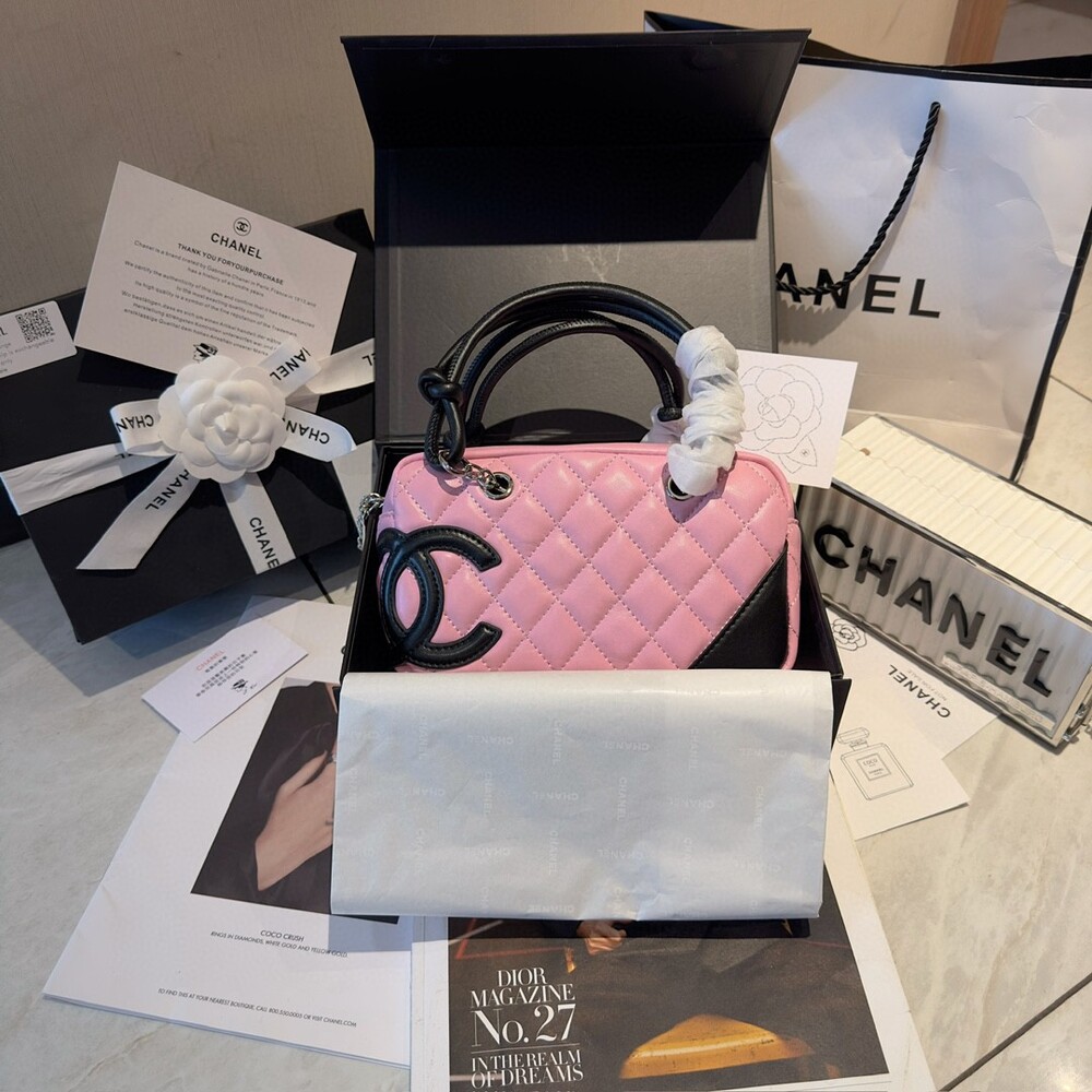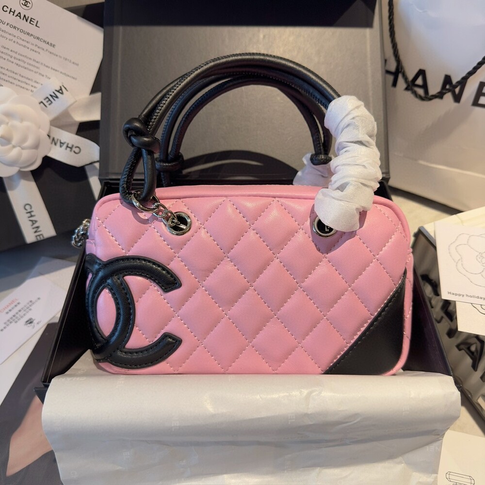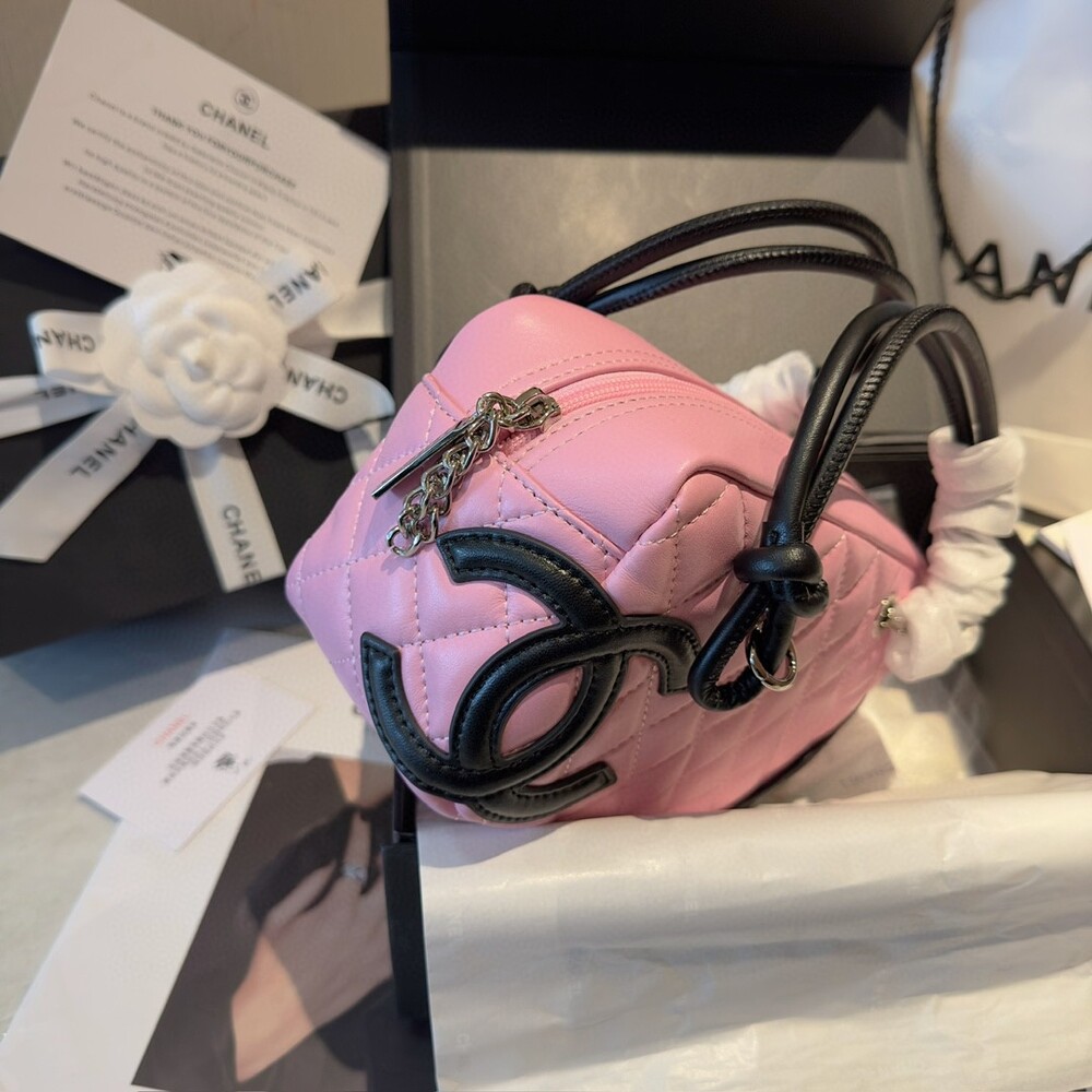 This limited edition Chanel 23K Camellia Handle Box Bag features a structured silhouette in soft pink lambskin leather with bold black accents.
