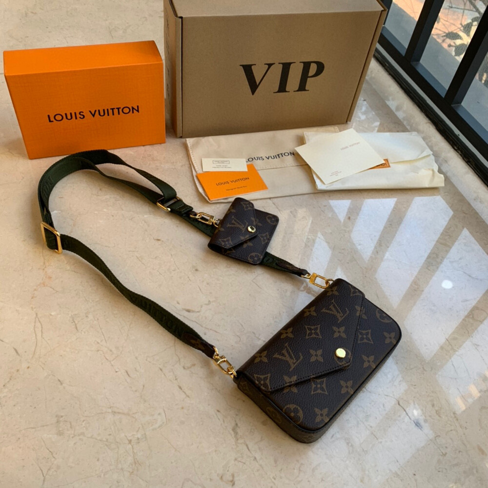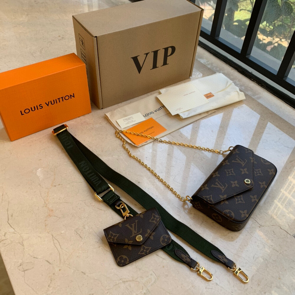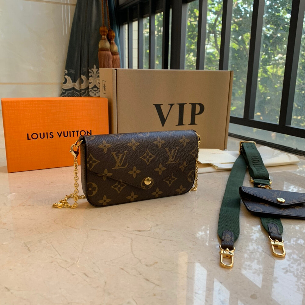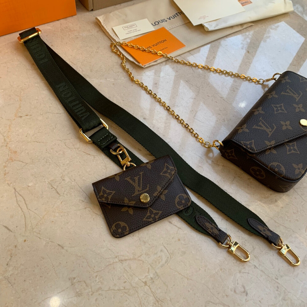 The LV Multi Pochette Felicie, which will be launched in January, looks like a combination of the five-in-one and the old three-in-one launched in 19 bag + coin purse + adjustable nylon shoulder strap + hardware chain 2 bags and 2 shoulder straps. Each part can be disassembled, and the shoulder strap can be adjusted at will. Take a good look and look good on your backMaterial: Original single old flower material + first layer