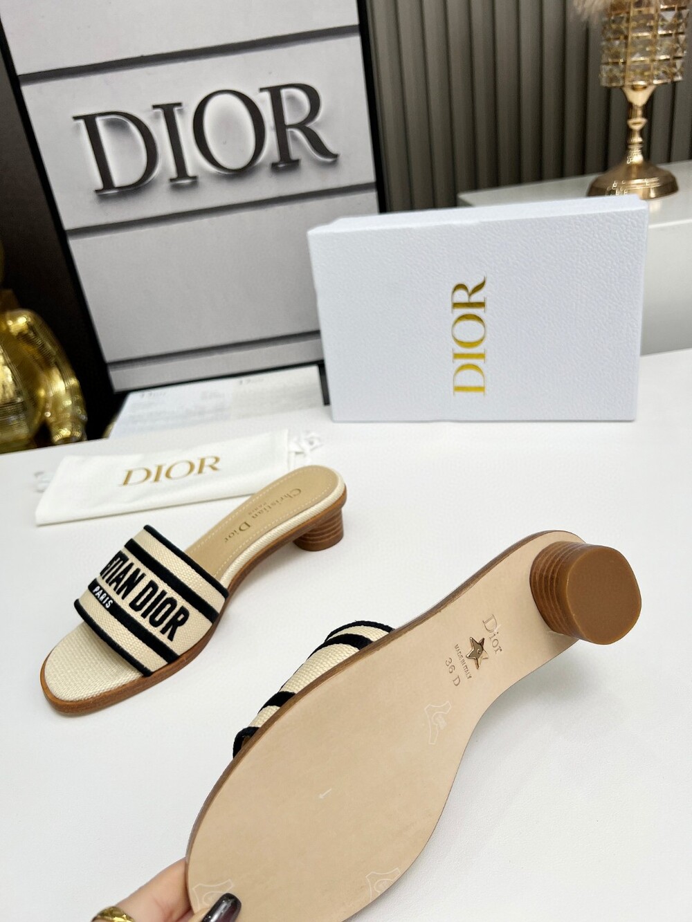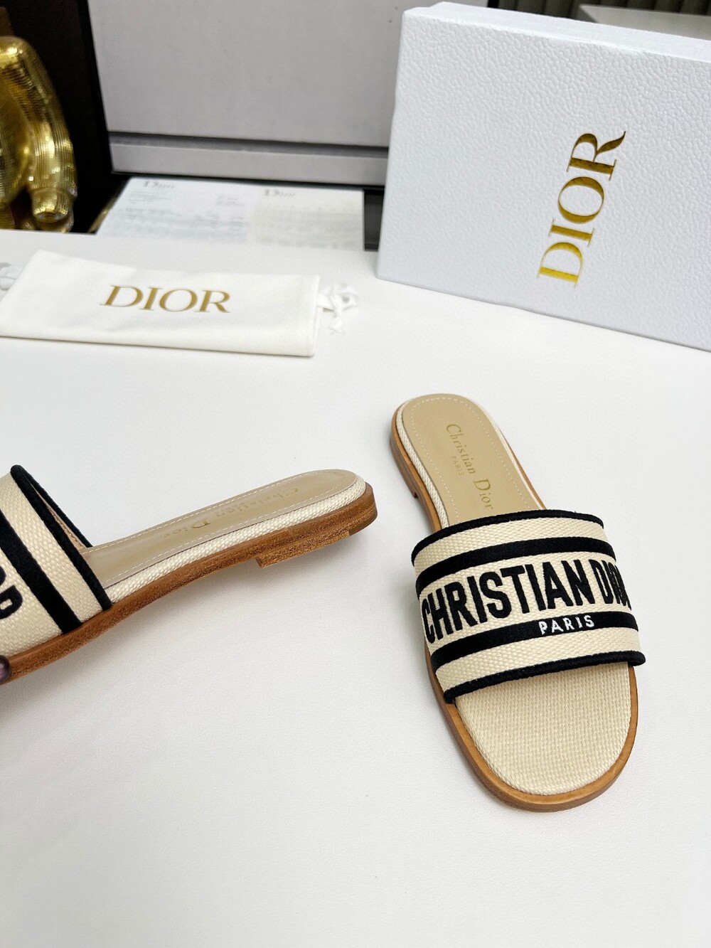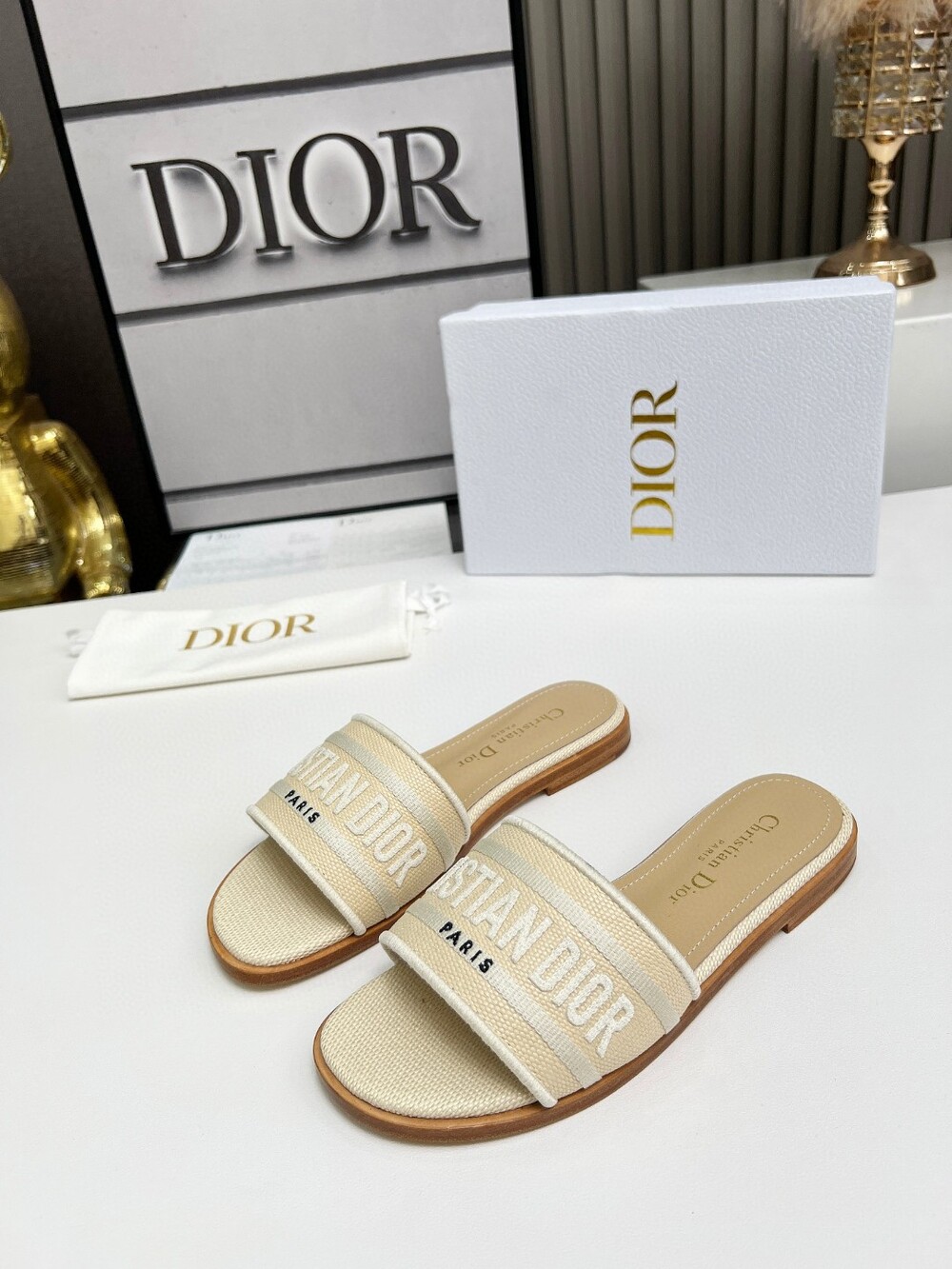 D. 디오르 라탄 슬리퍼 1cm - 크림