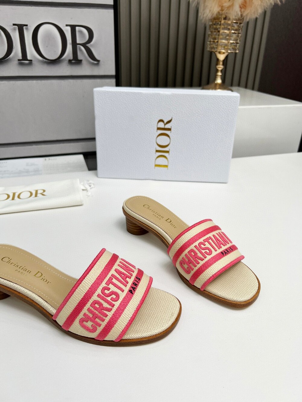 D. 디오르 라탄 슬리퍼 5.5cm - 핑크
