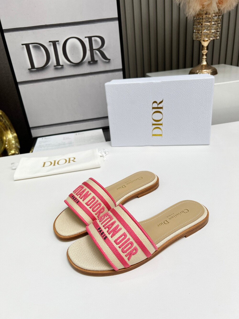 D. 디오르 라탄 슬리퍼 1cm - 핑크