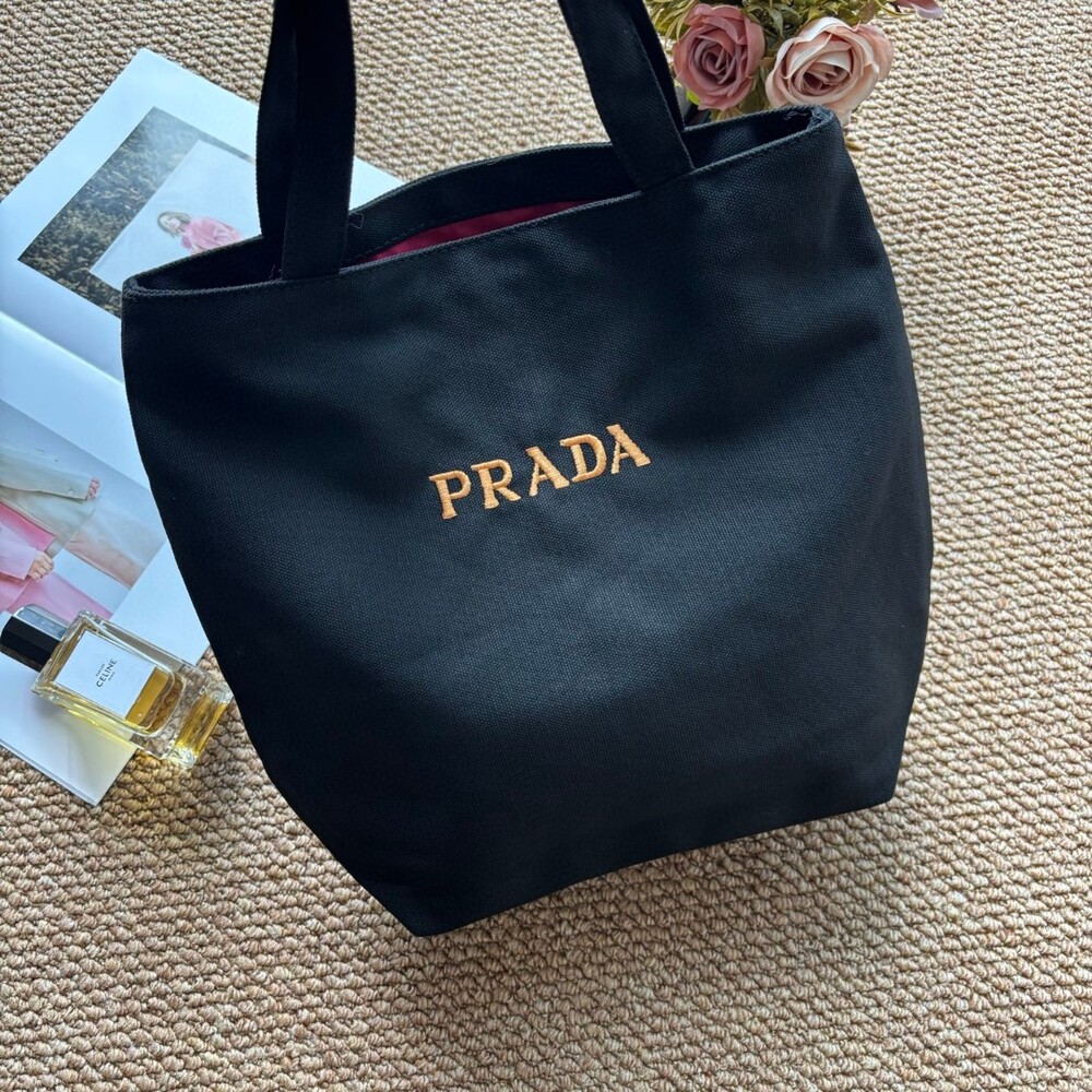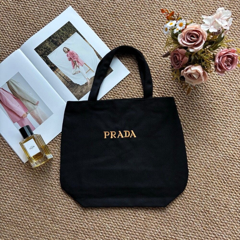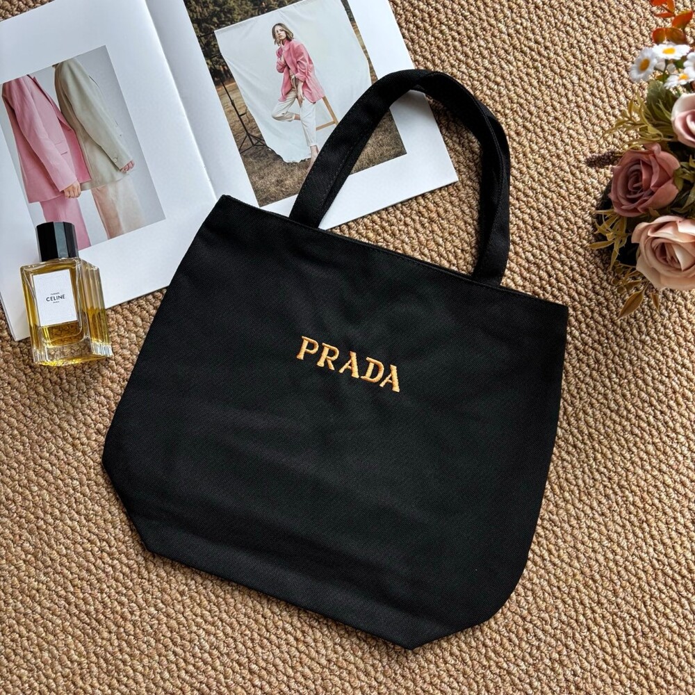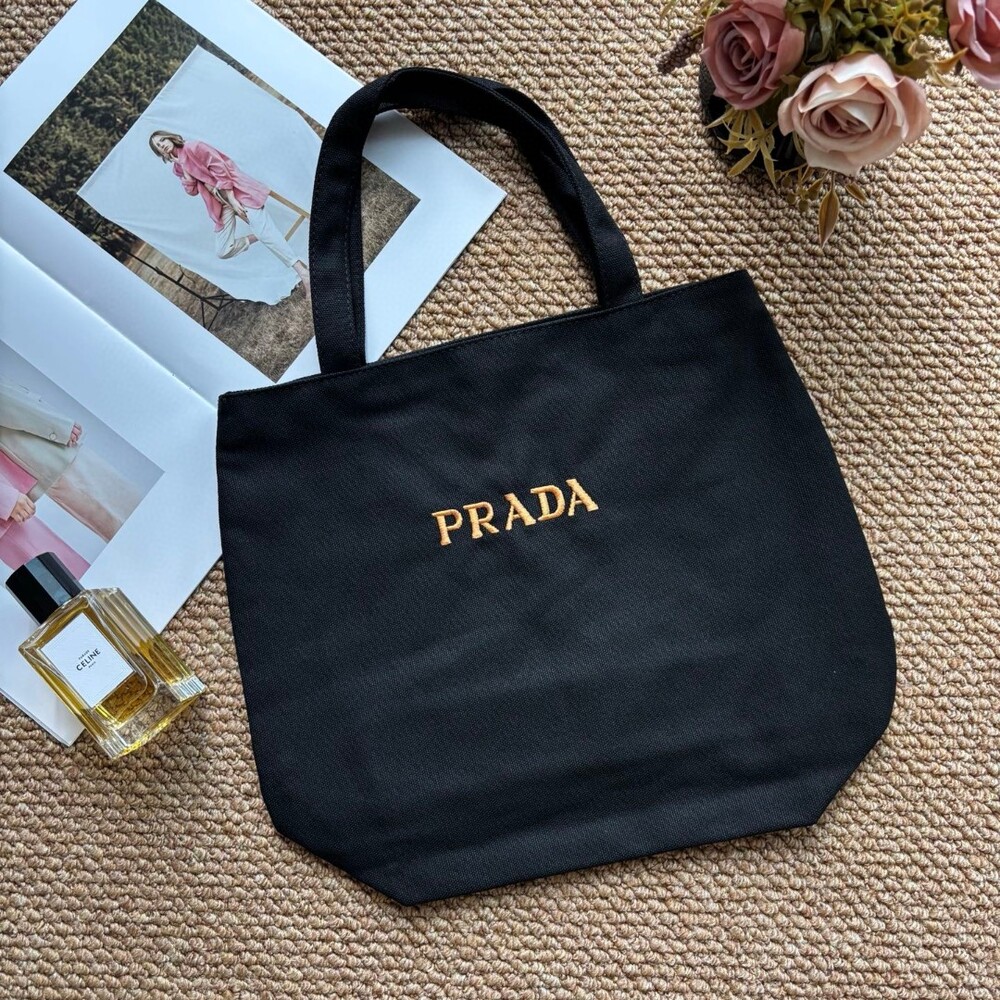 A minimalist Prada canvas tote featuring gold-tone