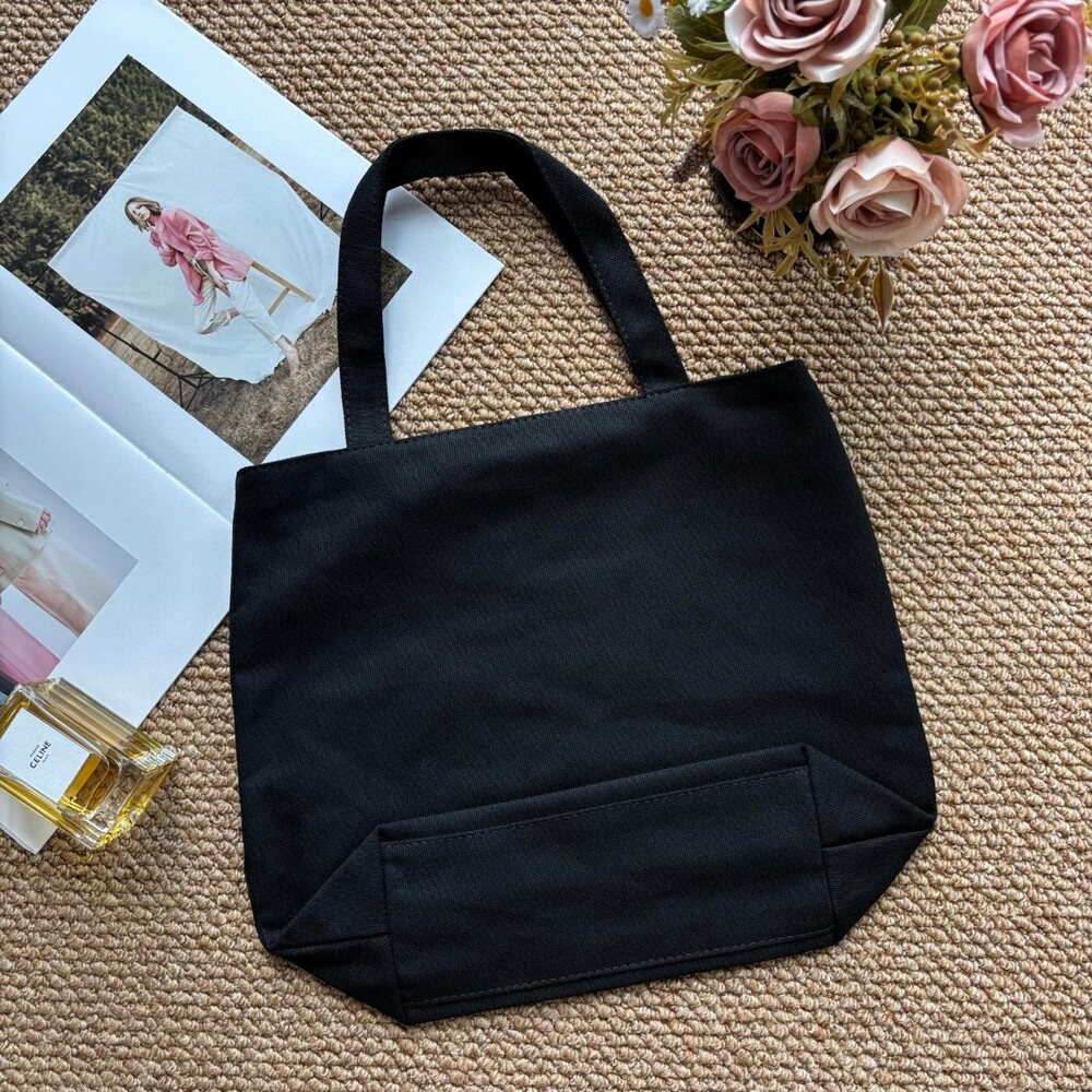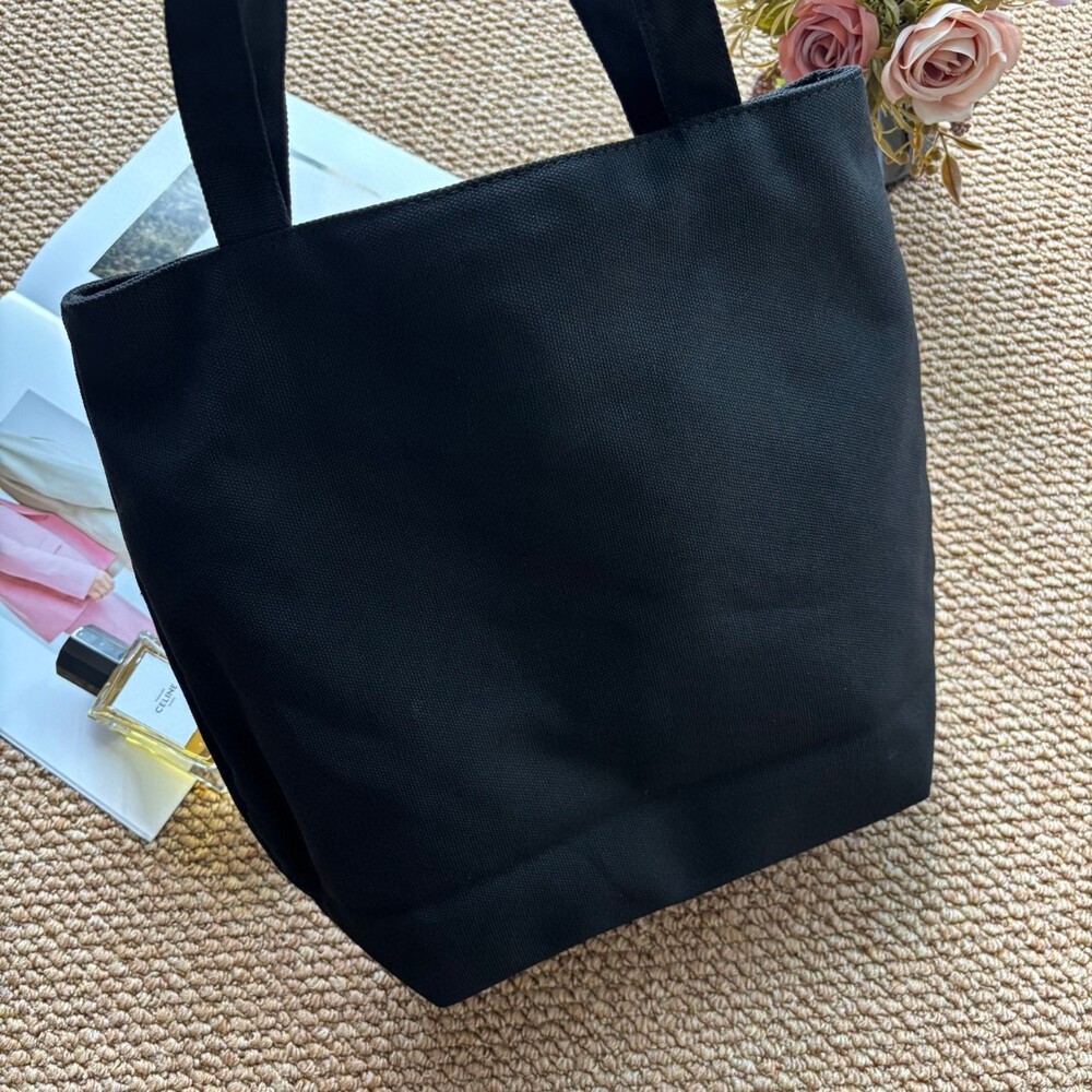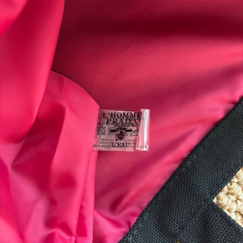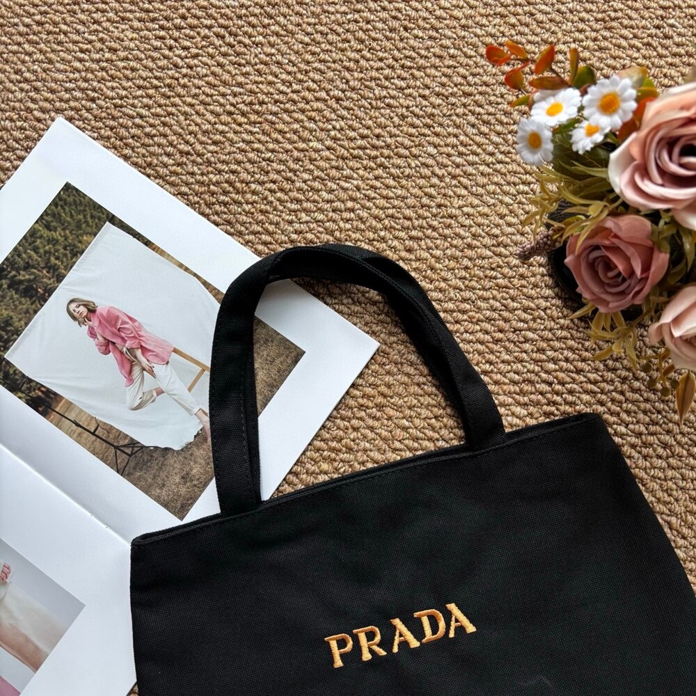 A minimalist Prada canvas tote featuring gold-tone