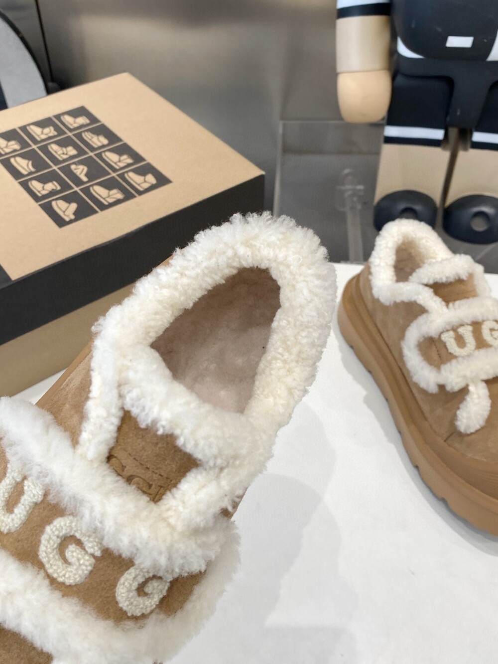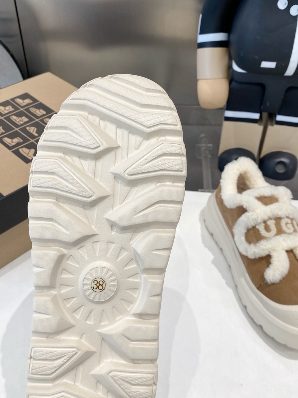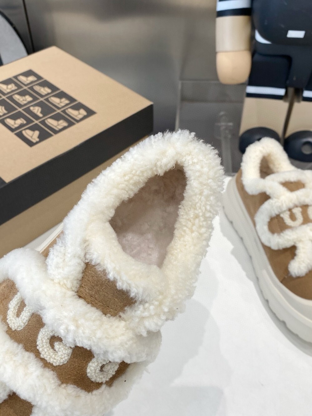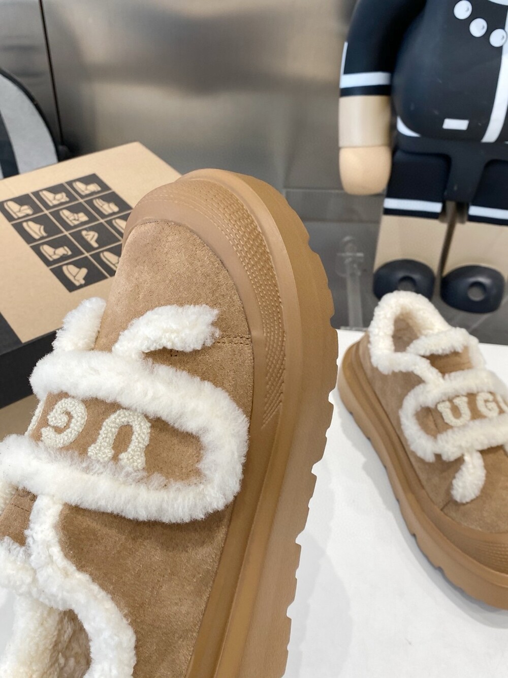 따뜻하게 신을 수 있는 UGG 로고 플랫폼 뮬이에요.