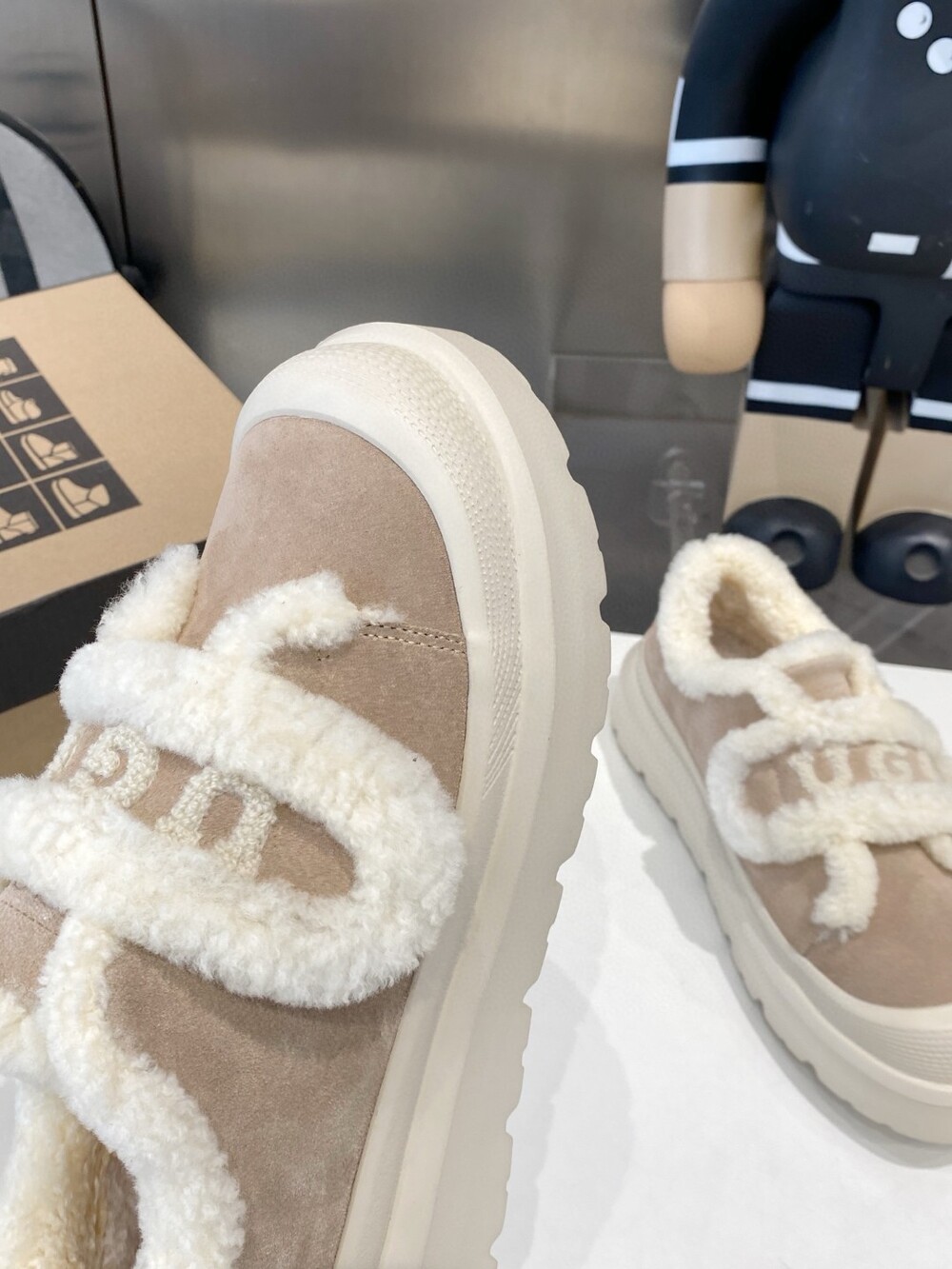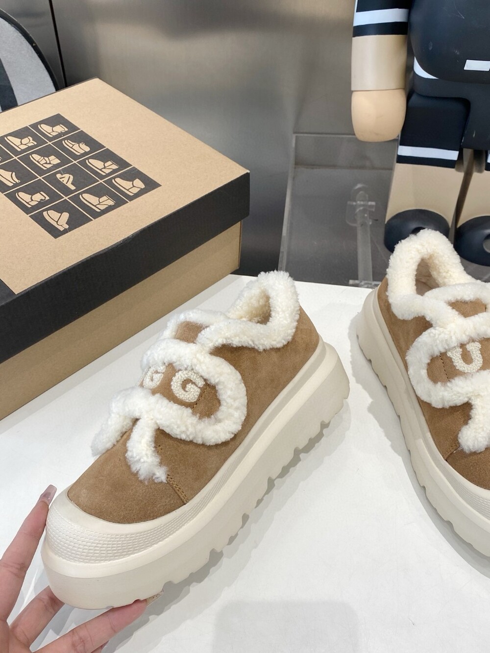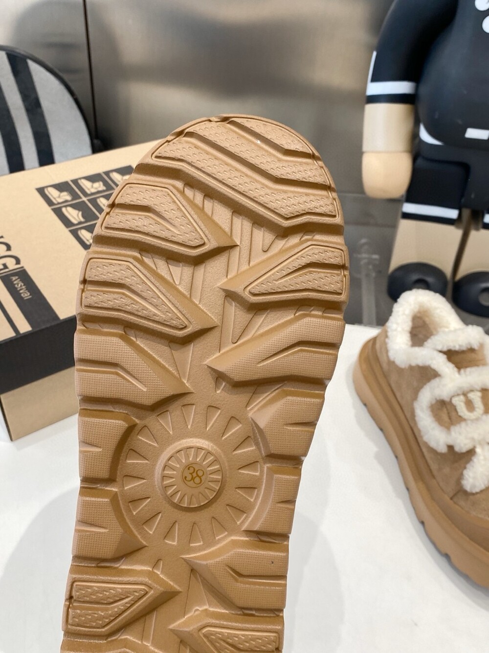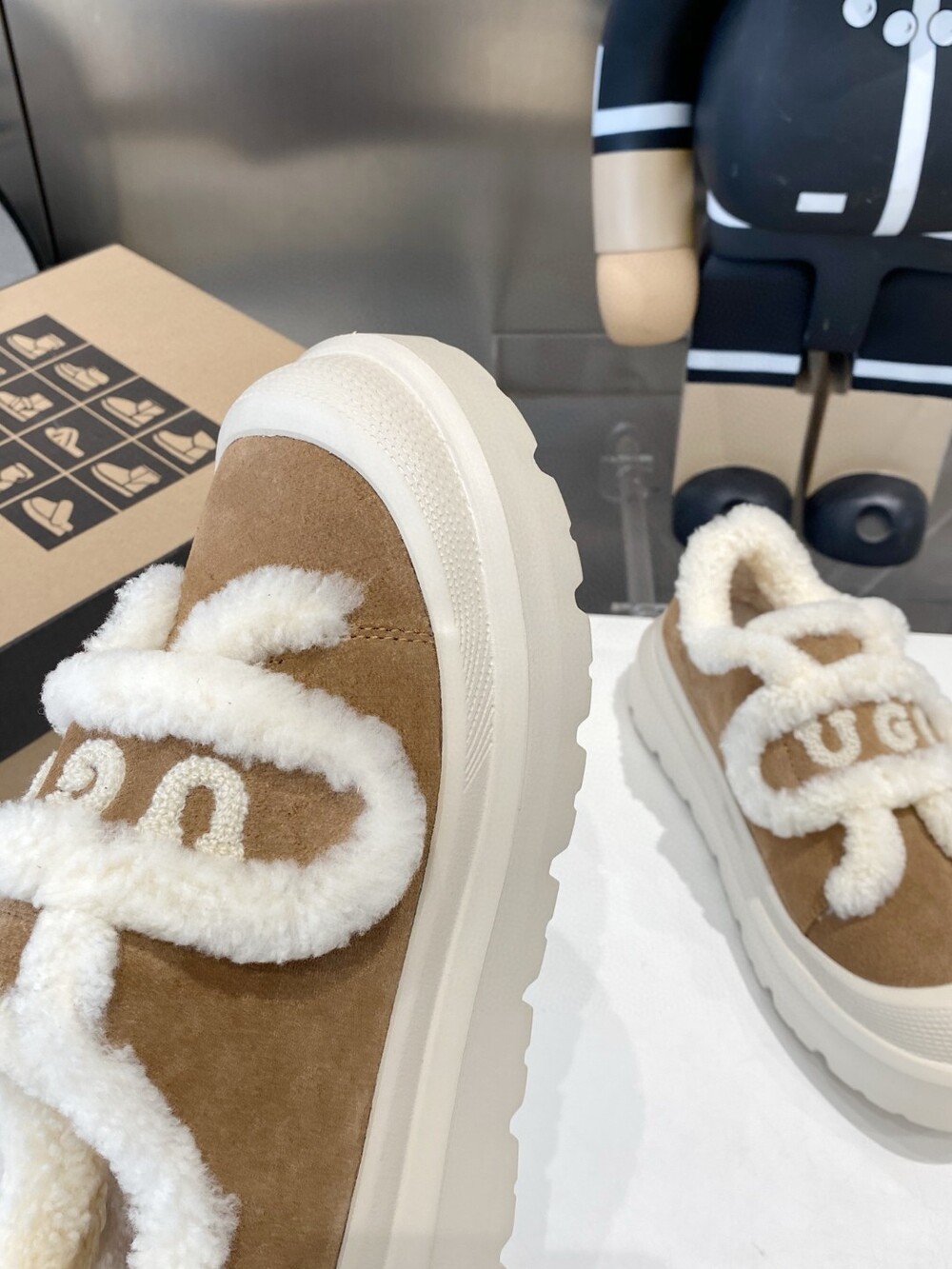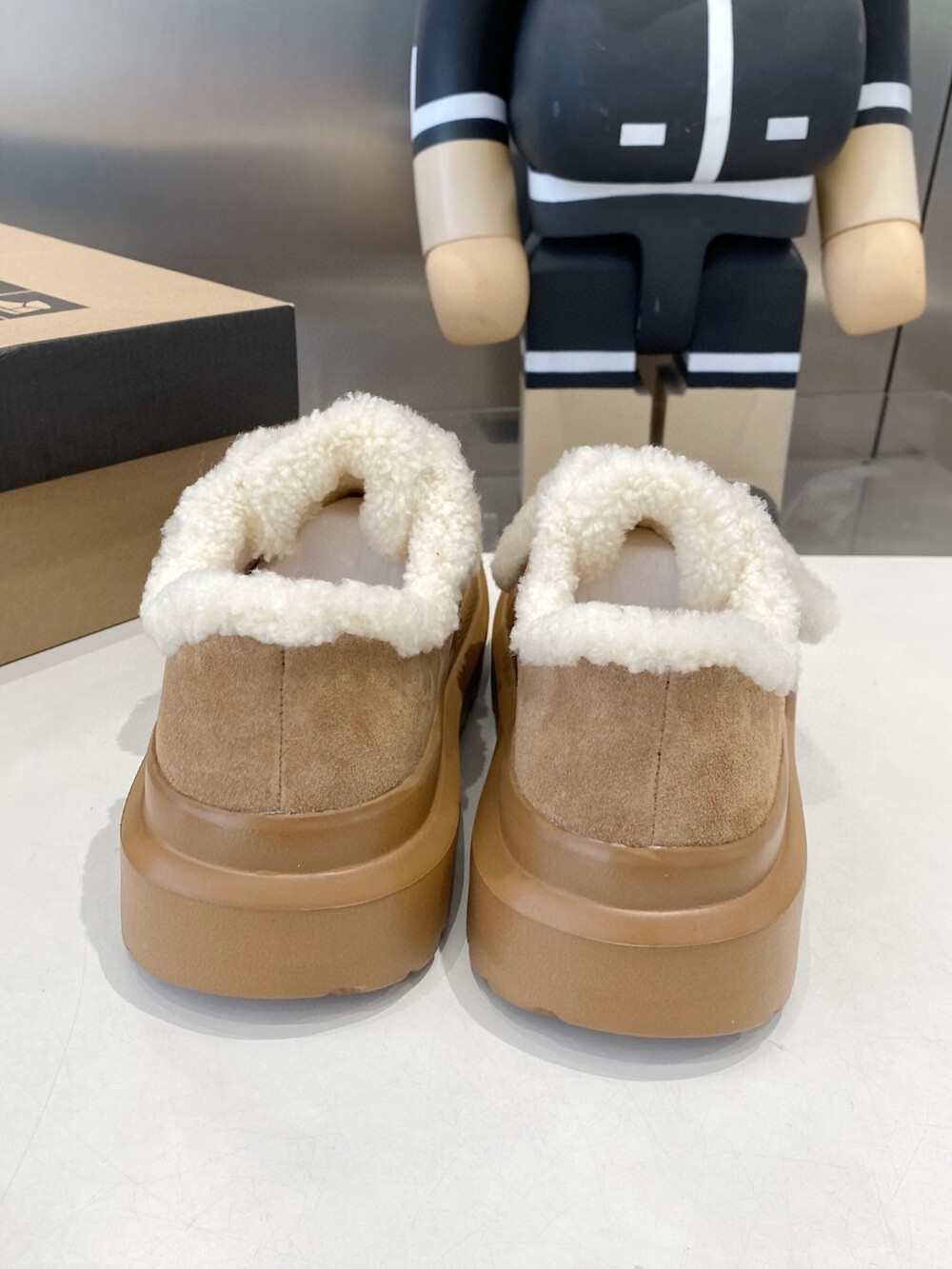 따뜻하게 신을 수 있는 UGG 로고 플랫폼 뮬이에요.