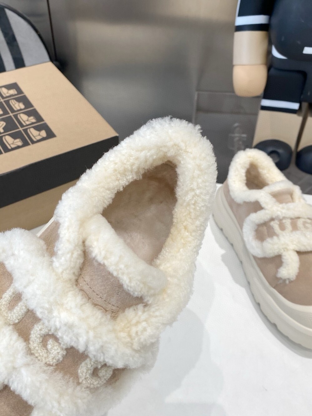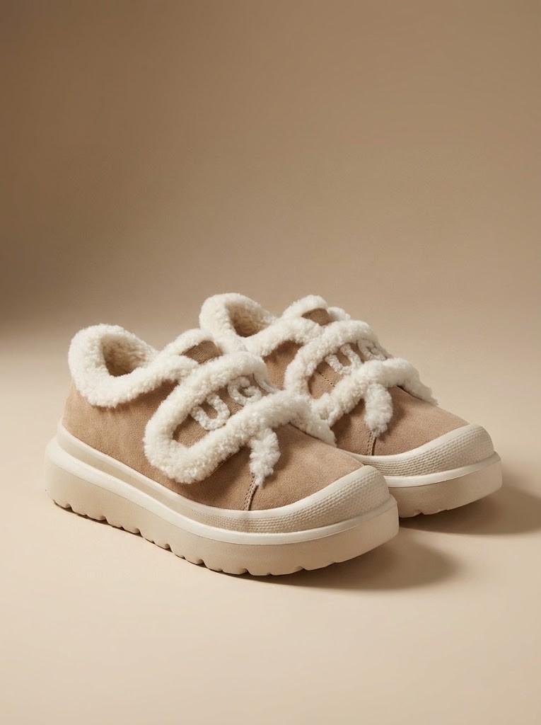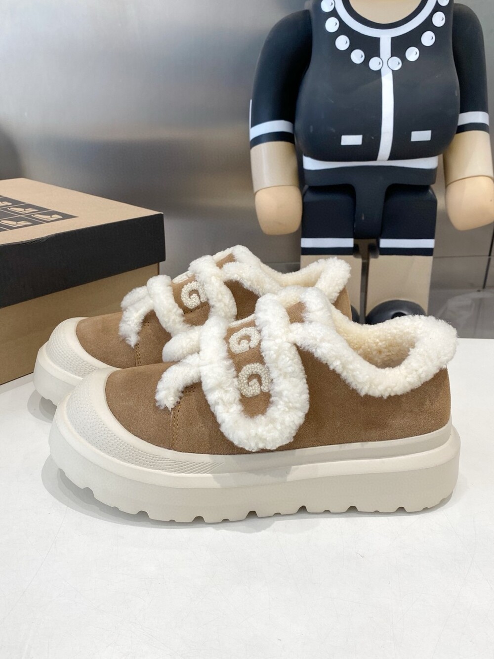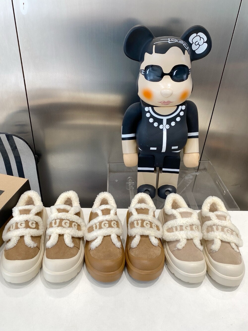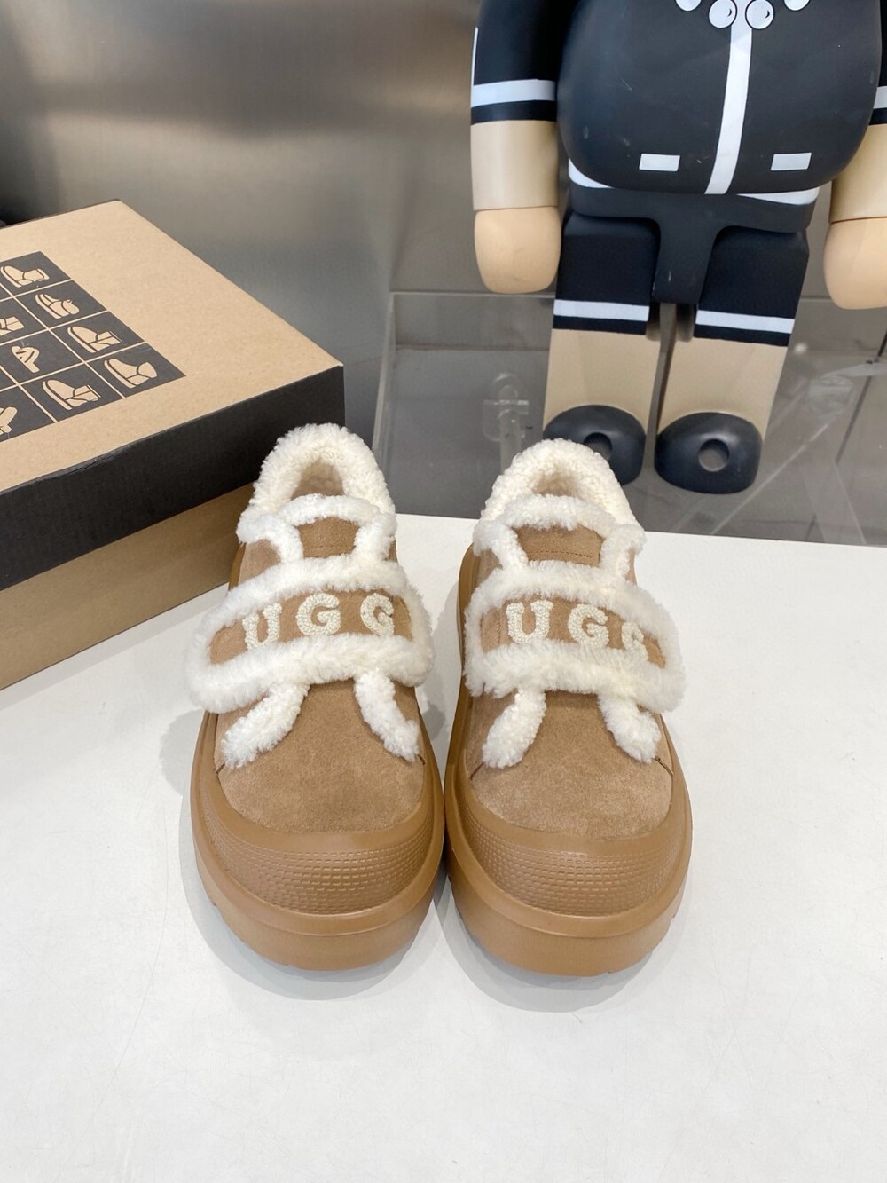 따뜻하게 신을 수 있는 UGG 로고 플랫폼 뮬이에요.