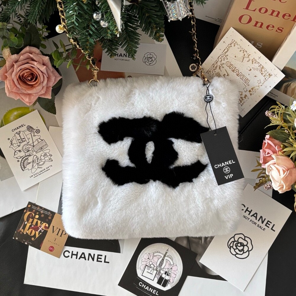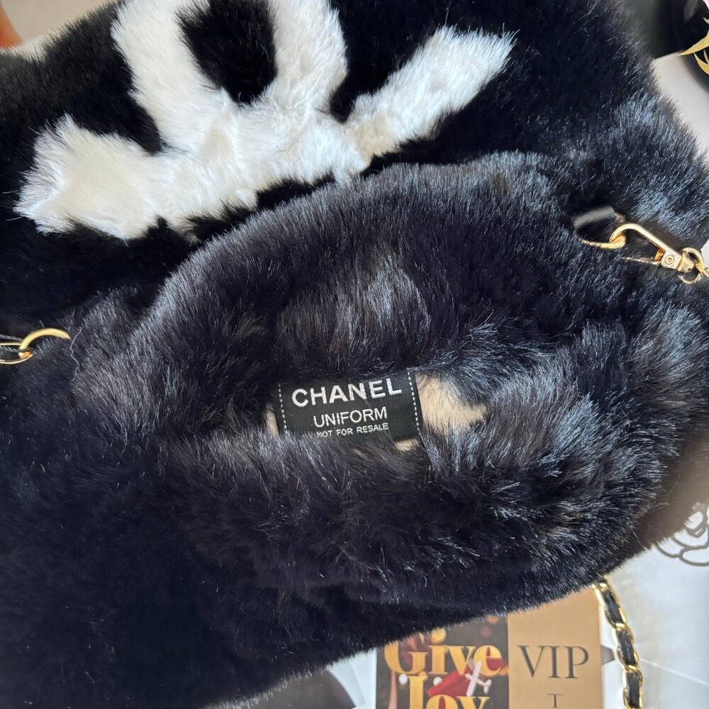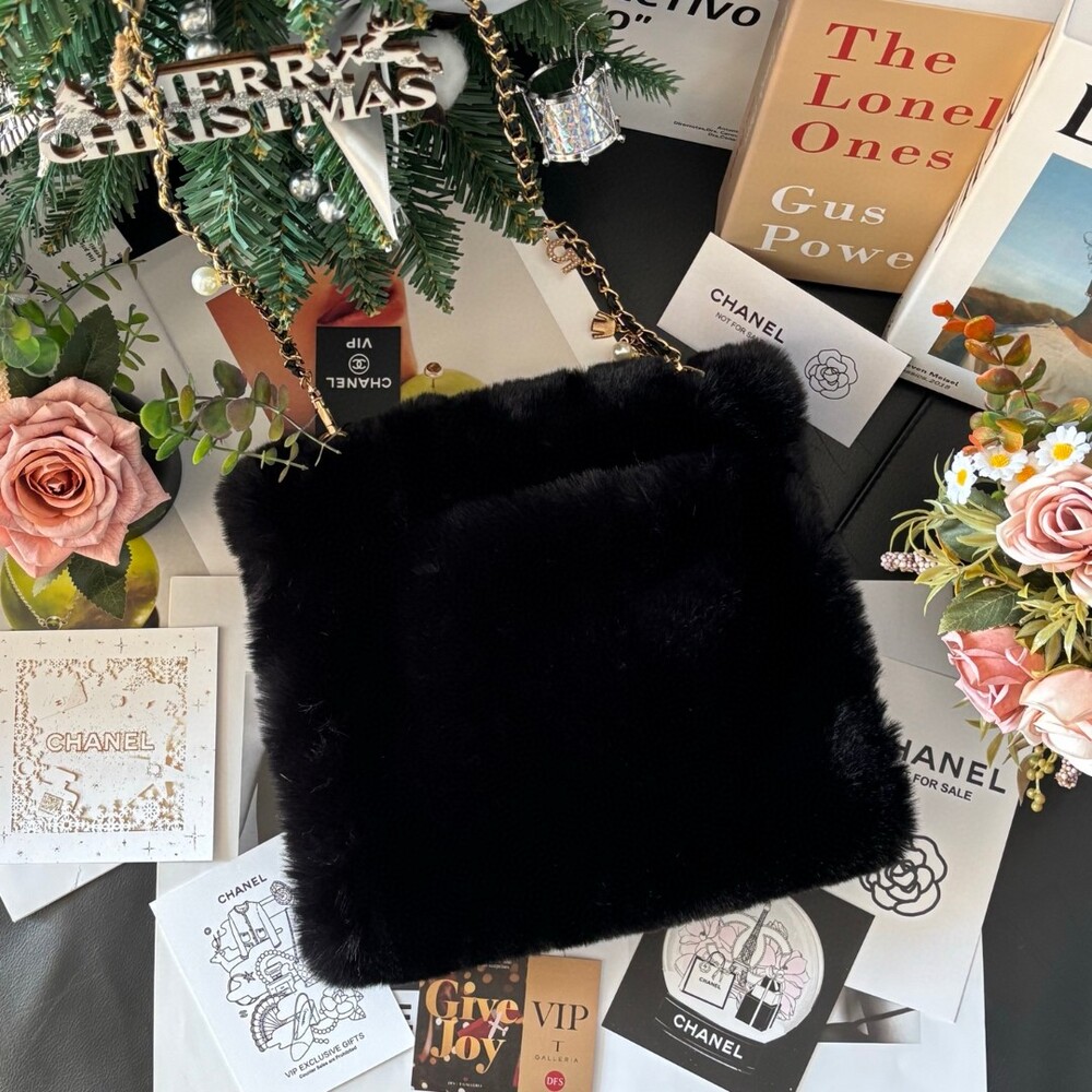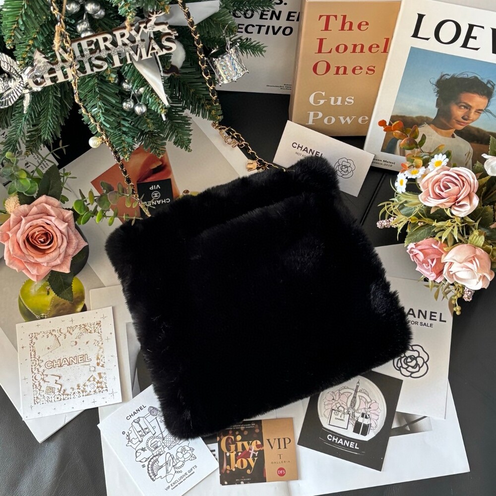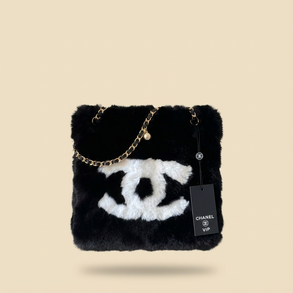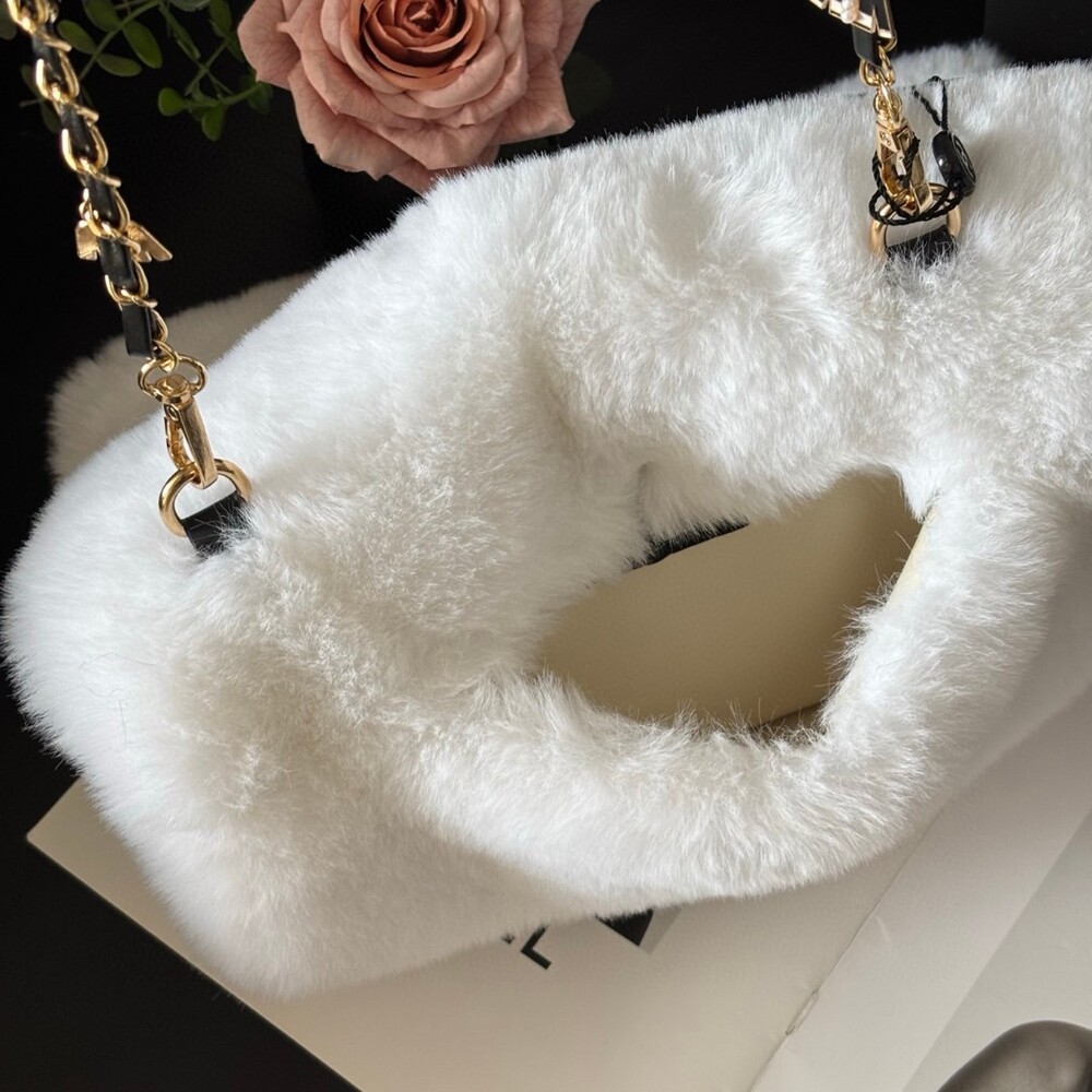 A luxurious faux fur chain pouch inspired by CHANEL’s iconic aesthetic.