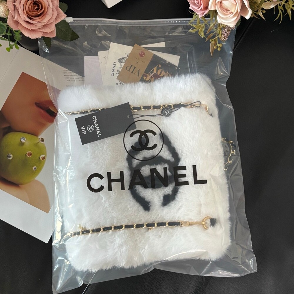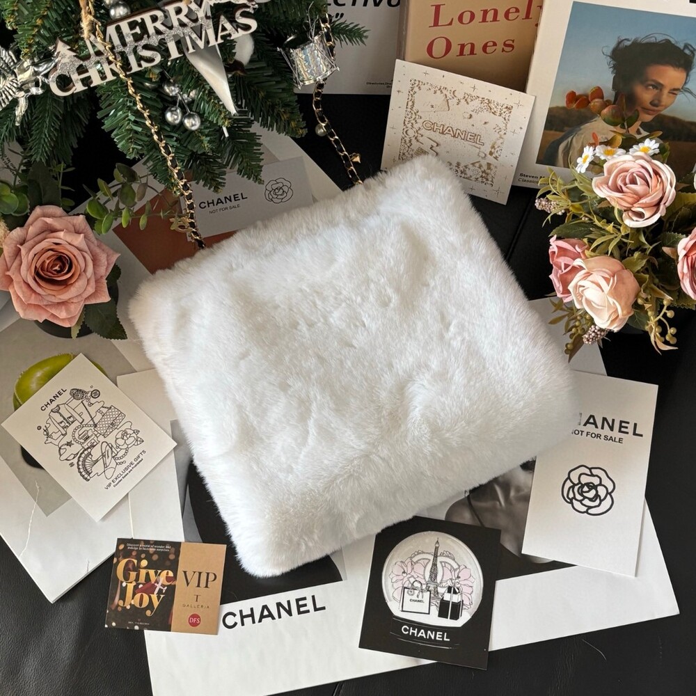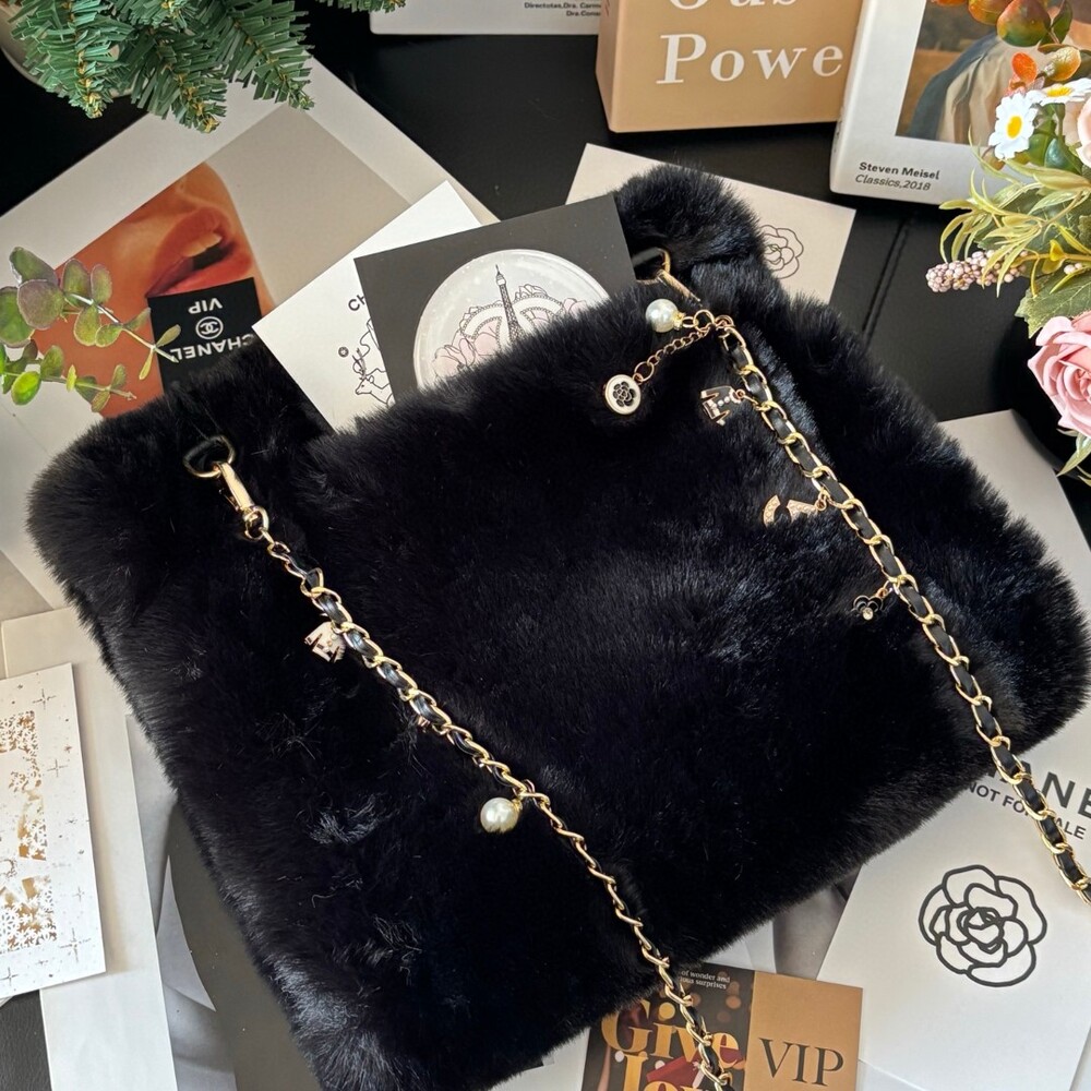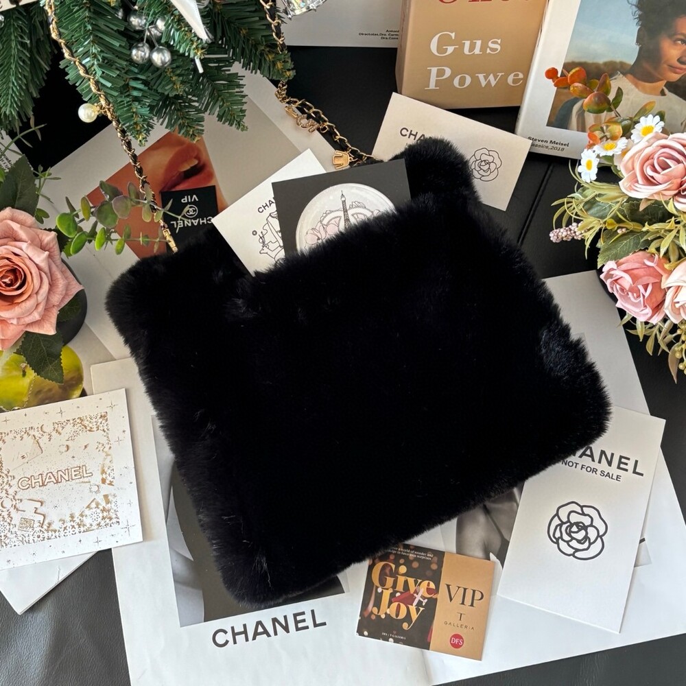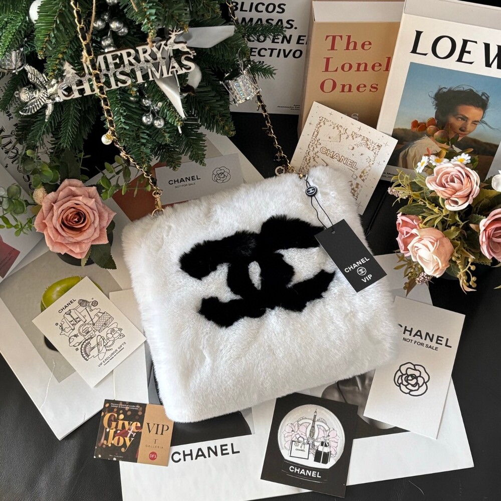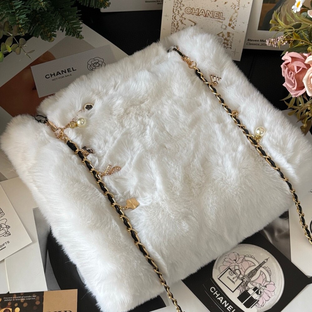 A luxurious faux fur chain pouch inspired by CHANEL’s iconic aesthetic.