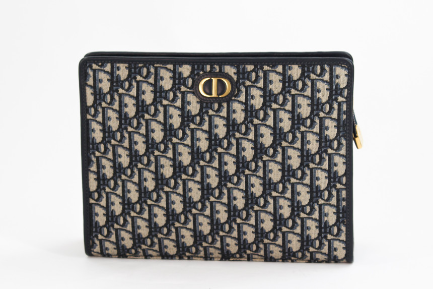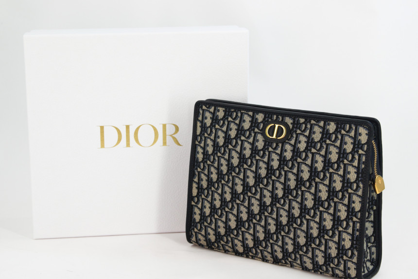 The 30 Montaigne pouch is a timeless and sophisticated accessory. Crafted in blue Dior Oblique jacquard, it features a 'CD' signature at the front as well as shiny antique gold-finish metal details. Its spacious interior compartment can hold all the essentials, while its structured shape allows it to be carried as a clutch or slipped into a Dior Book Tote.