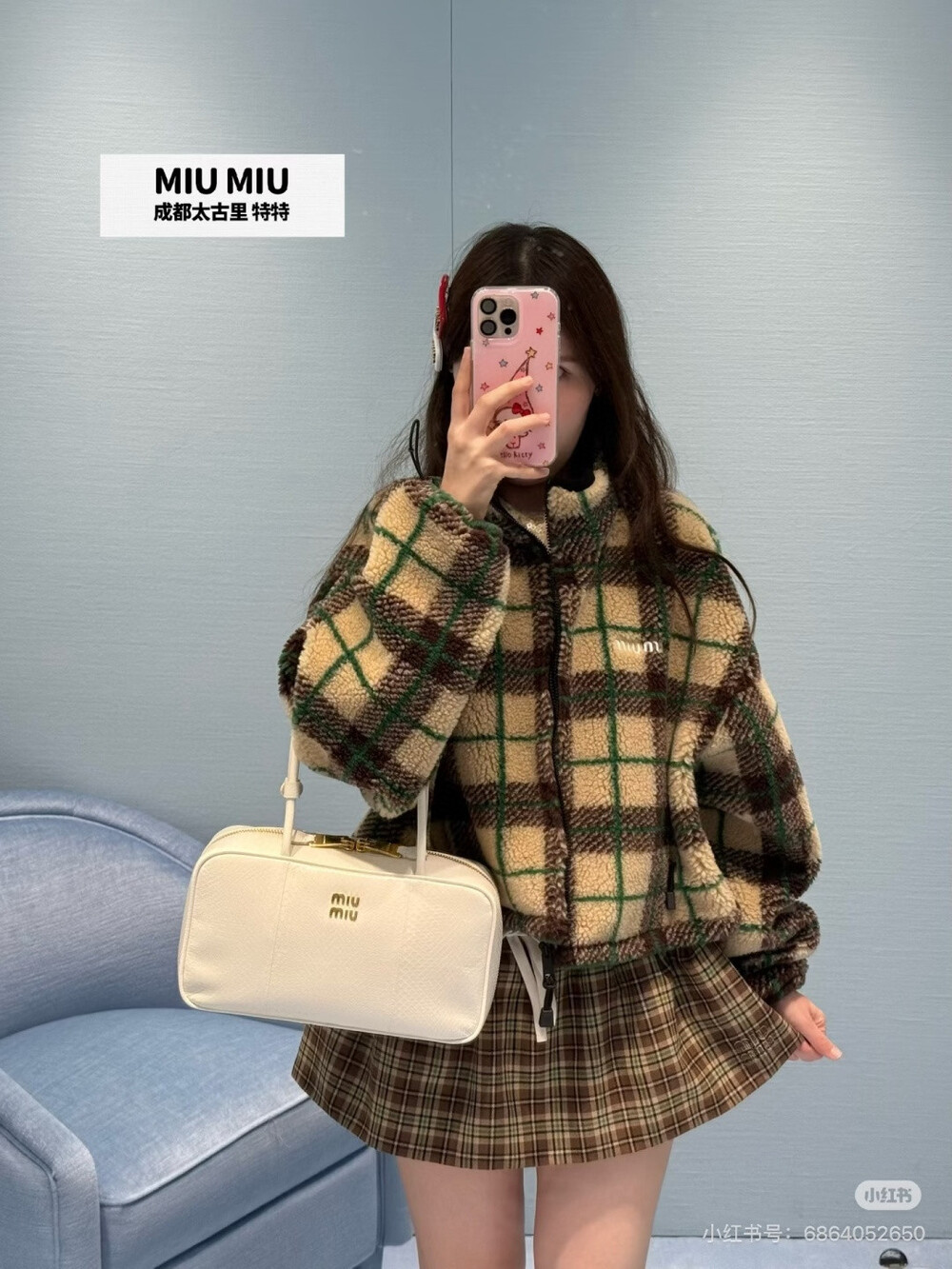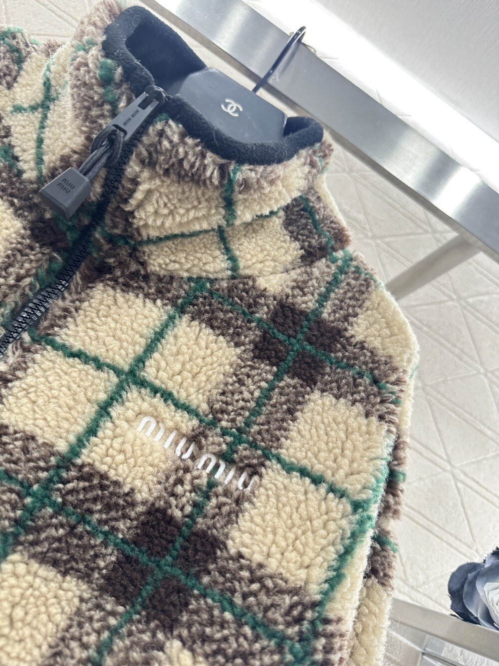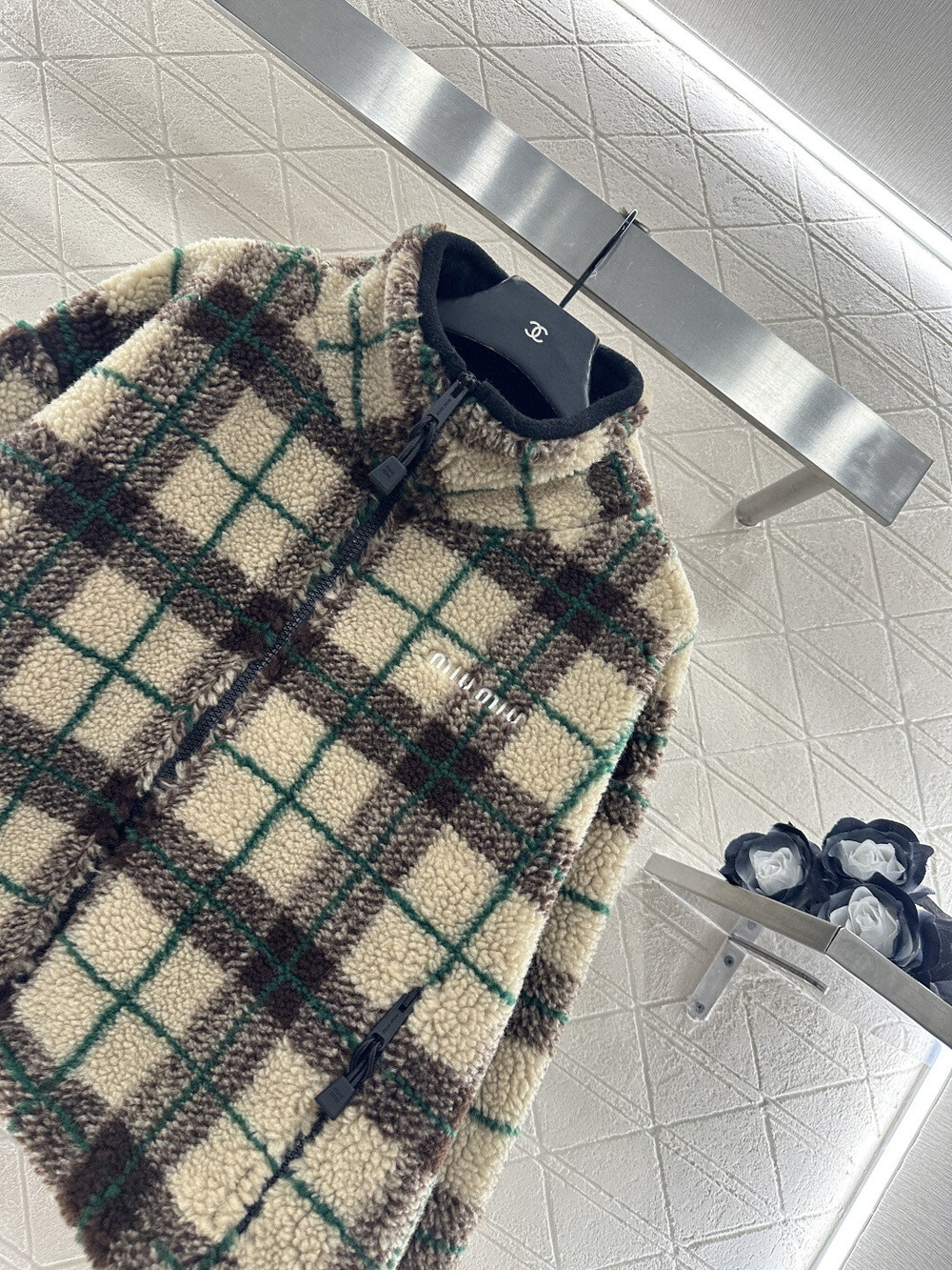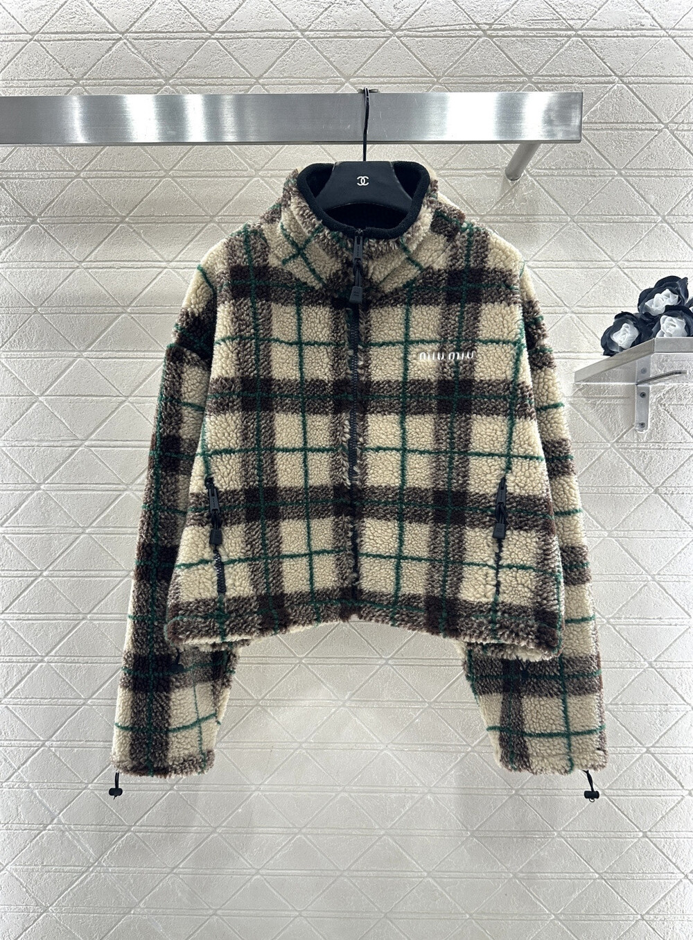 Q. 뮤뮤 체커드 플리스 크롭 집업