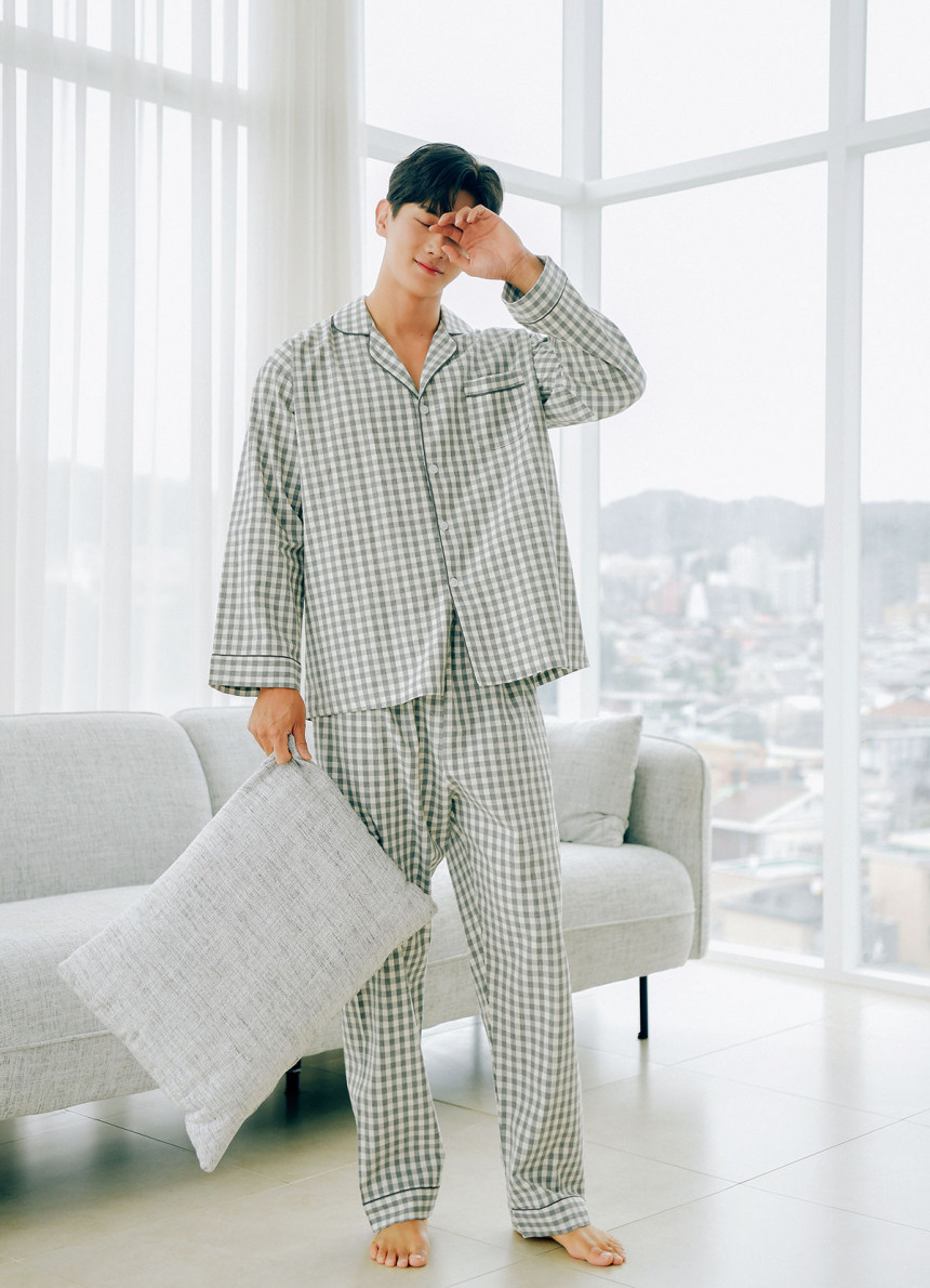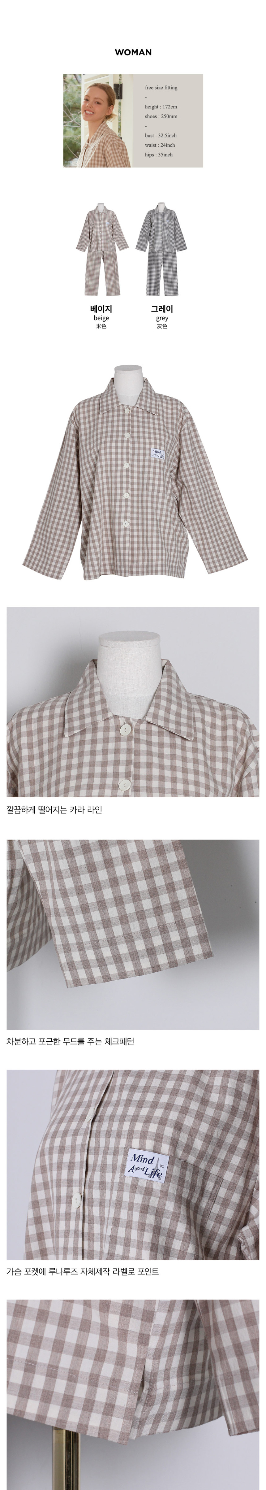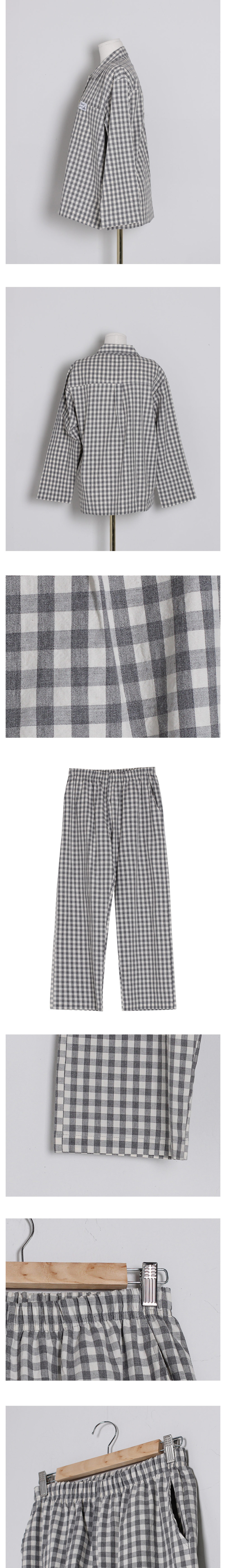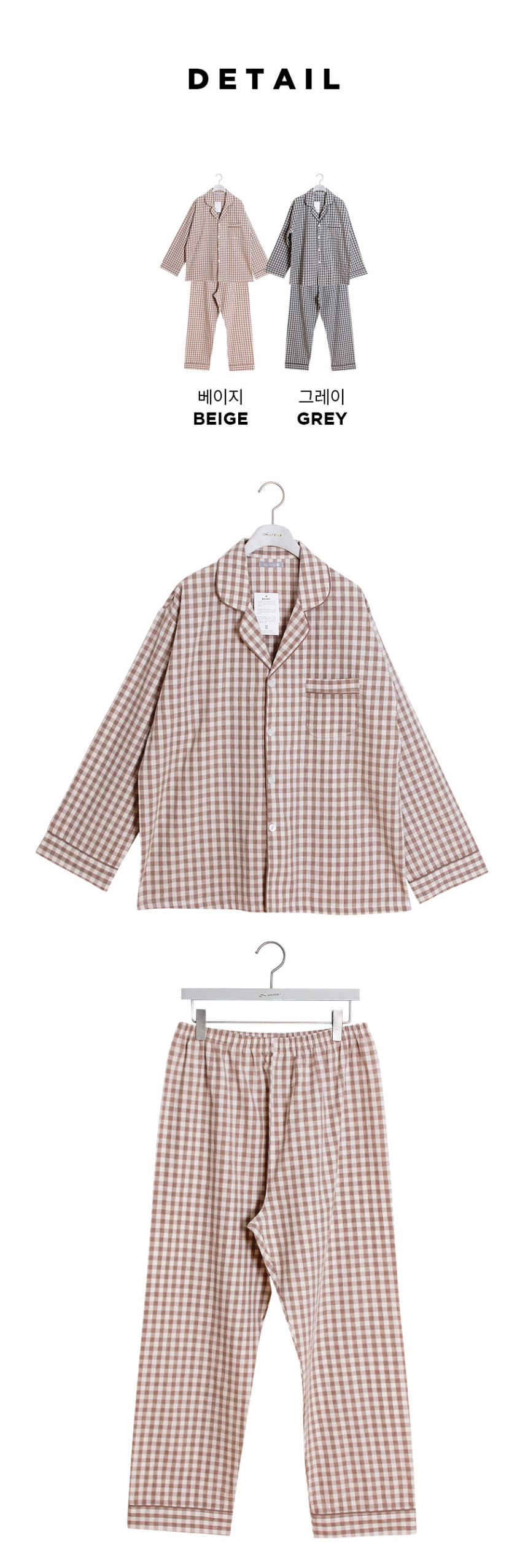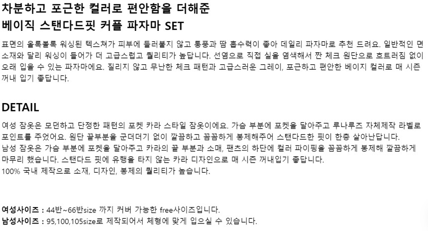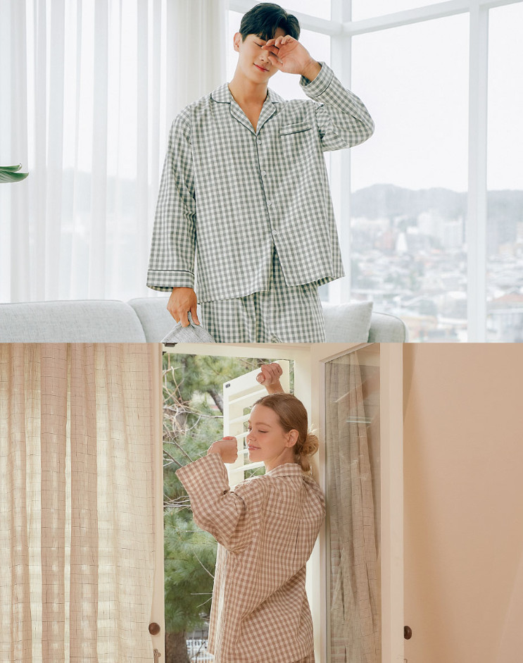 여성 남성 커플 베이직체크 카라 투피스 수면 잠옷
