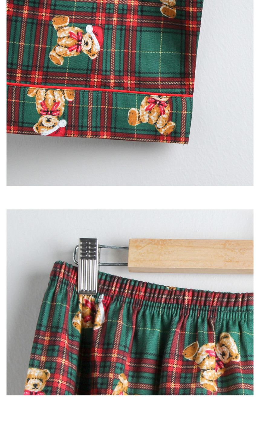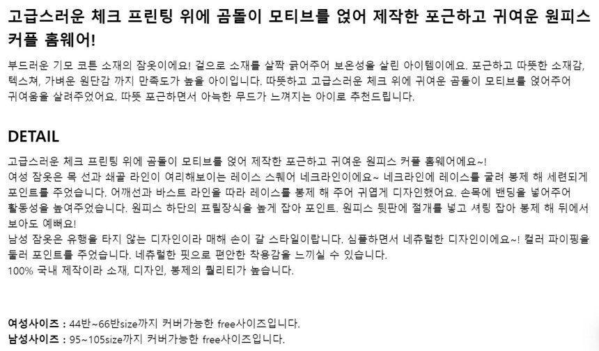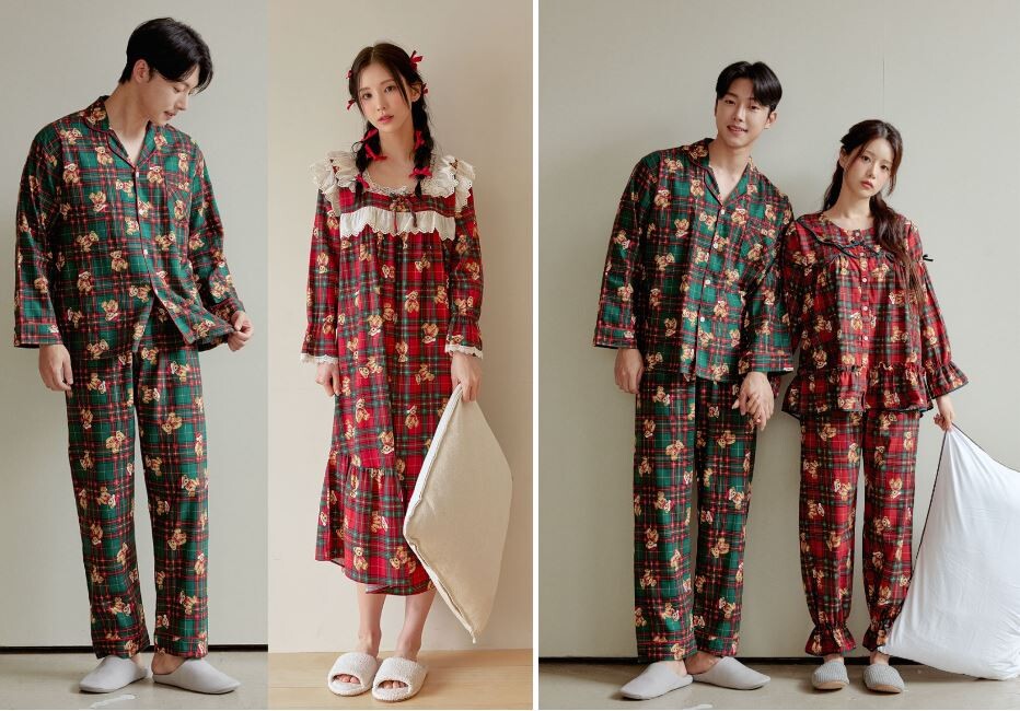 여성 남성 커플 체크베어 기모코튼 스퀘어넥 원피스 투피스 잠옷