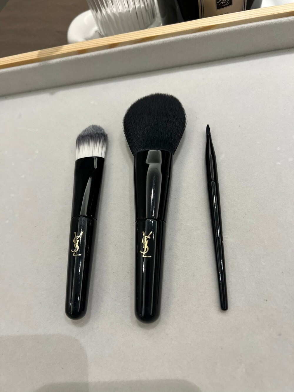 A premium 3-piece makeup brush set from YSL Beauté, designed for effortless application and sleek portability.