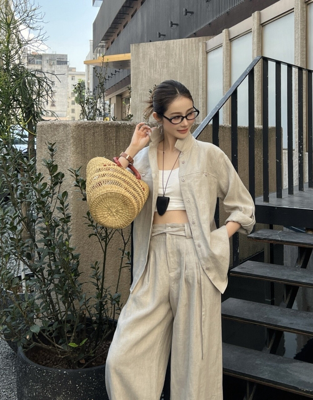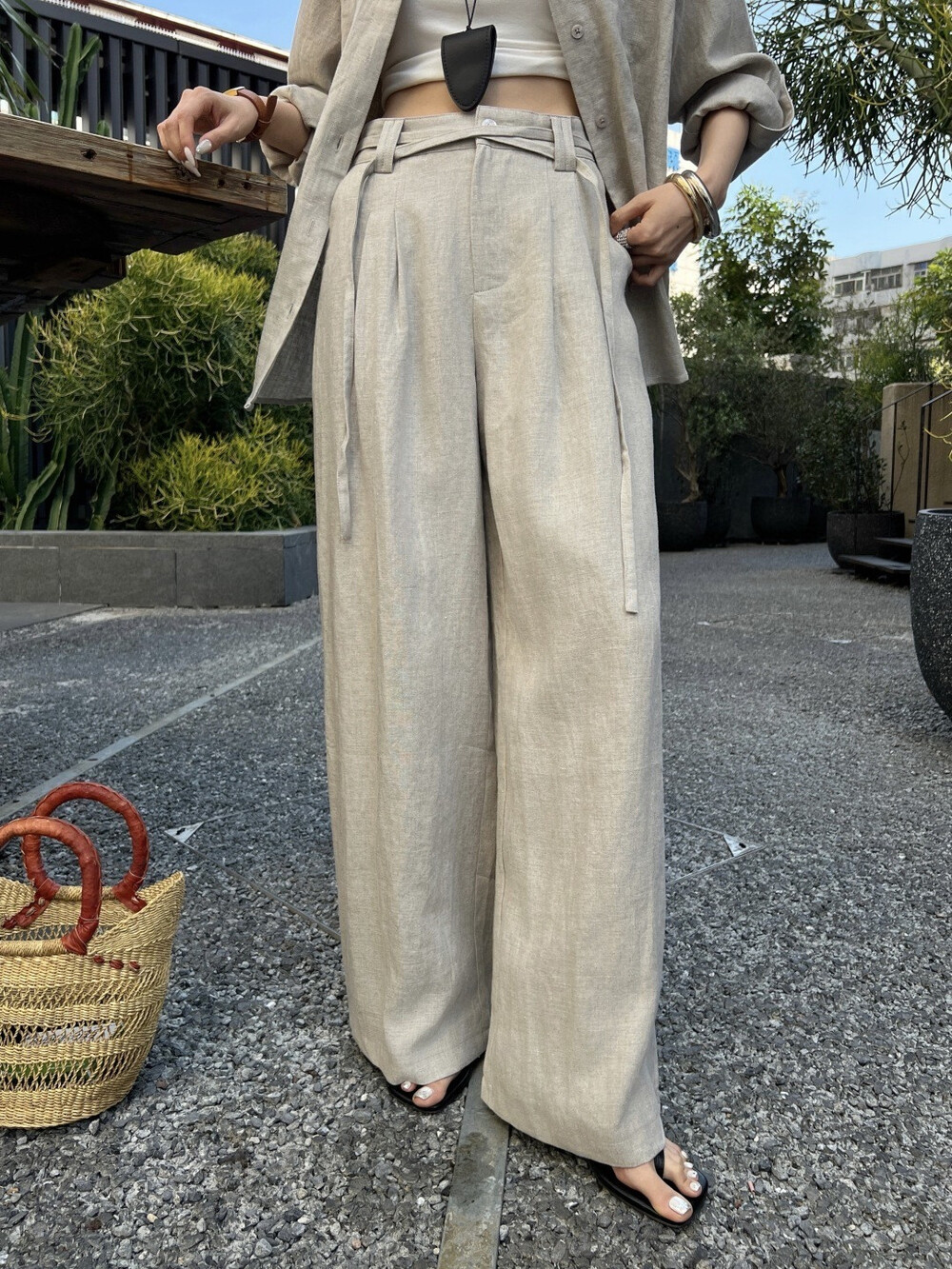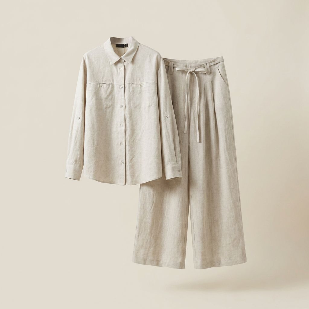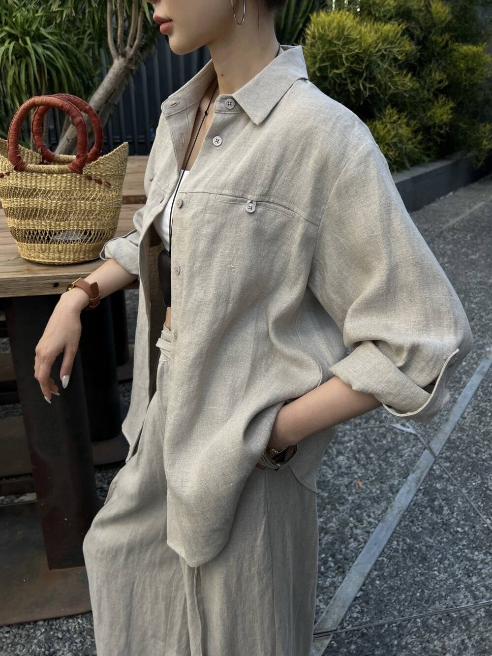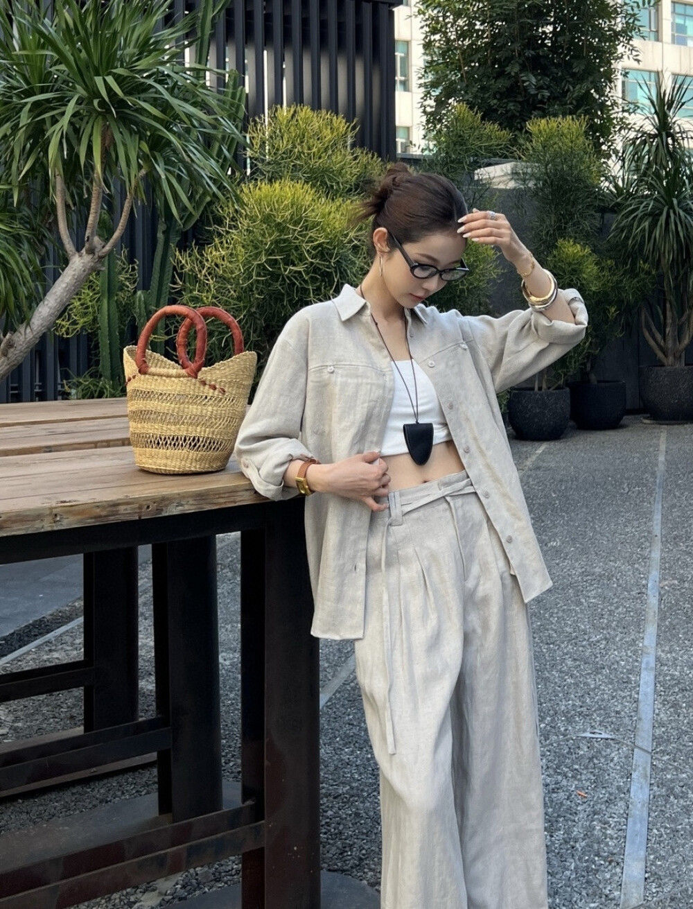 은은한 린넨 텍스처가 느껴지는 셔츠와 와이드 팬츠 셋업입니다.