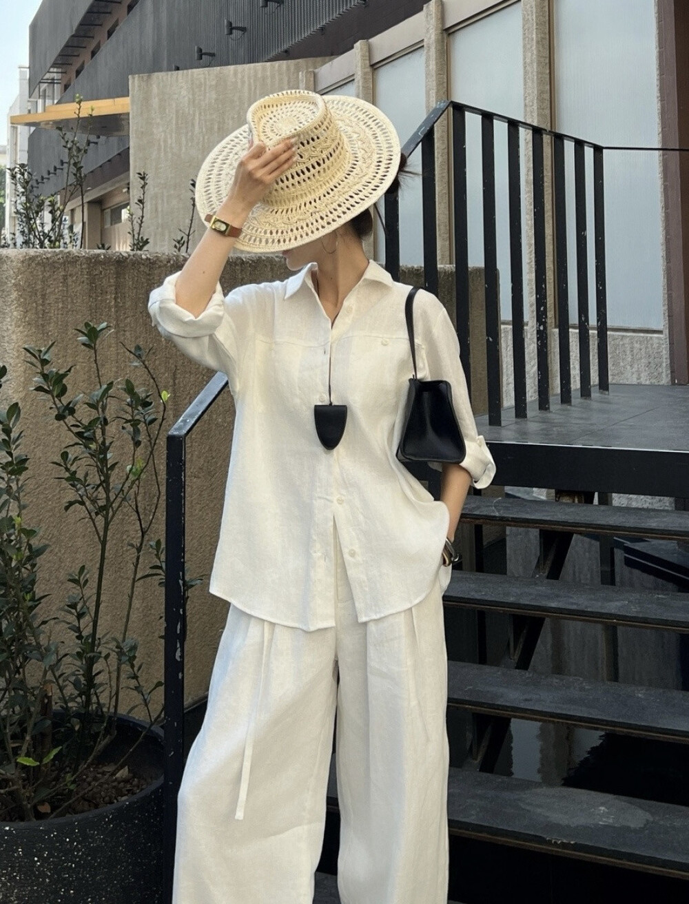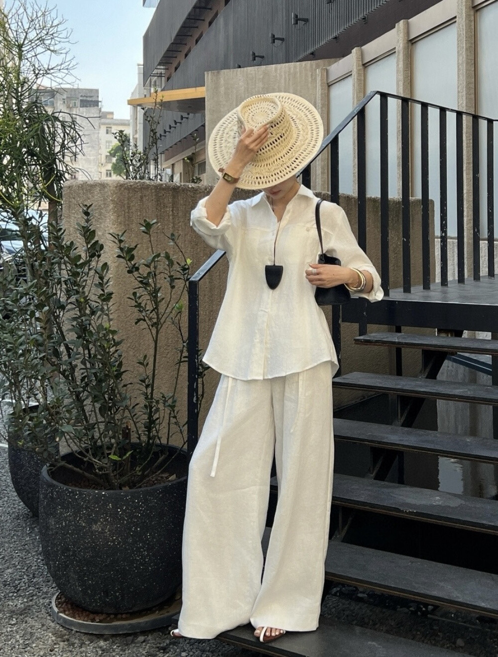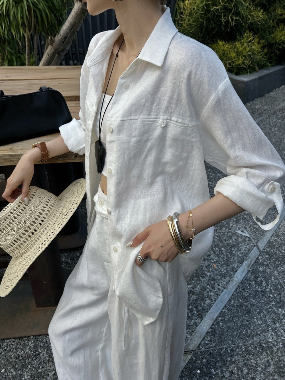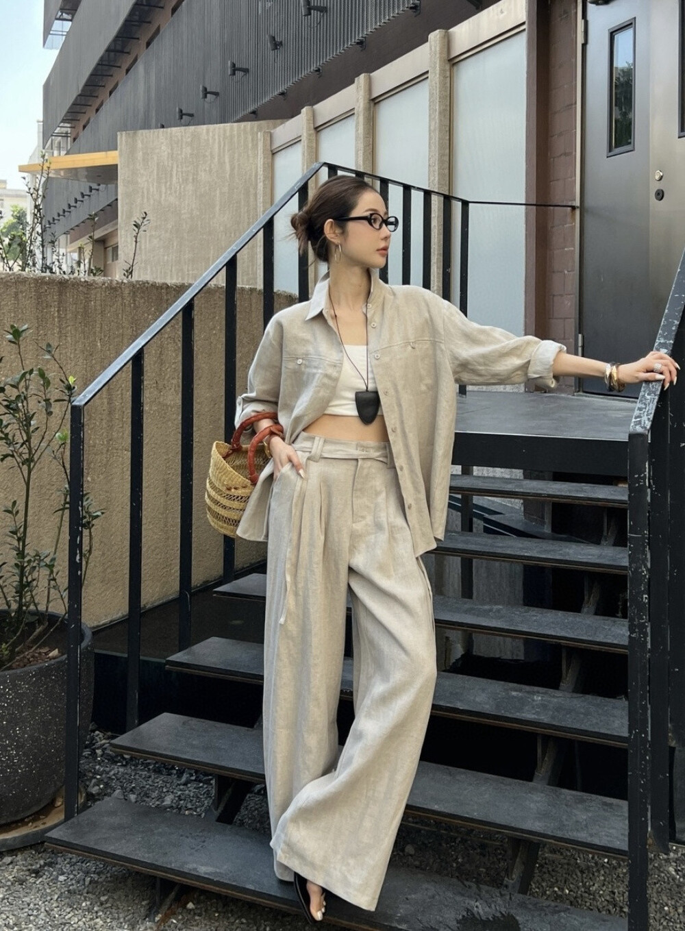 은은한 린넨 텍스처가 느껴지는 셔츠와 와이드 팬츠 셋업입니다.