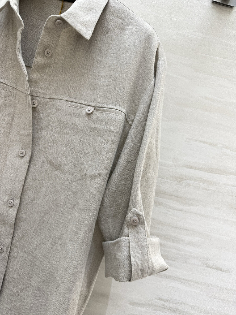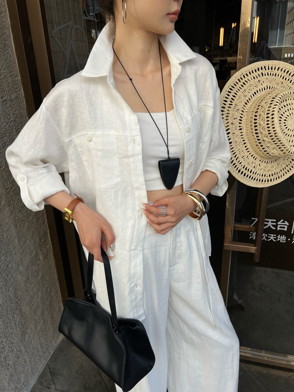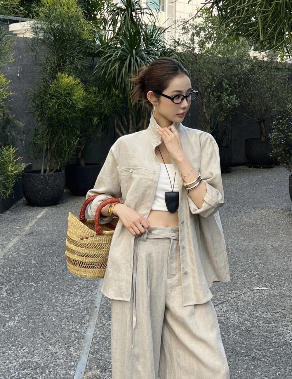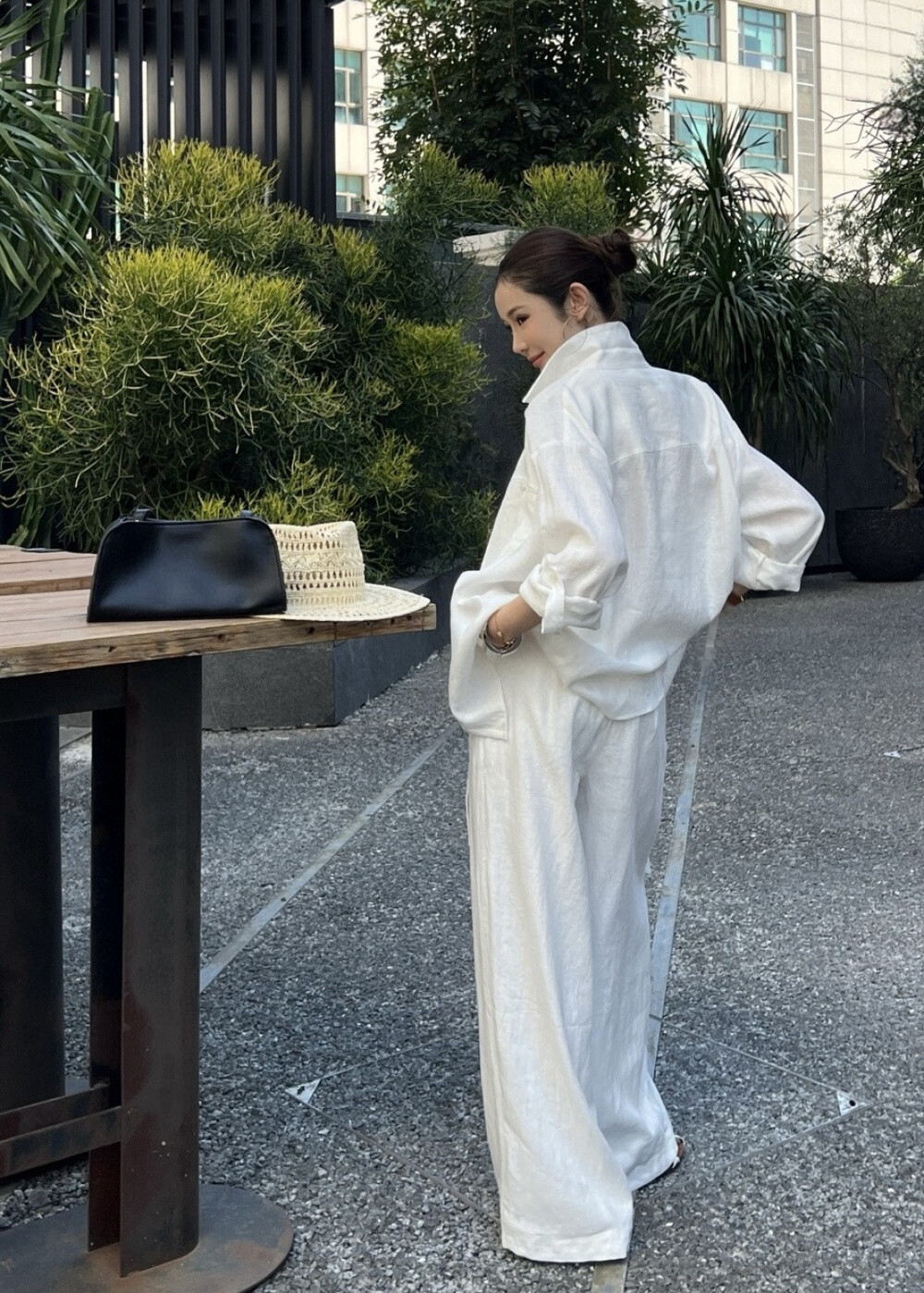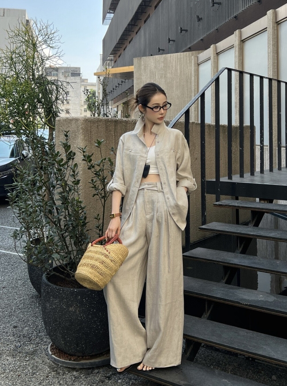 은은한 린넨 텍스처가 느껴지는 셔츠와 와이드 팬츠 셋업입니다.