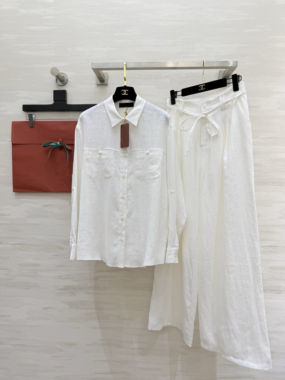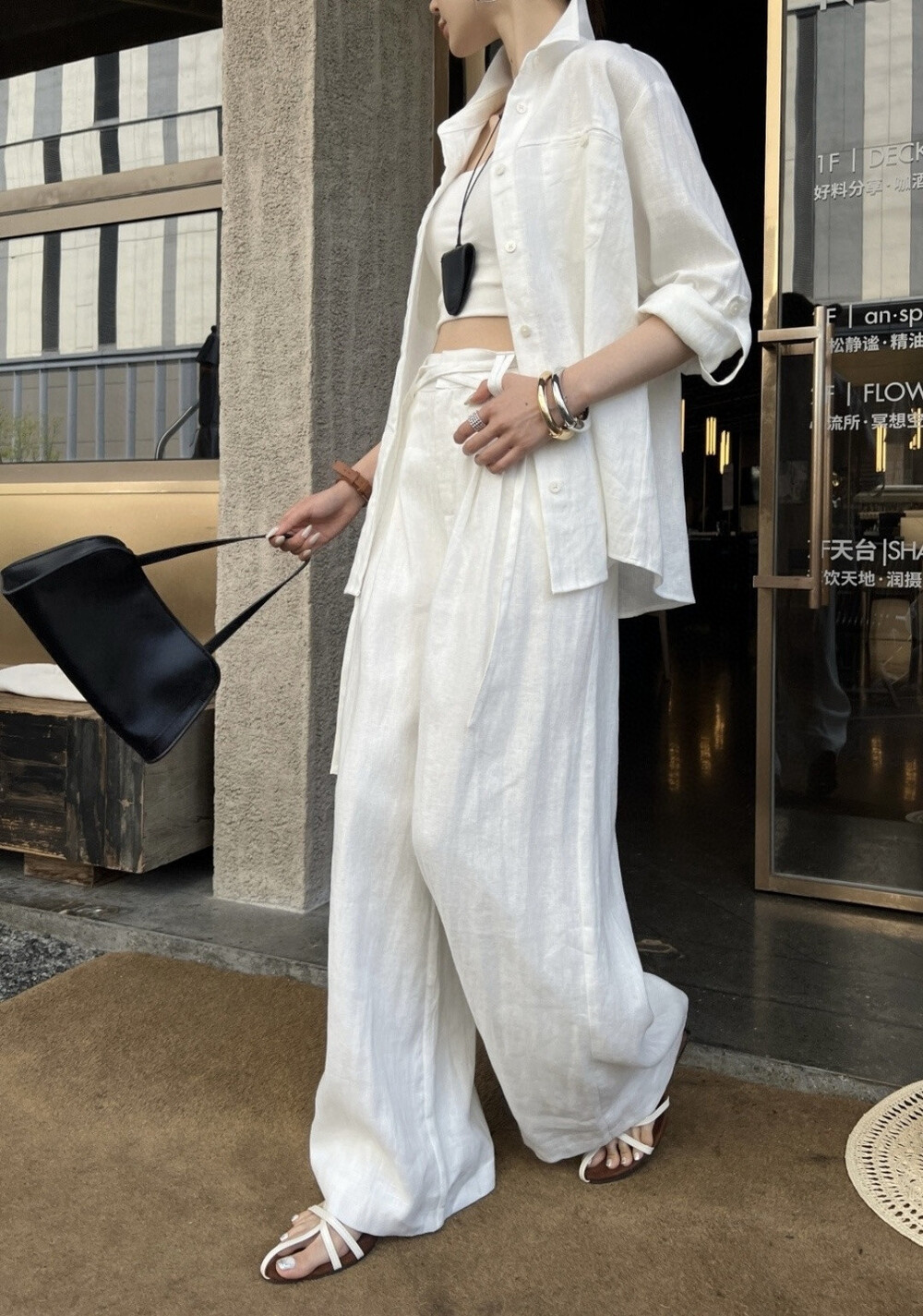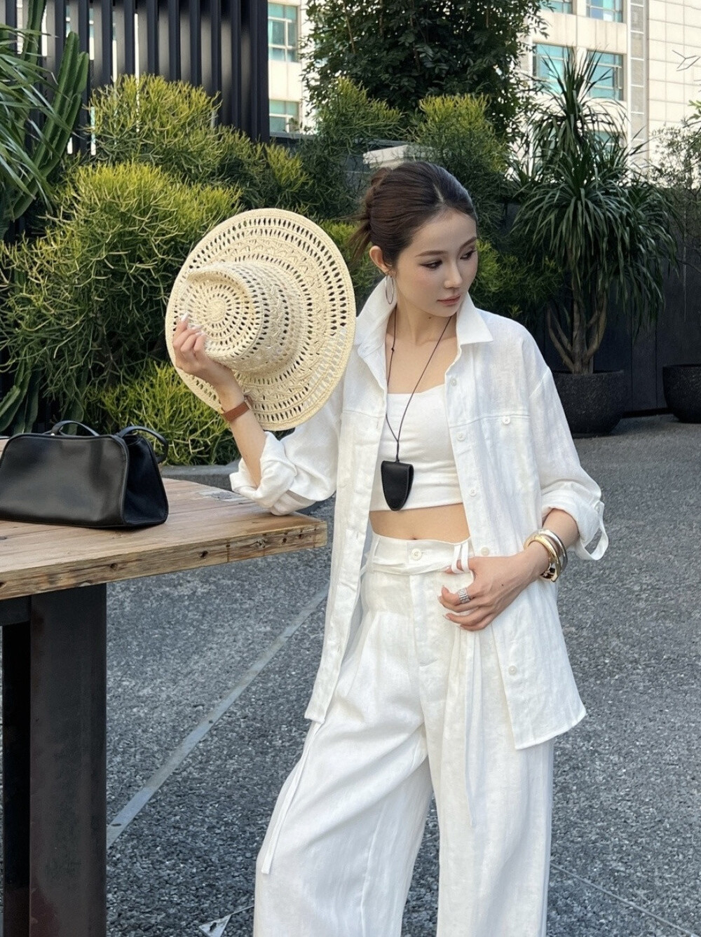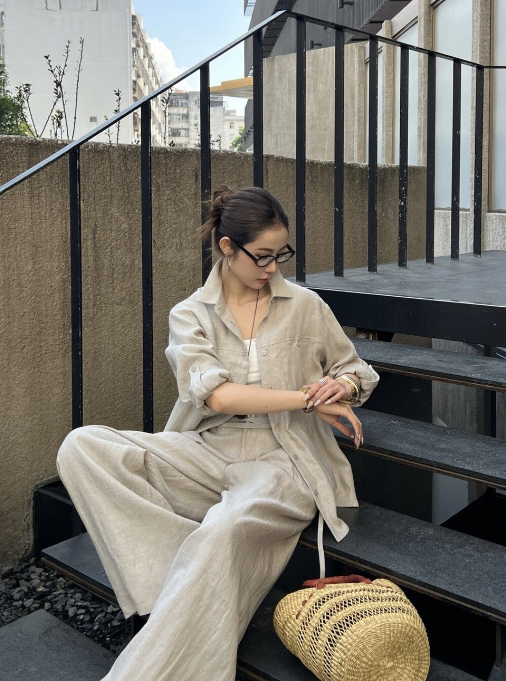 은은한 린넨 텍스처가 느껴지는 셔츠와 와이드 팬츠 셋업입니다.