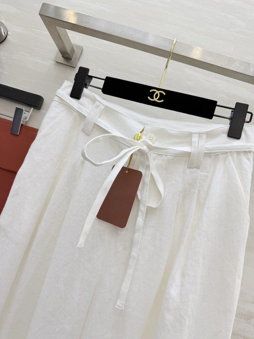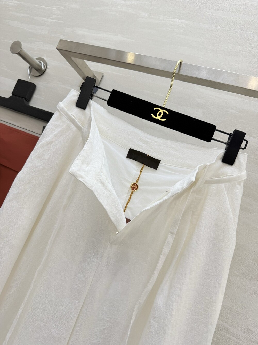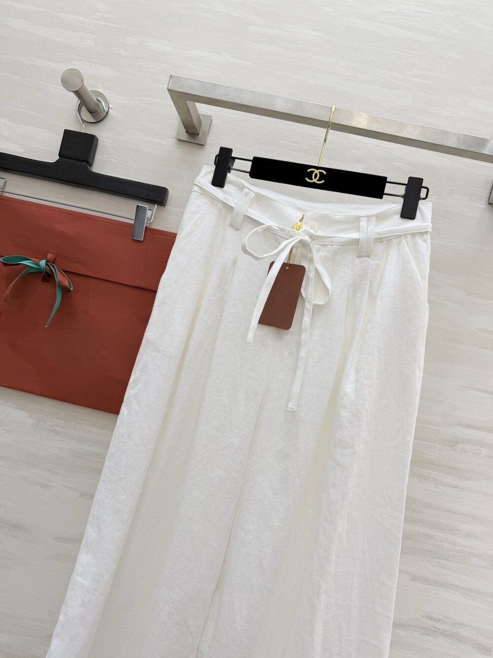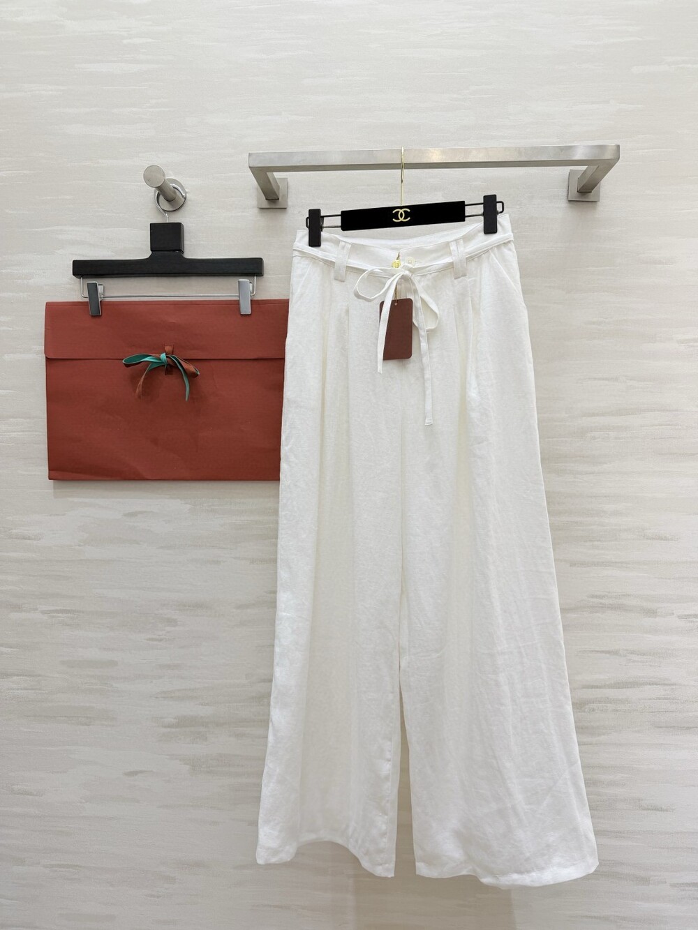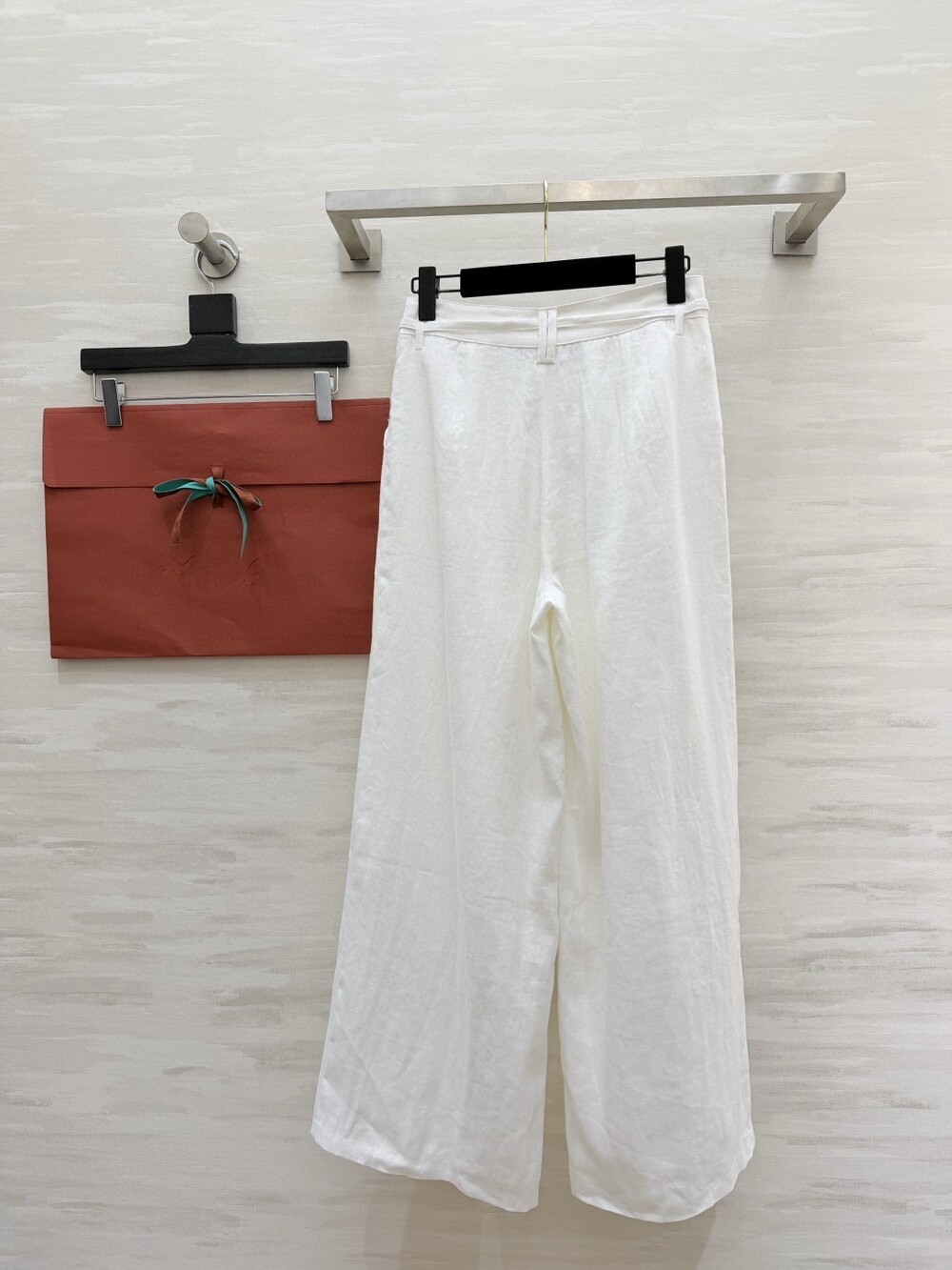 팬츠는 와이드 핏으로 다리 라인을 커버해주면서 세련된 분위기를 더해줍니다.