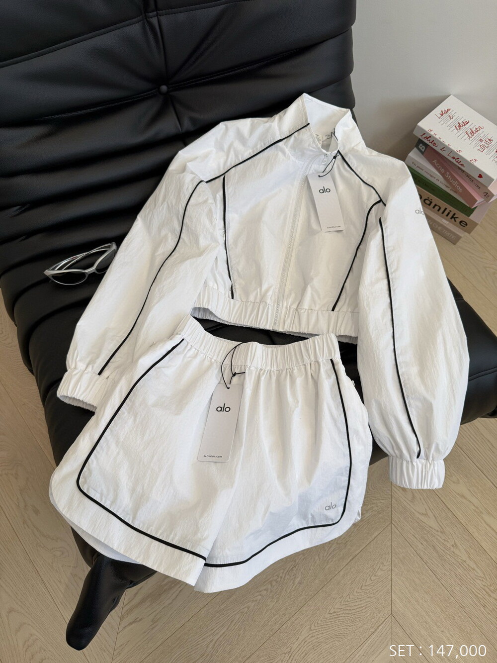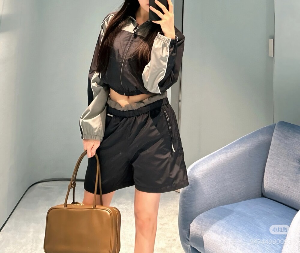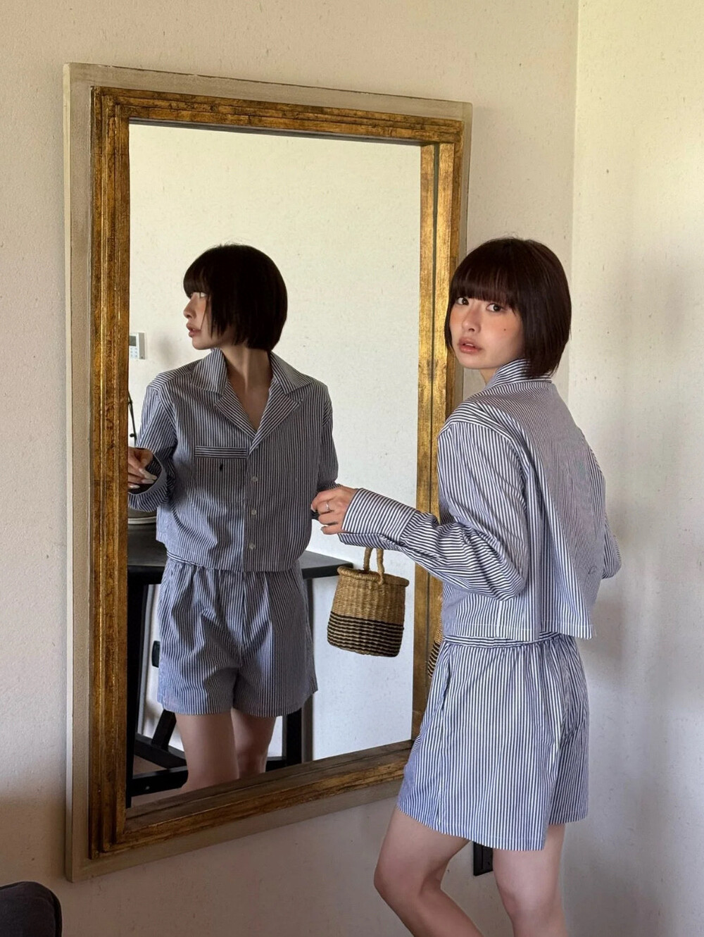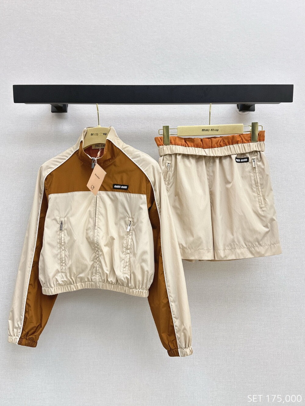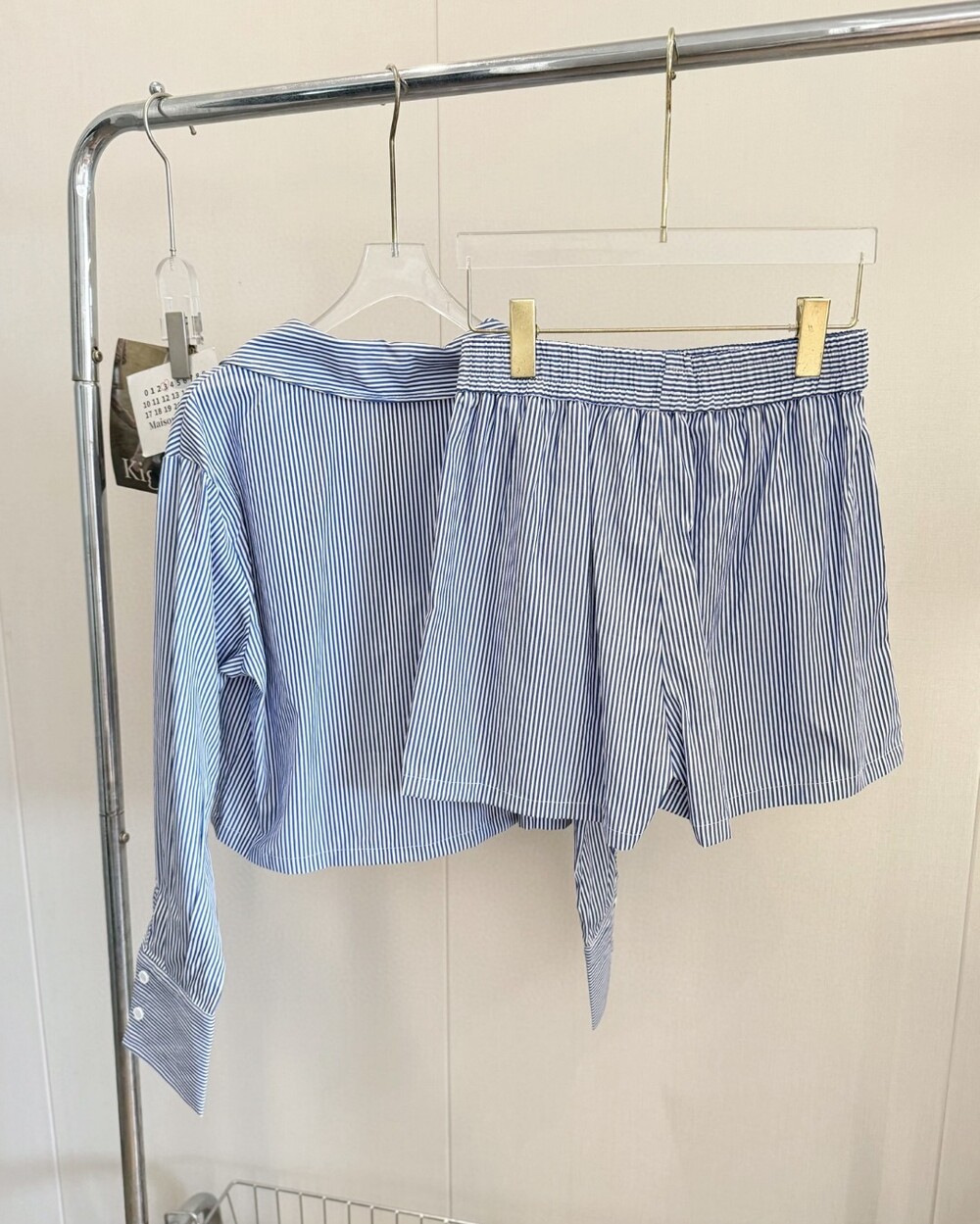K. 뮤뮤 배색 집업 셔츠 + 밴딩 하프팬츠 투피스