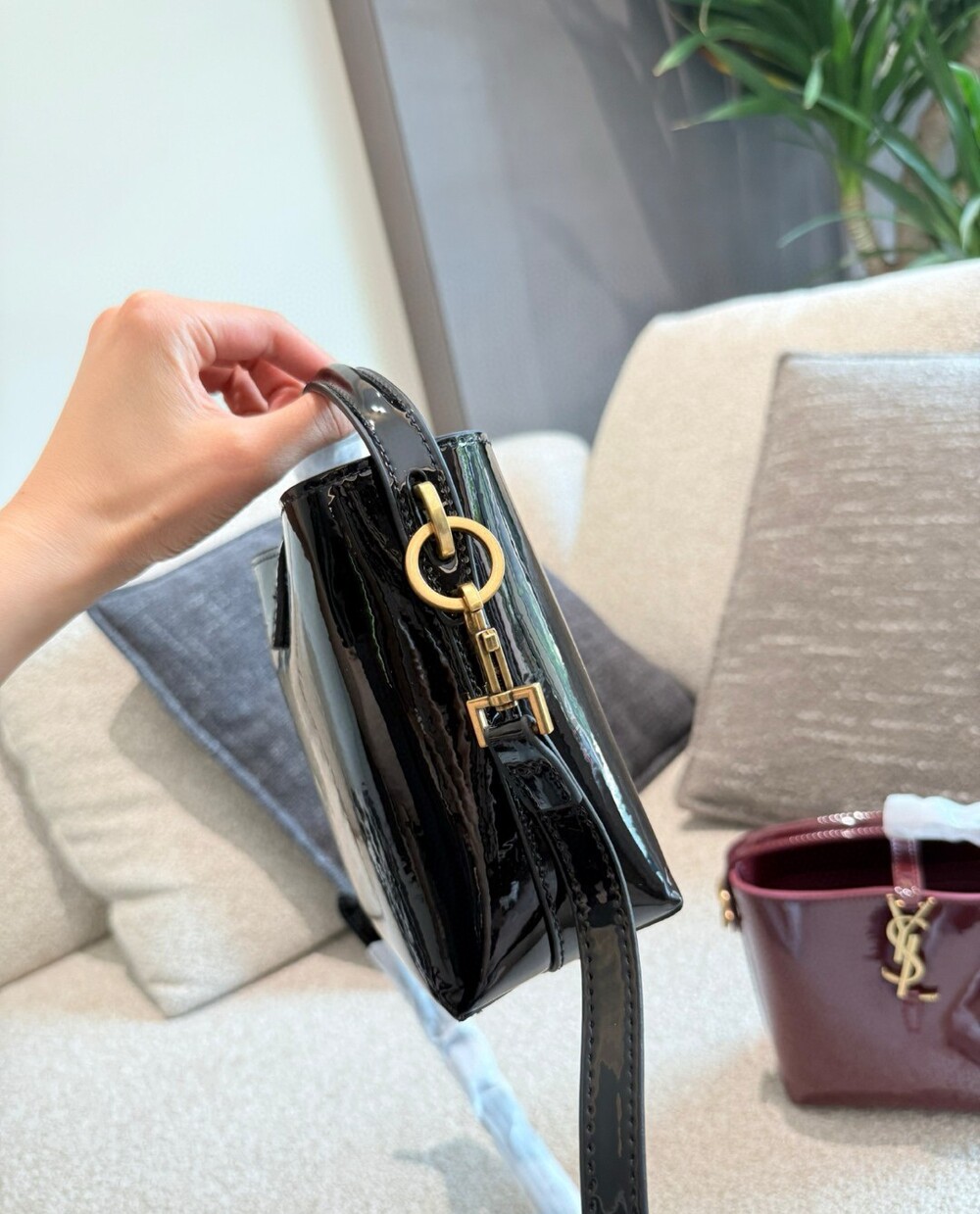 Cassandra YSL hook clasp closure at the front for a signature statement.