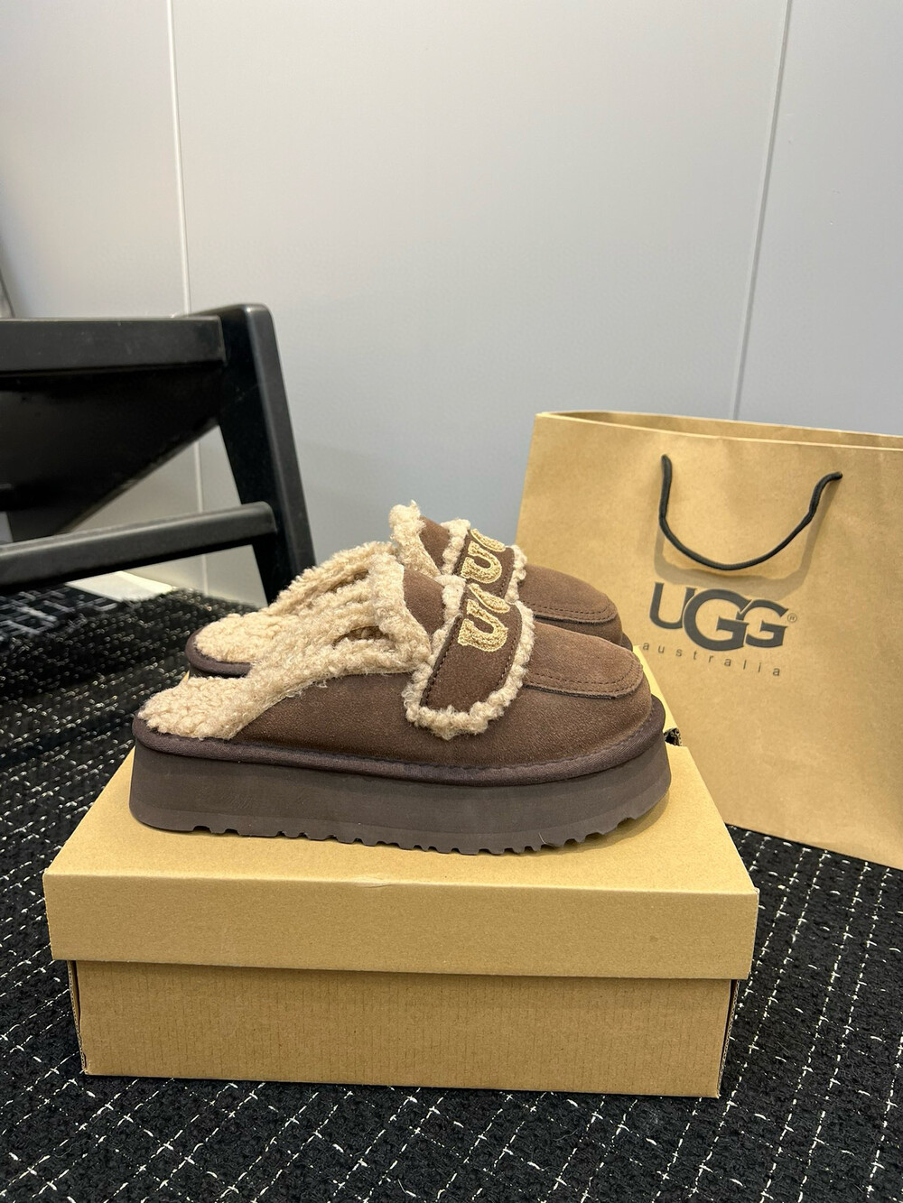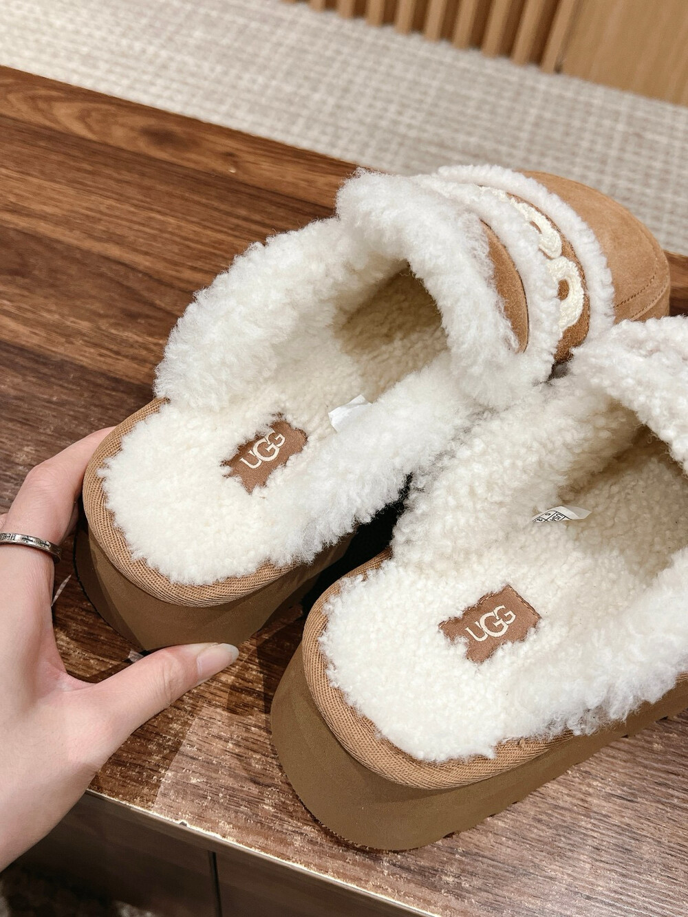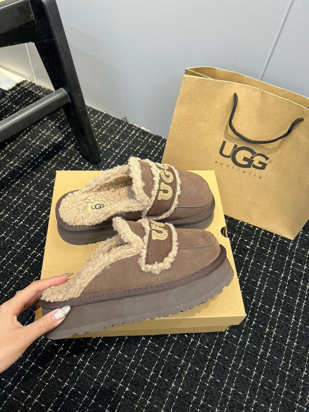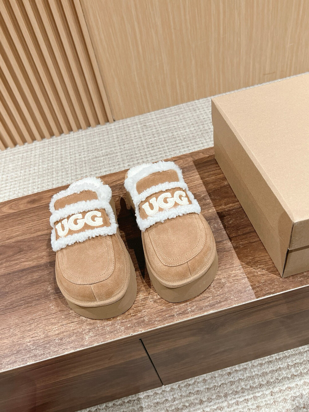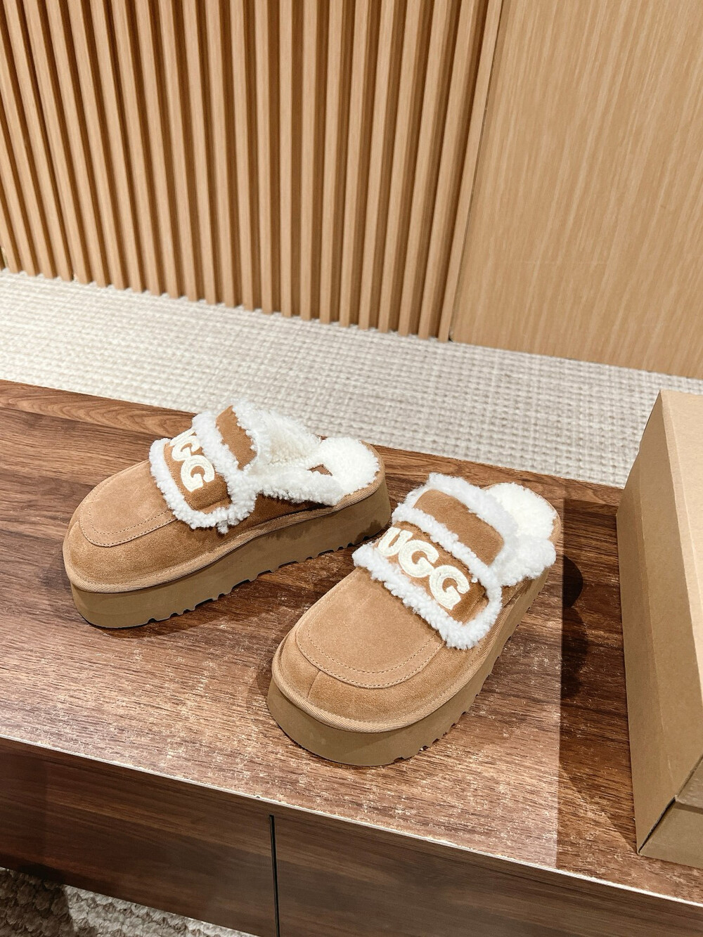 [수입] UGG 플리스 레터링 플랫폼 슬리퍼