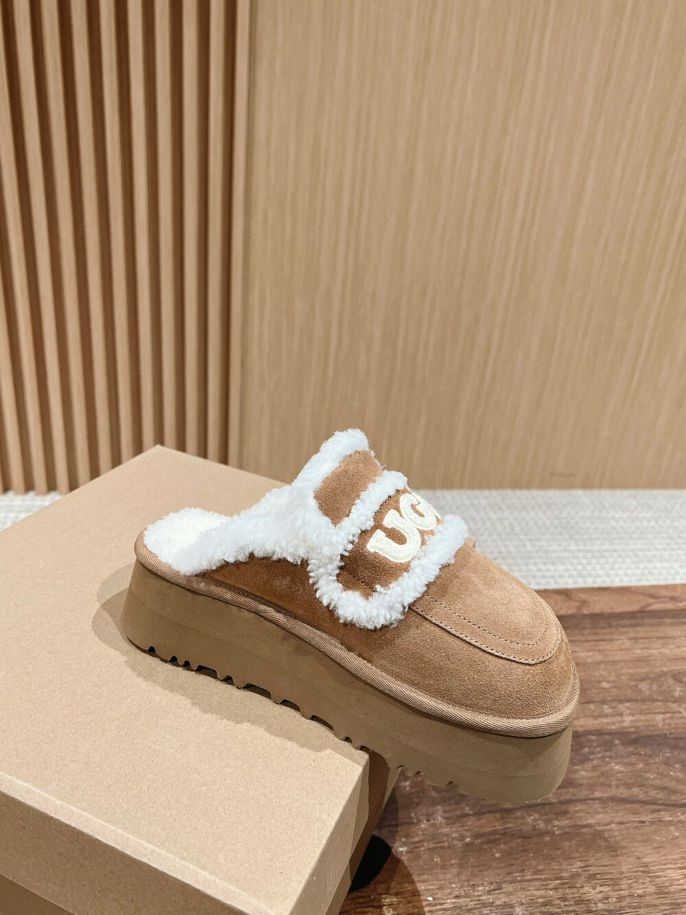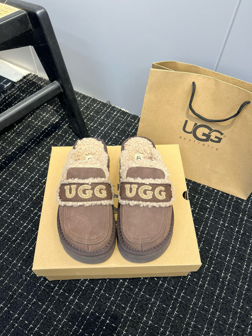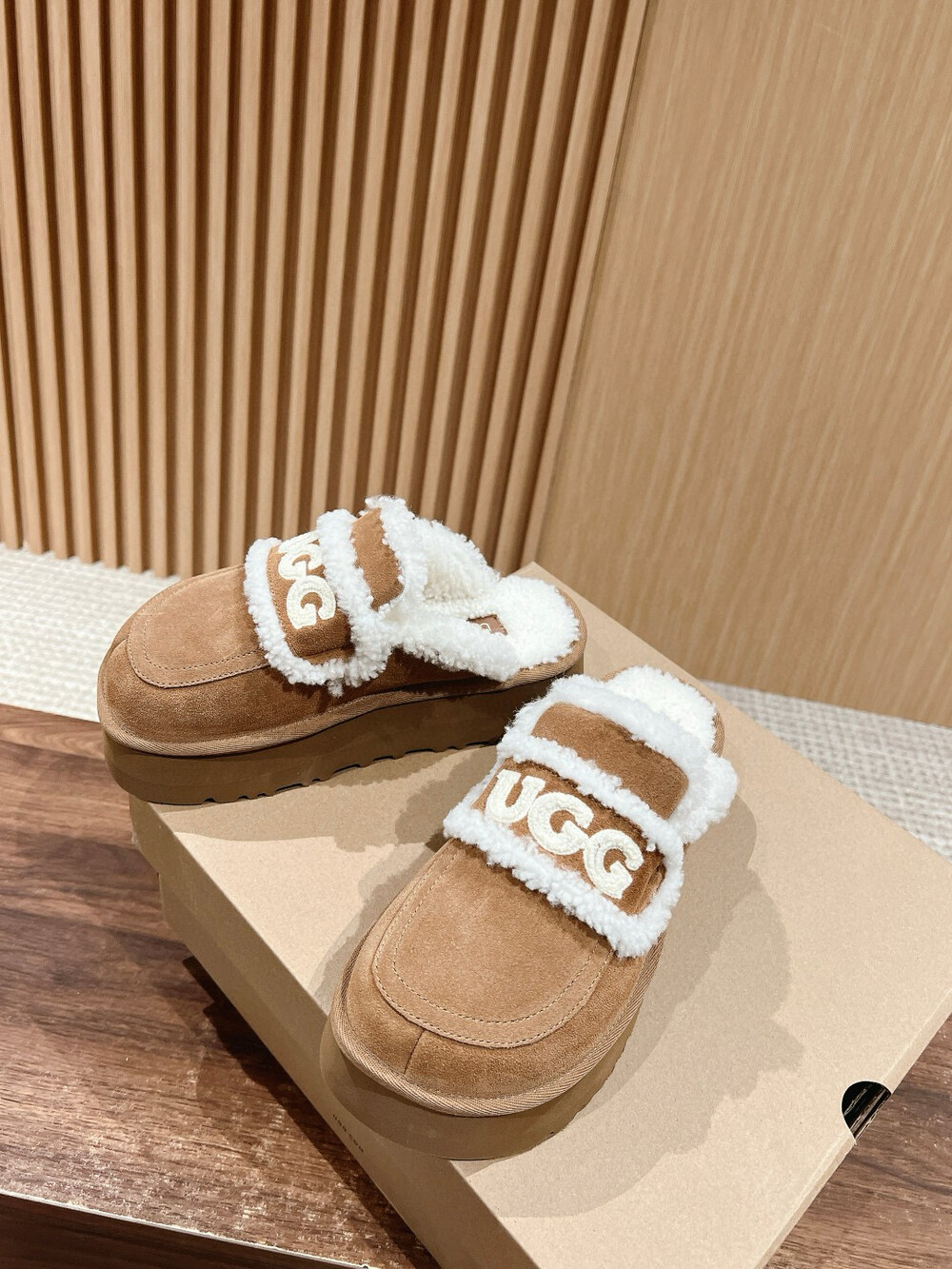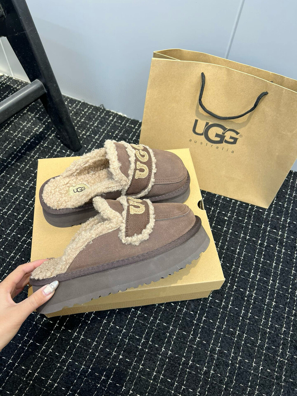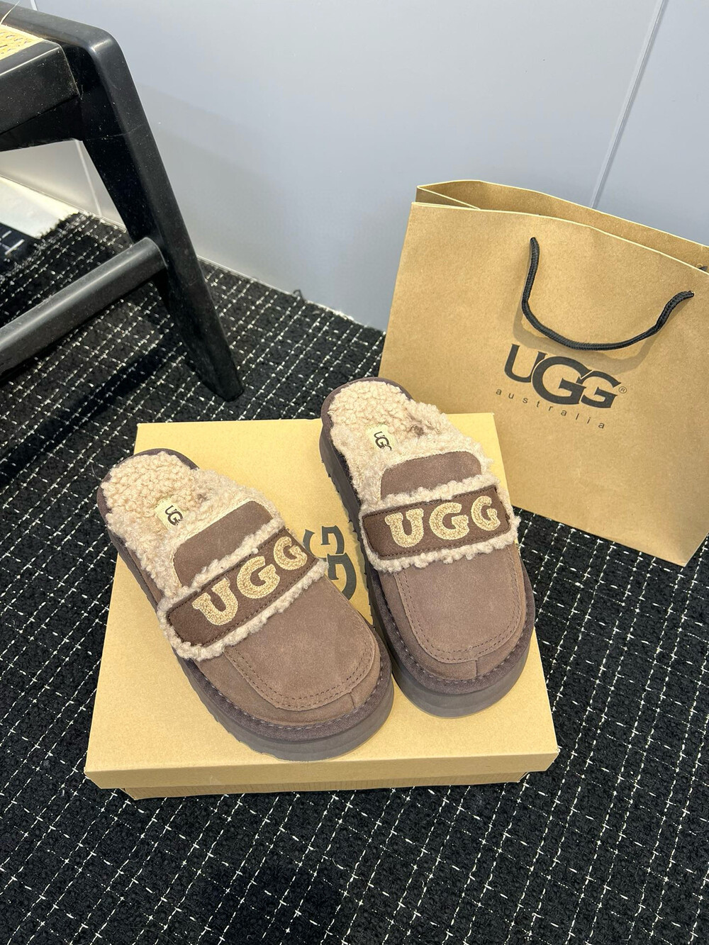 [수입] UGG 플리스 레터링 플랫폼 슬리퍼