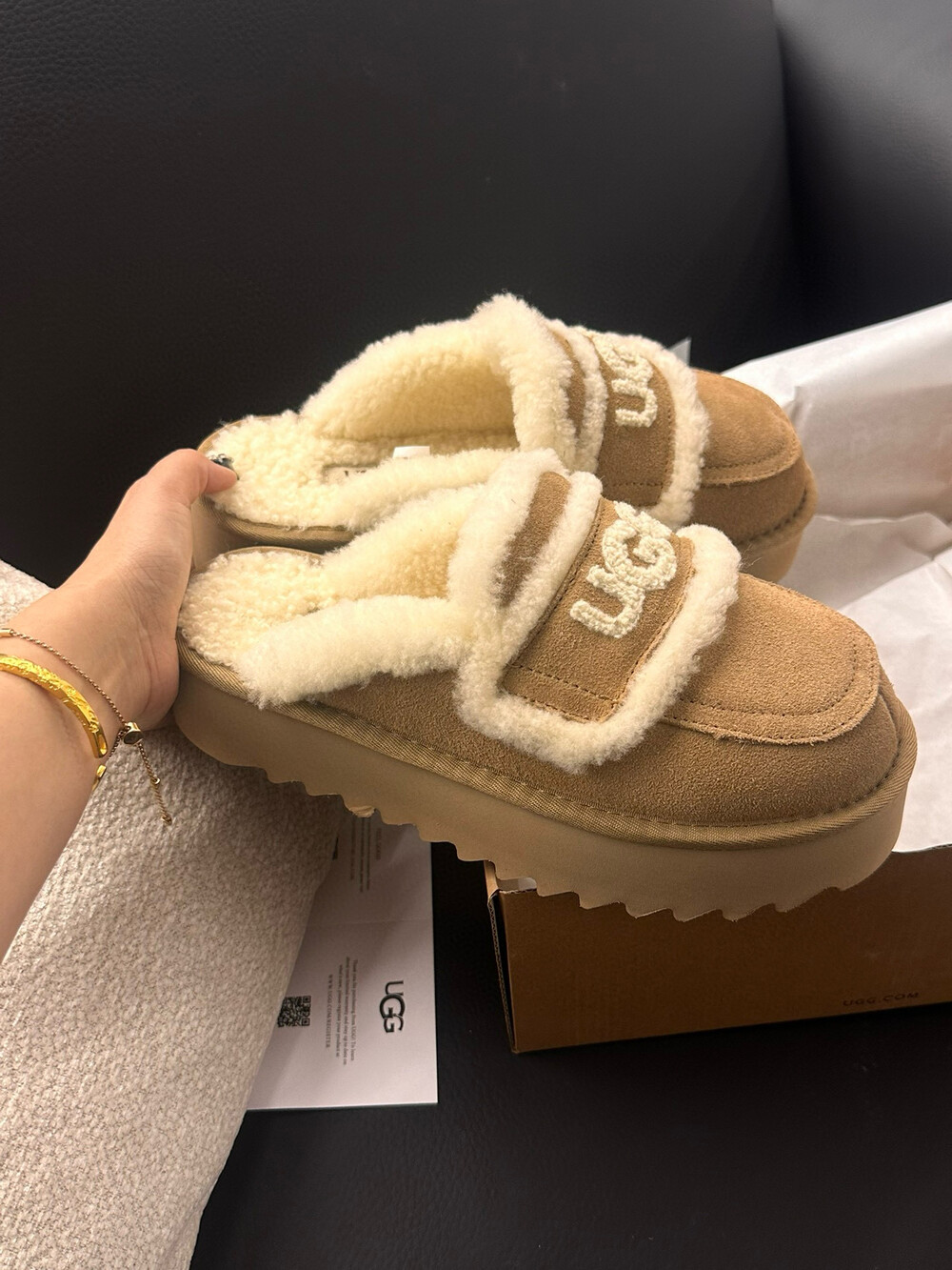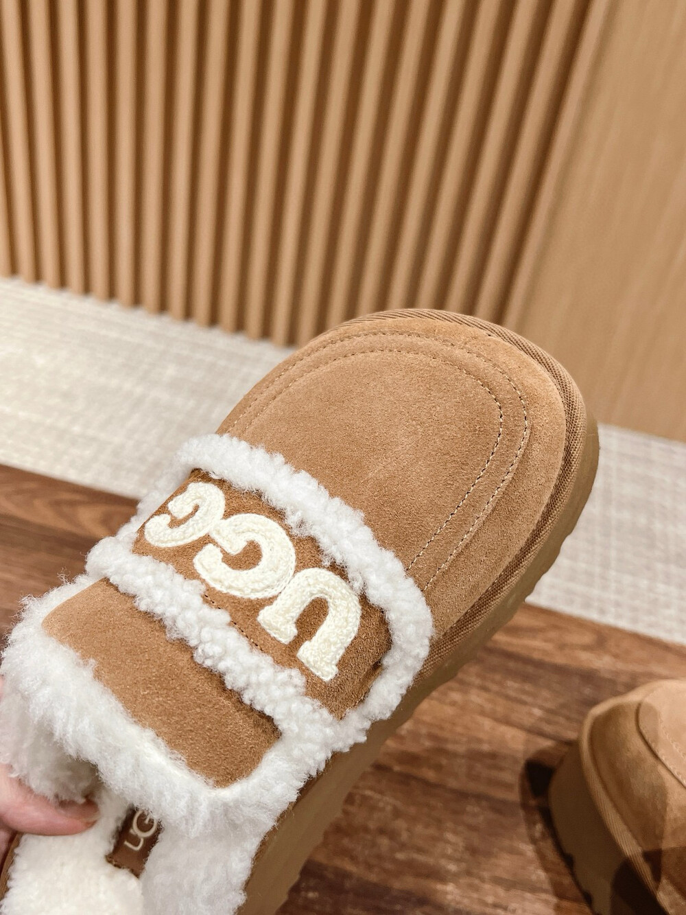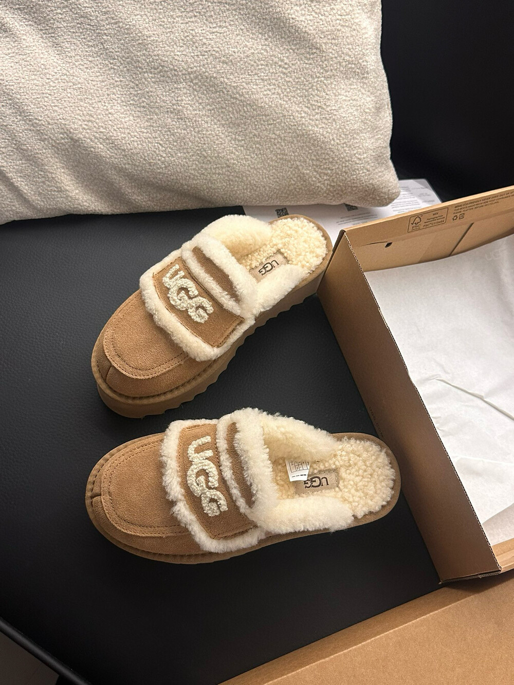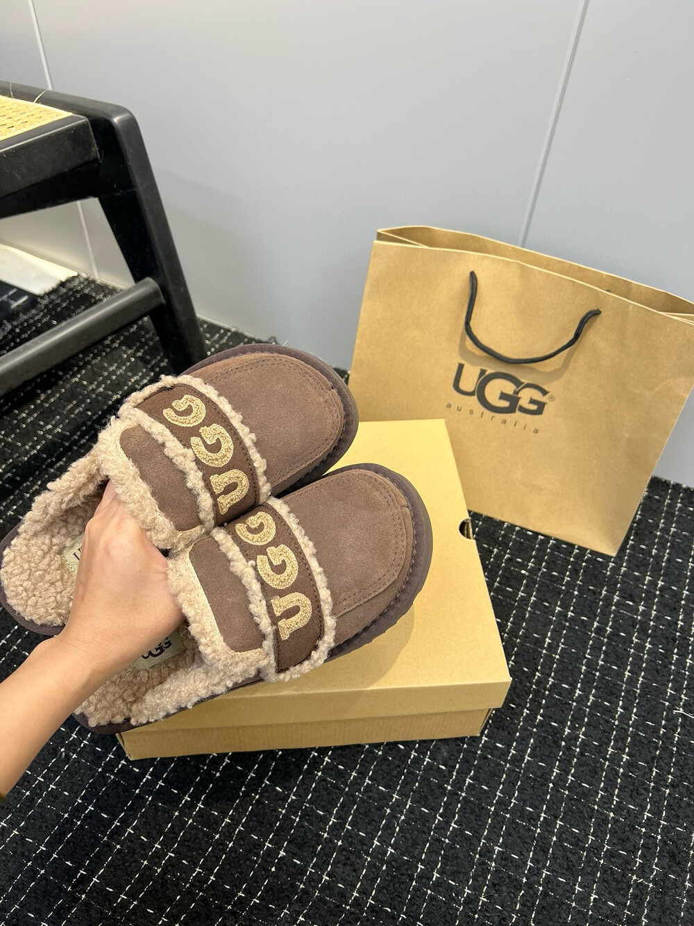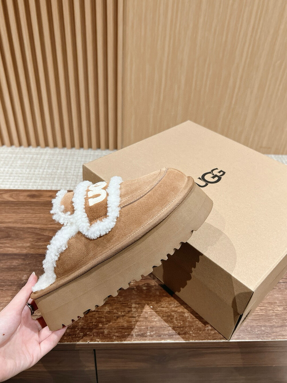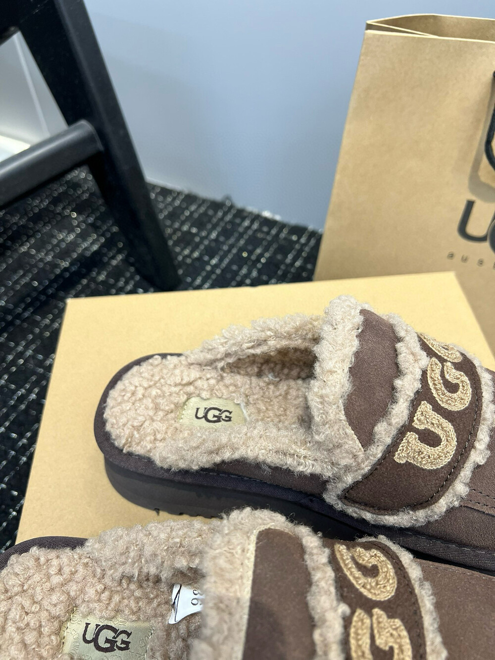 [수입] UGG 플리스 레터링 플랫폼 슬리퍼