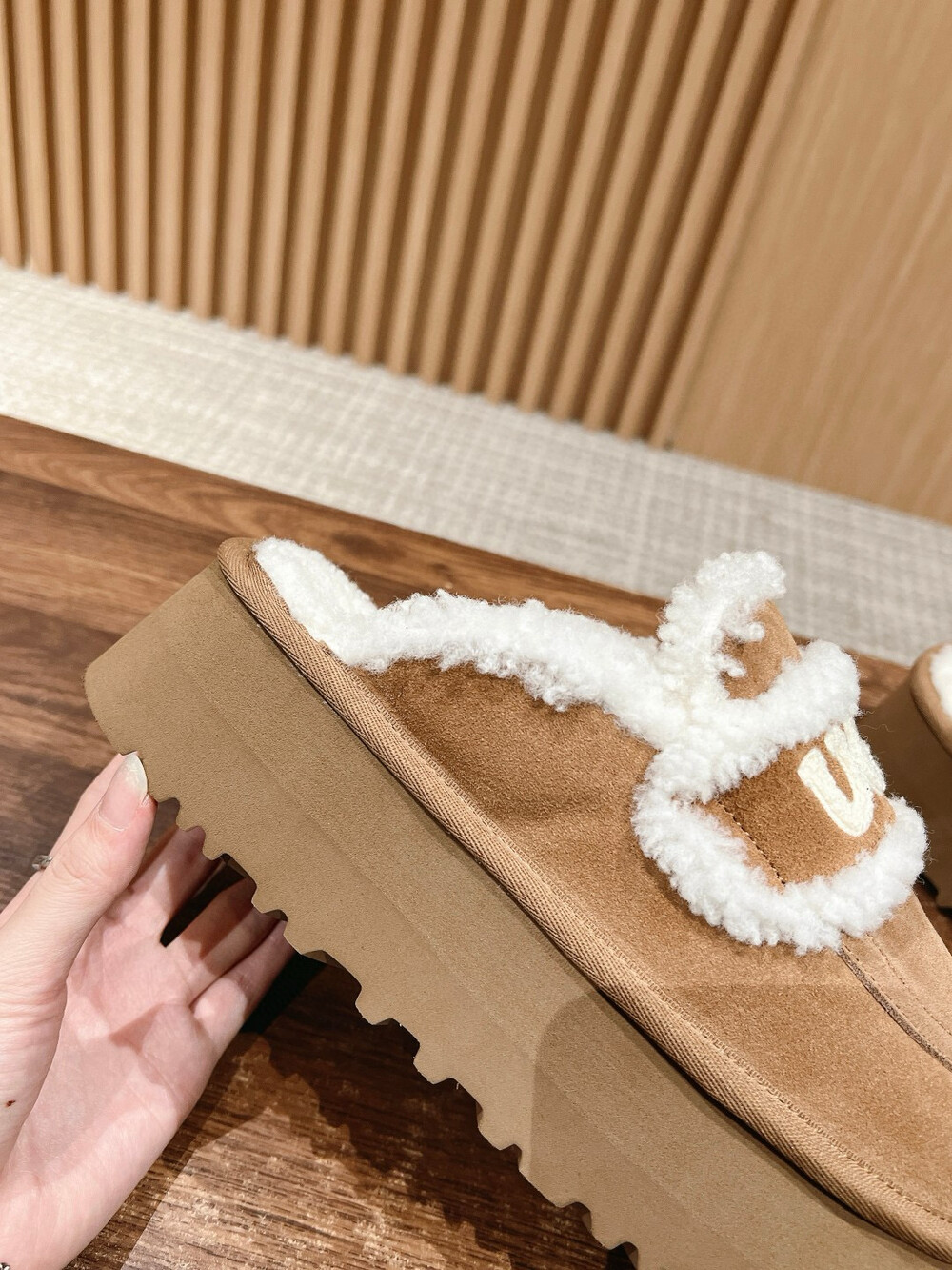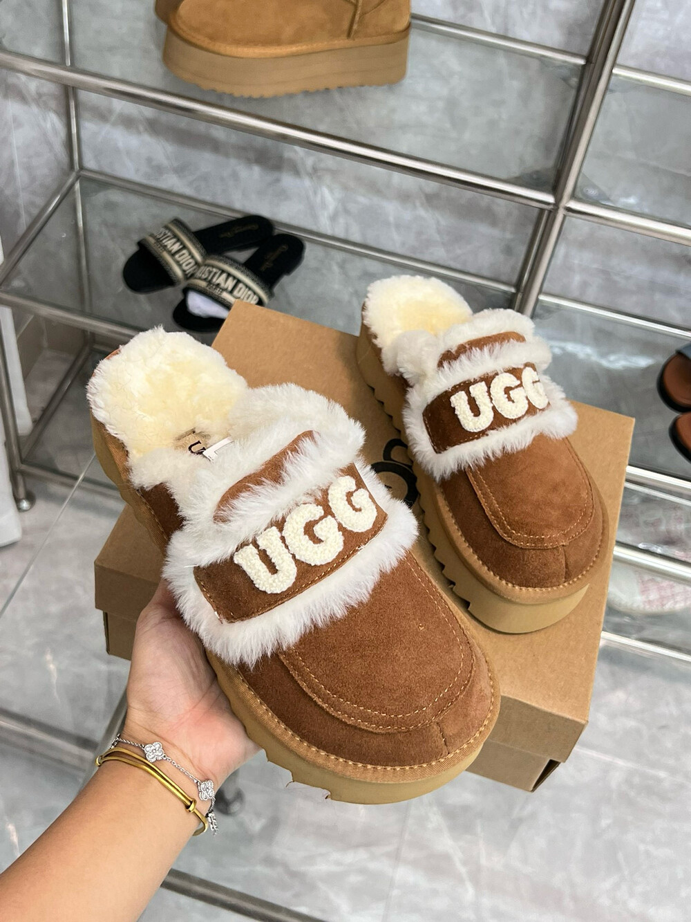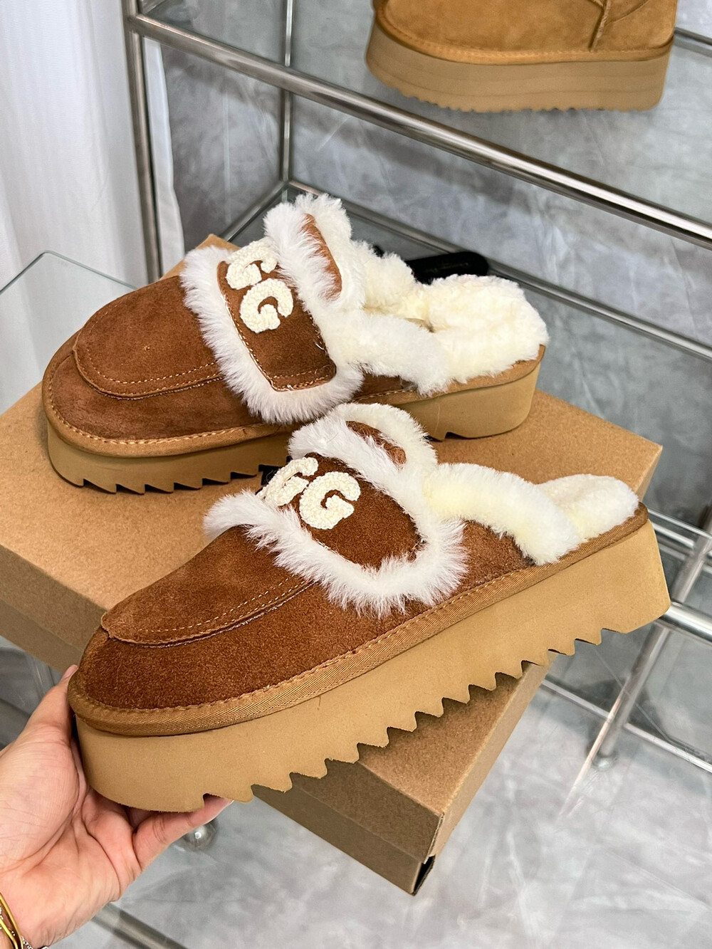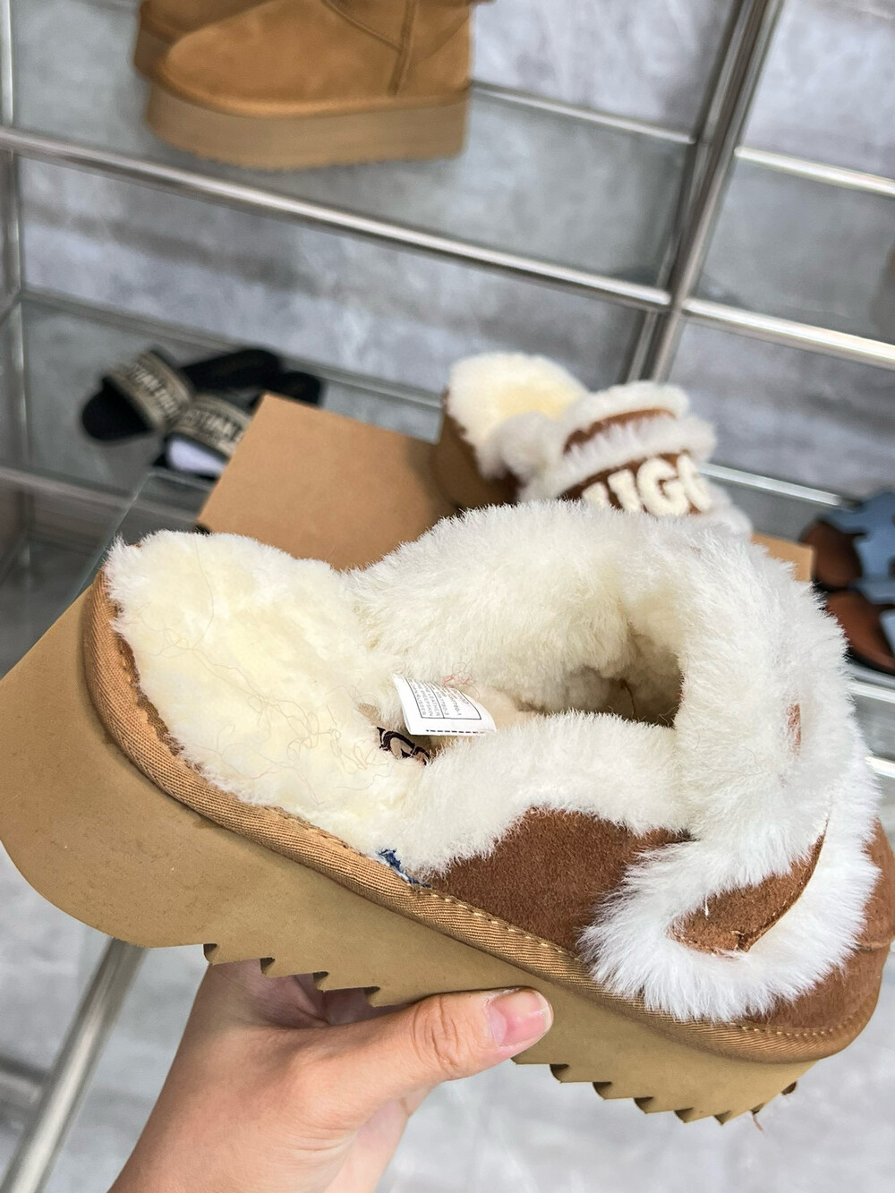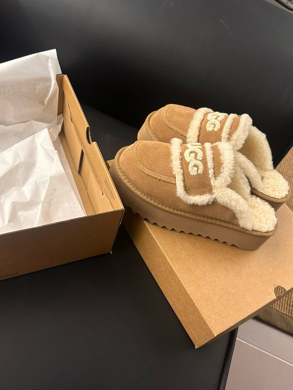 [수입] UGG 플리스 레터링 플랫폼 슬리퍼