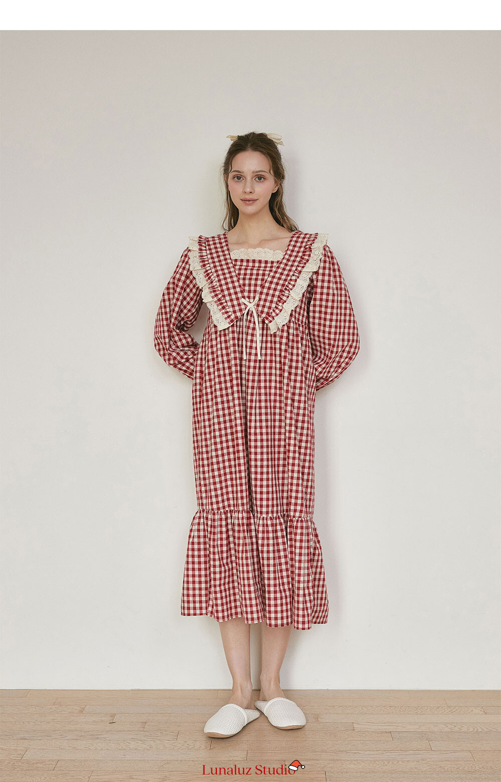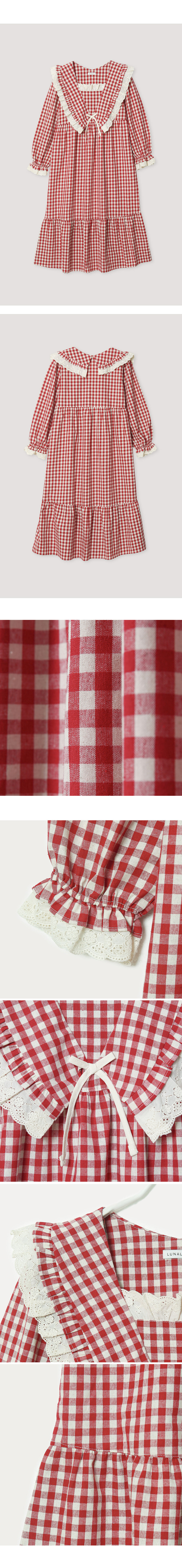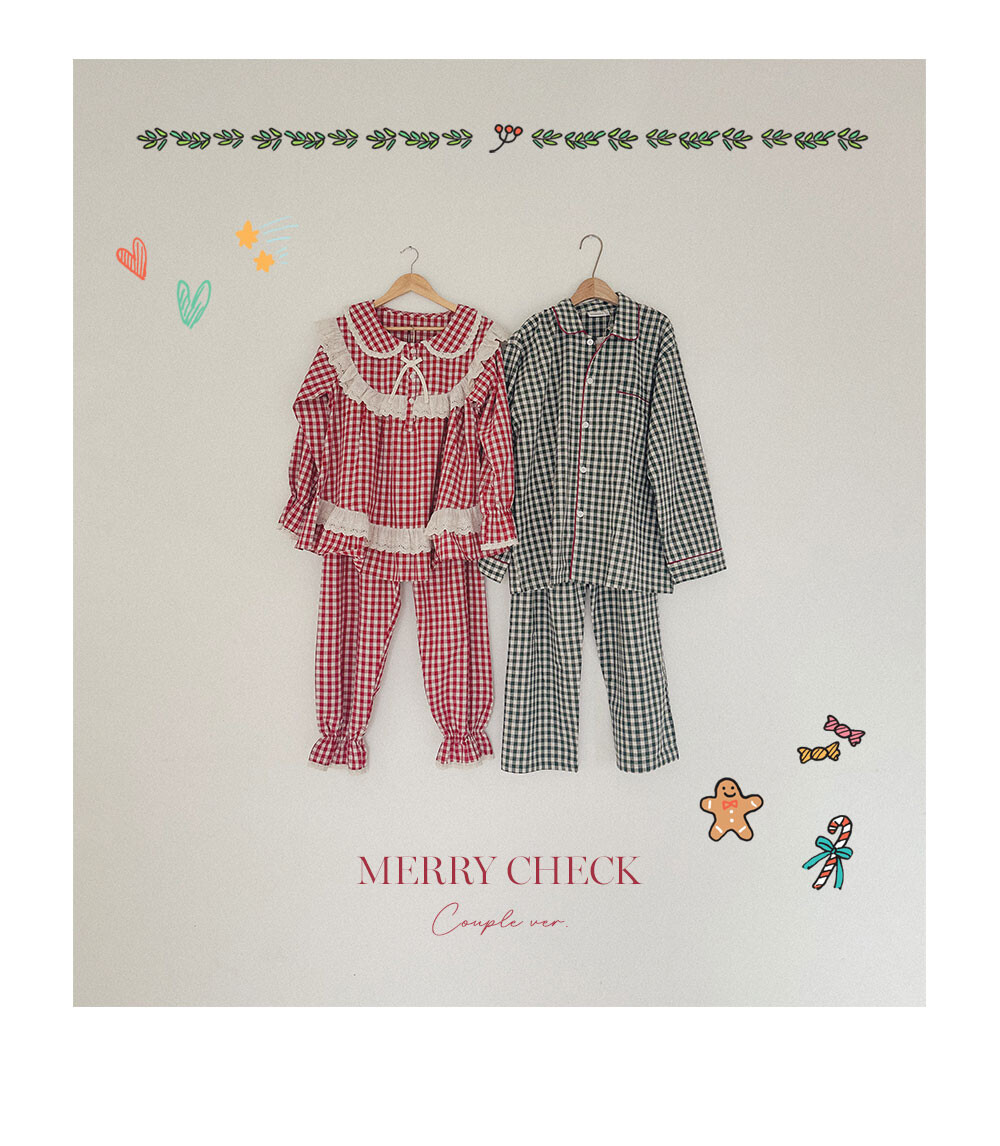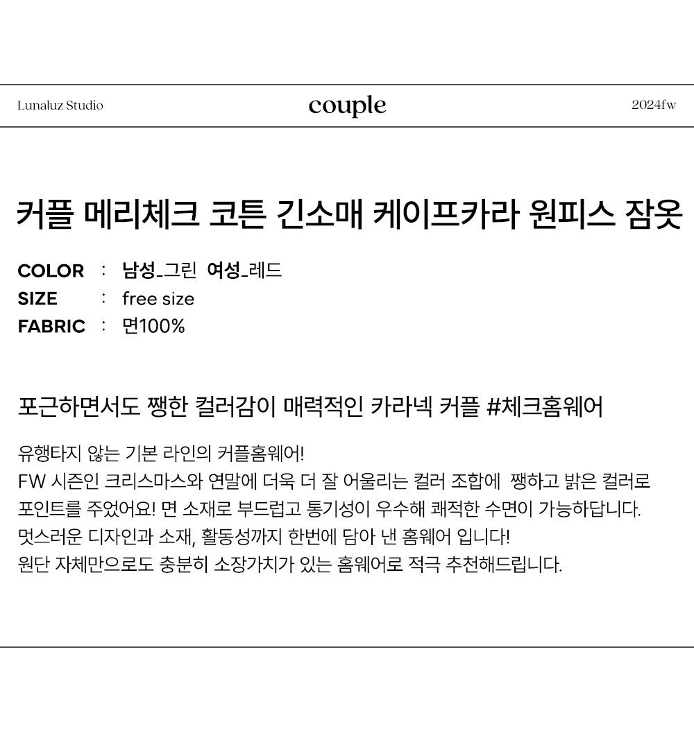 커플 메리체크 코튼 긴소매 케이프카라 원피스 잠옷