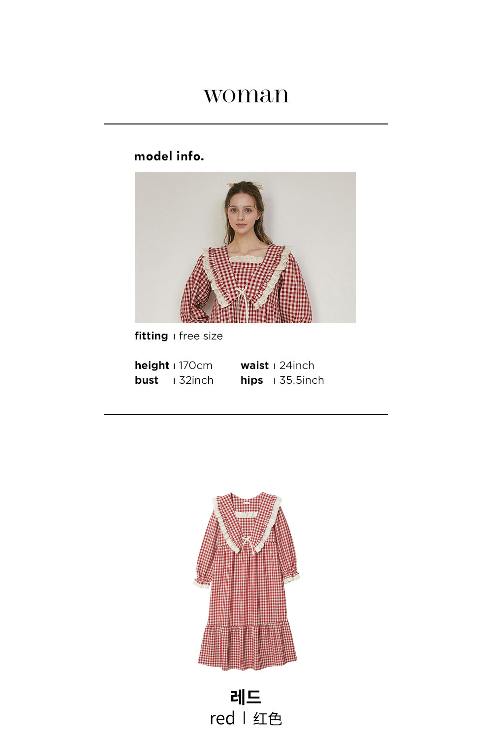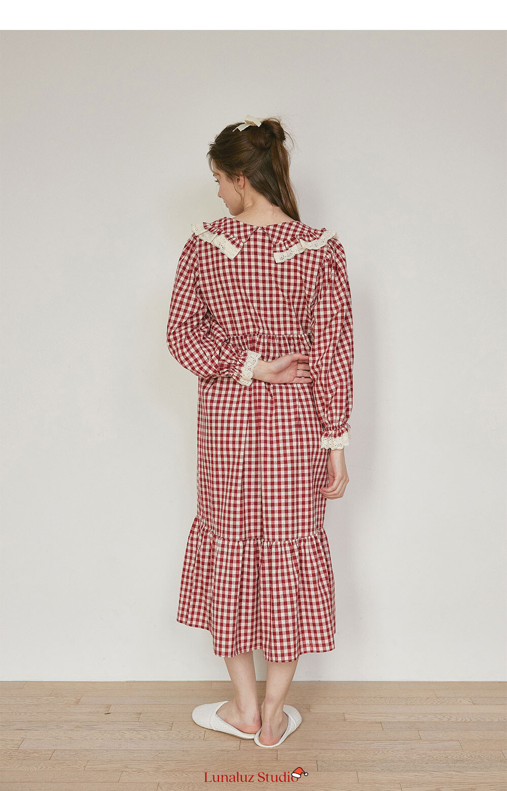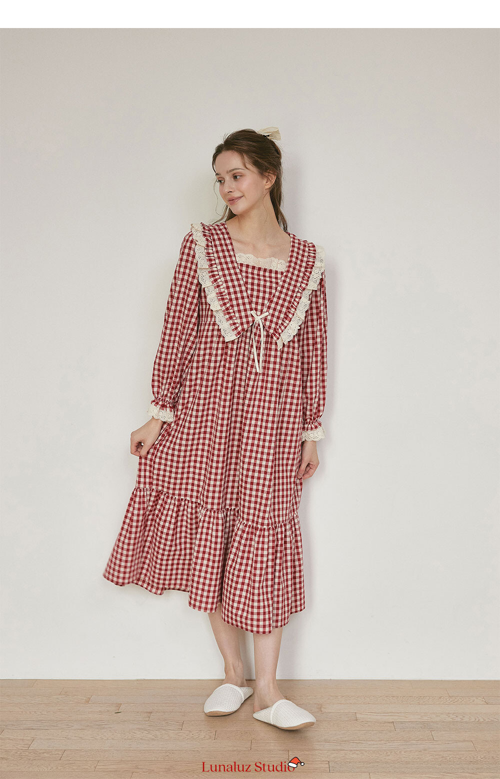 커플 메리체크 코튼 긴소매 케이프카라 원피스 잠옷