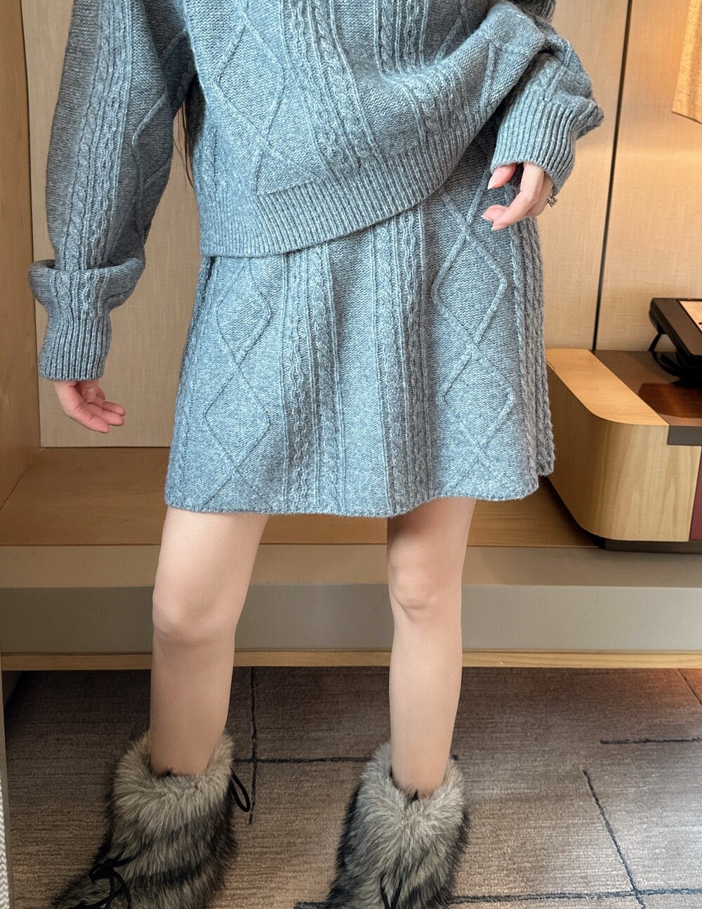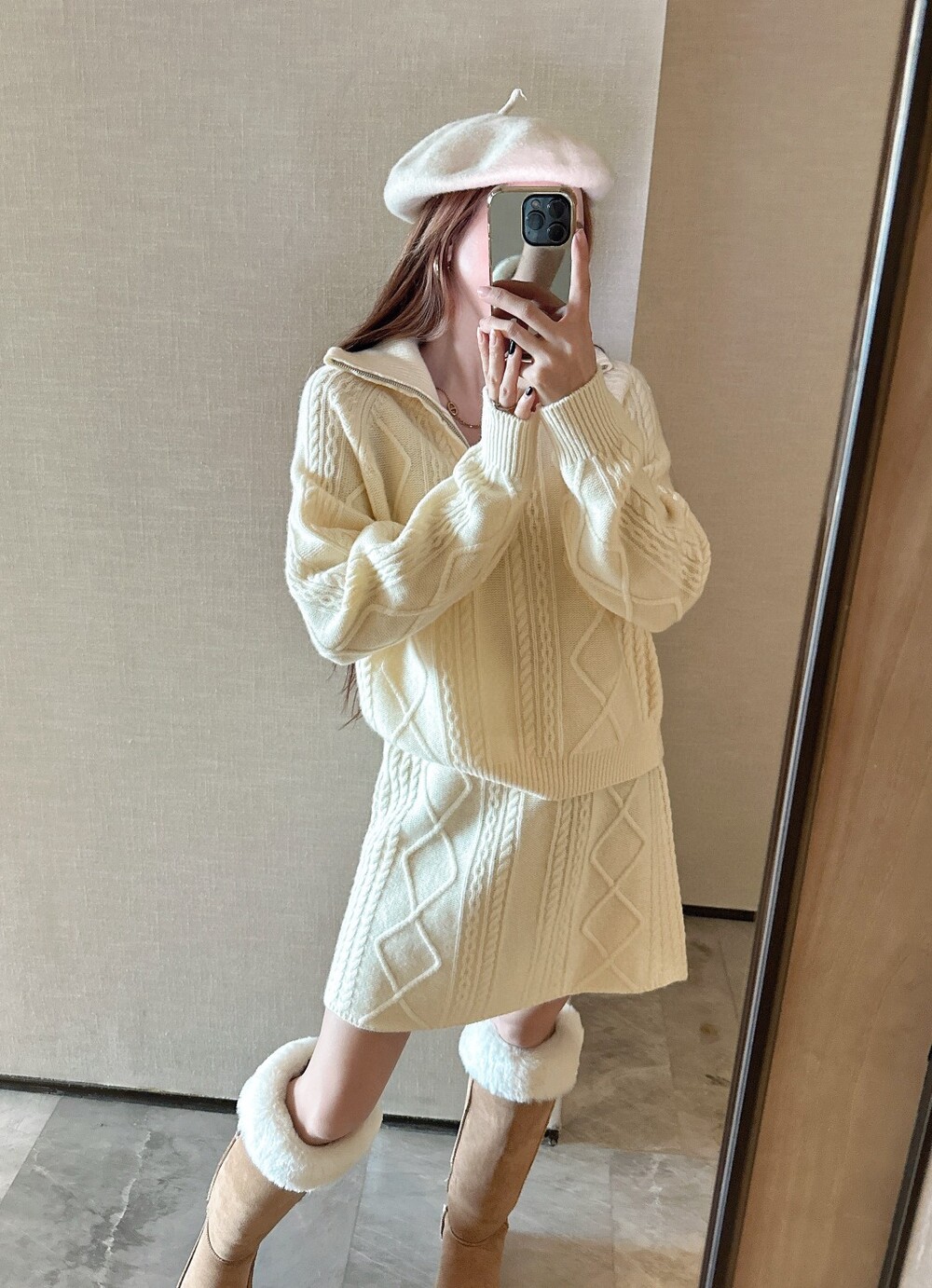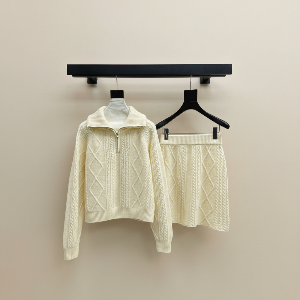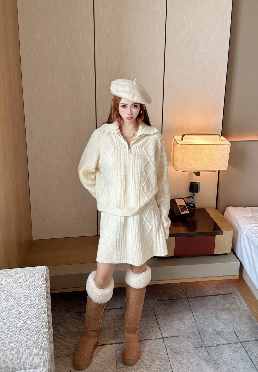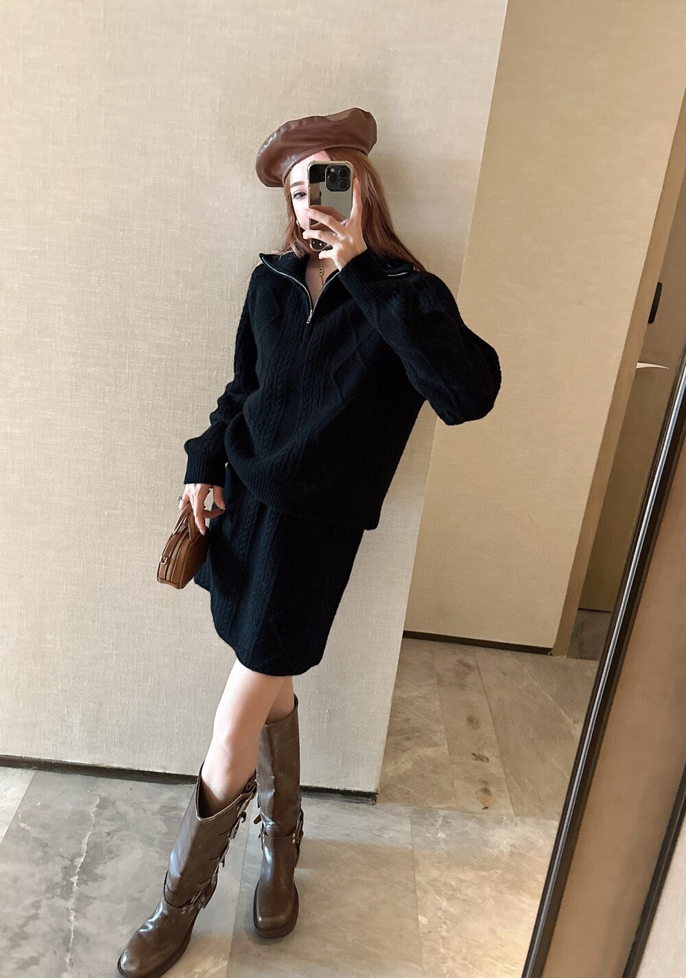 반오픈 지퍼 니트에 케이블짜임 A라인 스커트 구성이라